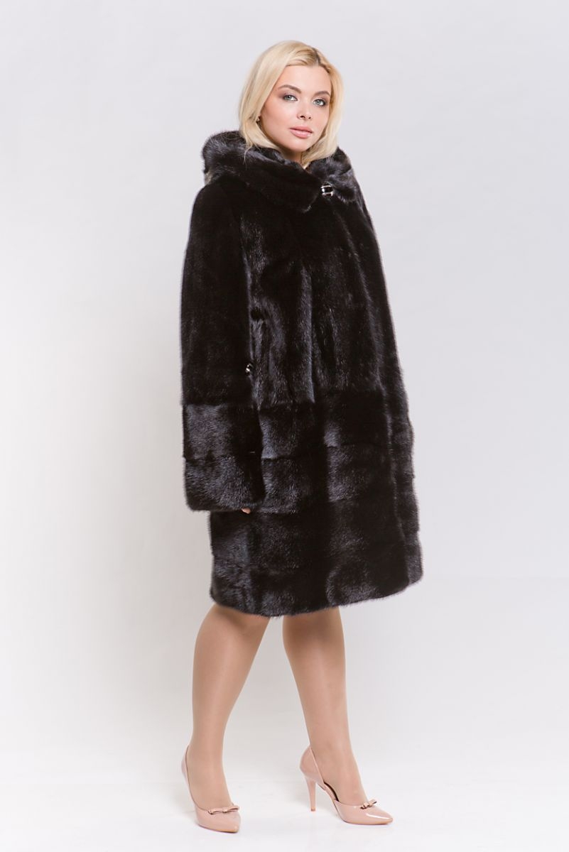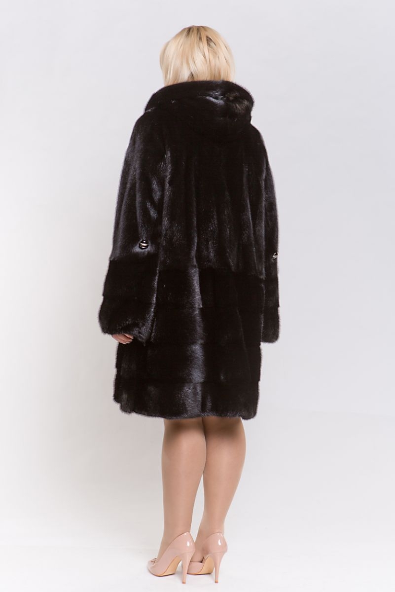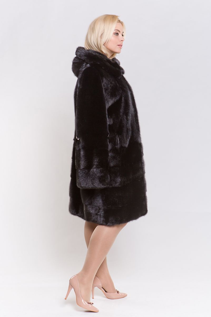 Женское полупальто из норки с капюшоном. Верх изделия выполнен в технике «роспуск». Низ модели оформлен в виде поперечной выкладки пластин. Рукав шубки можно укоротить. Длина изделия составляет 100 см.