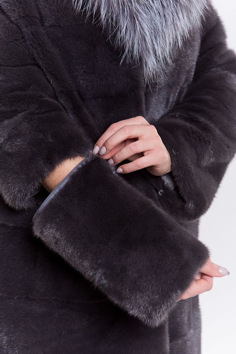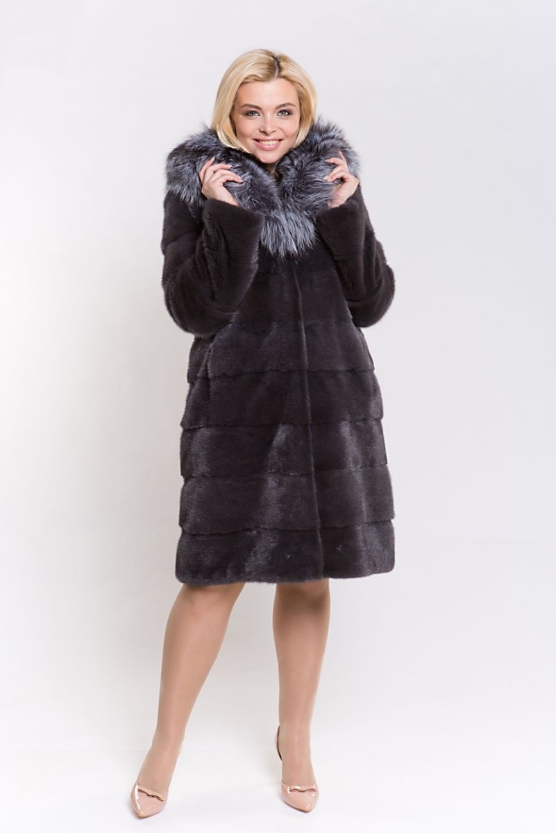 Полупальто из меха норки. Капюшон изделия комбинирован мехом чернобурой лисы. Крой модели поперечная выкладка пластин. На талии шубка оснащена регулирующей утяжкой. Рукава и низ модели отстегиваются и шубка трансформируется в миниатюрную курточку. Длина изделия 100 см. Модель выглядит эффектно благодаря шикарной лисе, добавляющей нотки шика и гламура!
