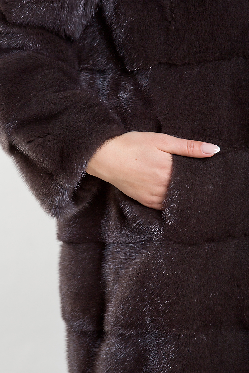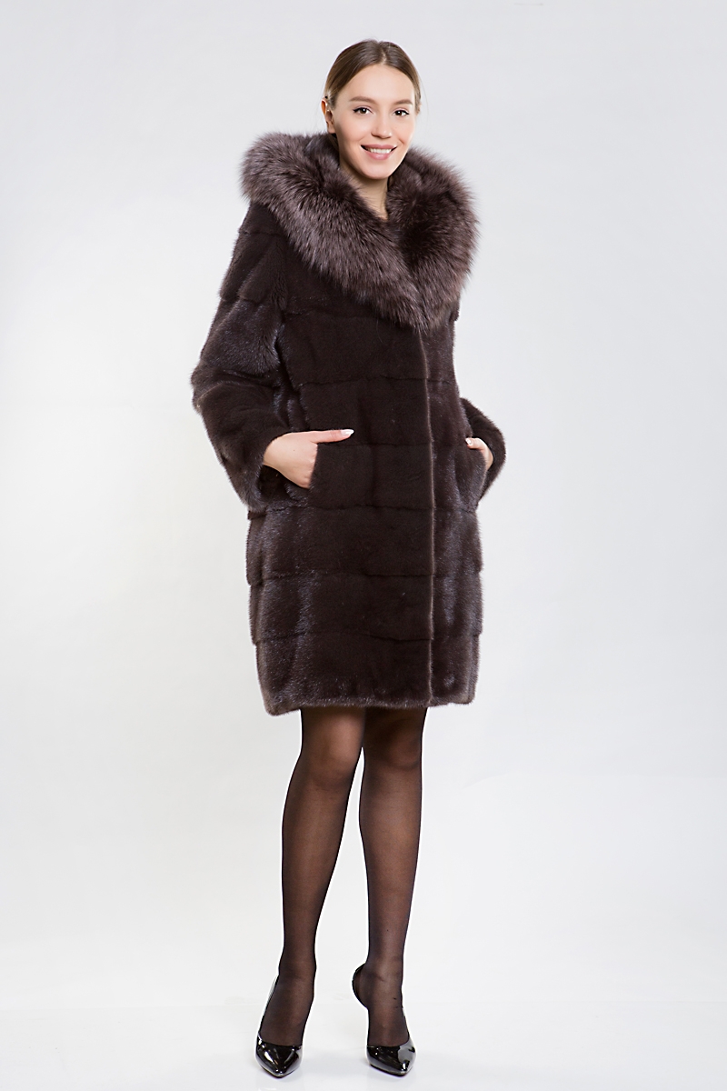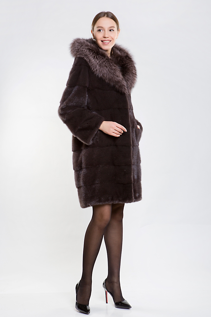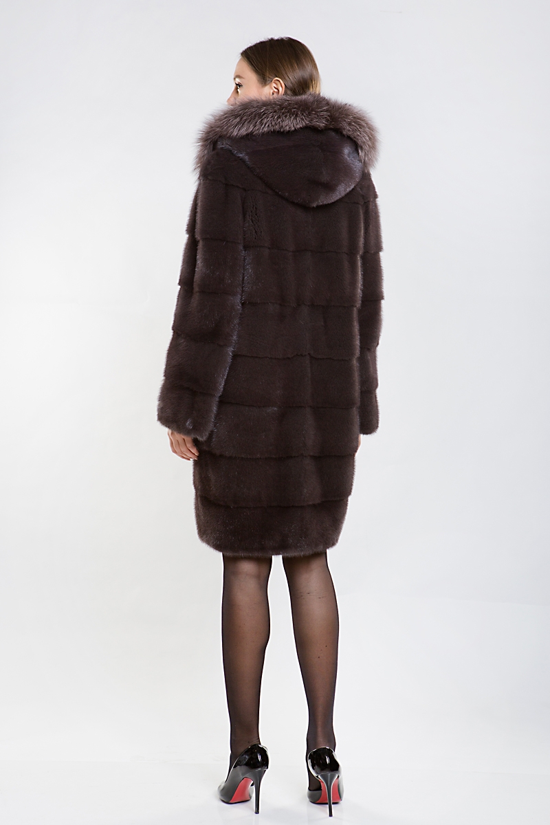 Полупальто из меха норки. Шикарный капюшон модели выполнен из меха лисы, тонированный под цвет самого изделия. Крой модели поперечная выкладка пластин. Длина шубки 100 см. Рукава изделия трансформируются в более укороченные, благодаря этому шубку можно удачно сочетать с длинными перчатками или с митенками.