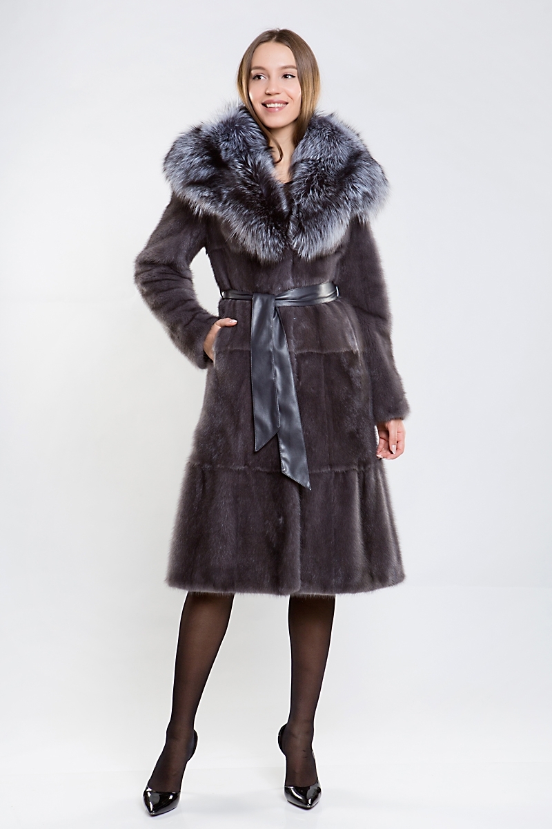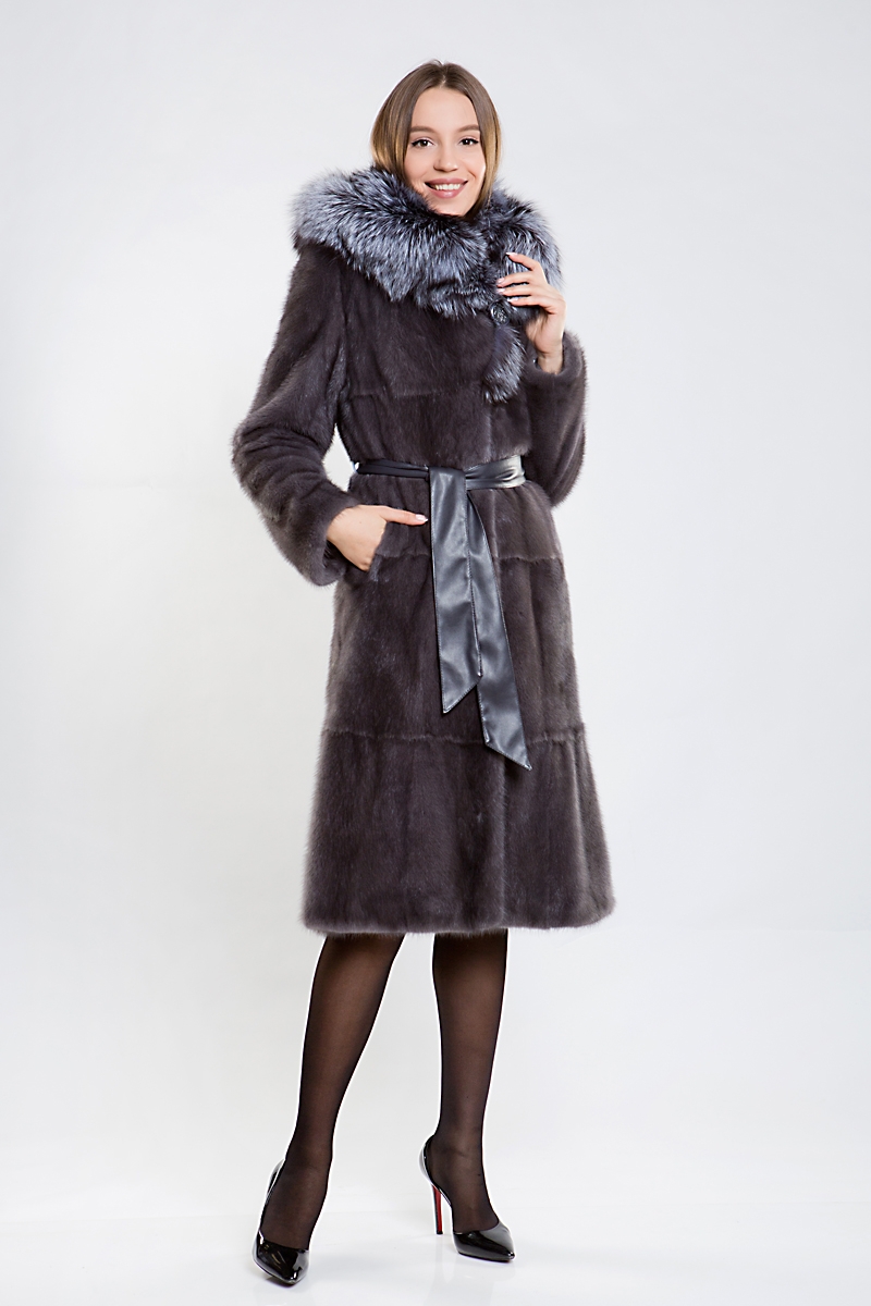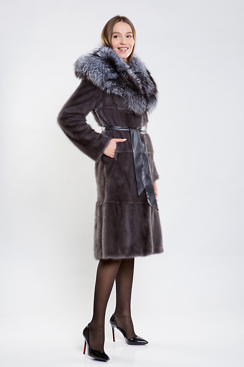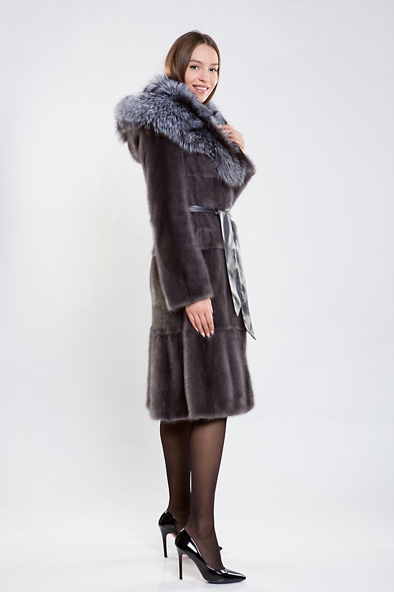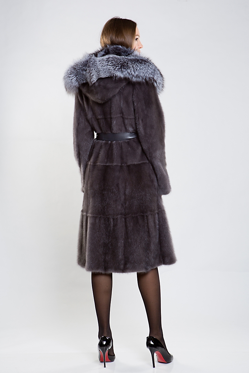 Полупальто из меха норки. Капюшон изделия комбинирован мехом чернобурой лисы. Крой модели пластины с дополнением роспуска. На талии и на рукавах шубки регулирующая утяжка. Низ изделия декорирован слегка заметной оборкой. Длина модели 110 см. Эта шубка выглядит эффектно, а шикарная лиса добавляет нотки шика и гламура! Создайте новый, комфортный и модный зимний образ!