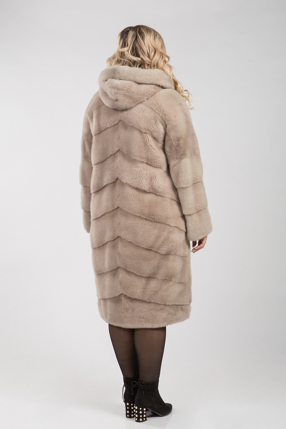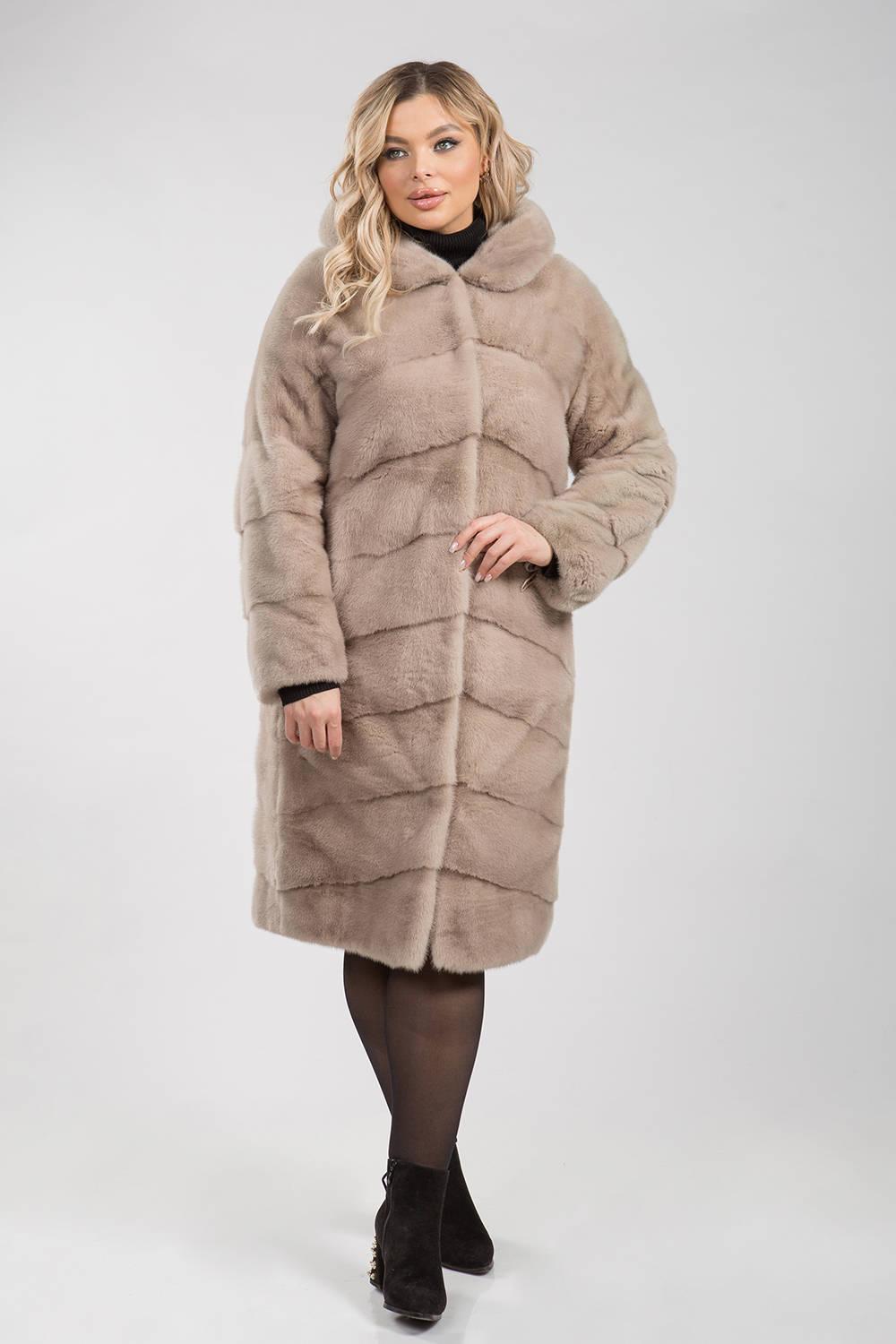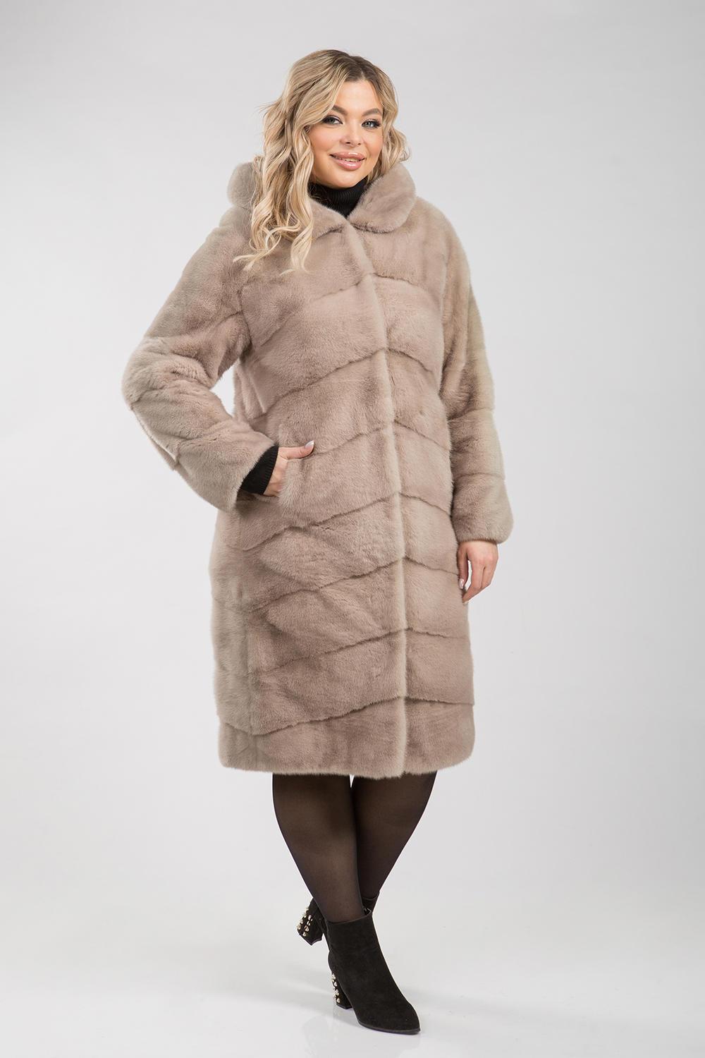 Полупальто из меха норки с капюшоном. Крой изделия диагональная выкладка пластин. На рукавах модели есть регулирующие утяжки. Длина изделия 110 см. Такая шубка в светлых тонах циркона является замечательным вариантом для тех, кто не хочет хандрить в пасмурные морозные дни, а предпочитает радовать себя привлекательными луками, поднимающими настроение! Тем более светлая шубка всегда освежает и омолаживает образ!