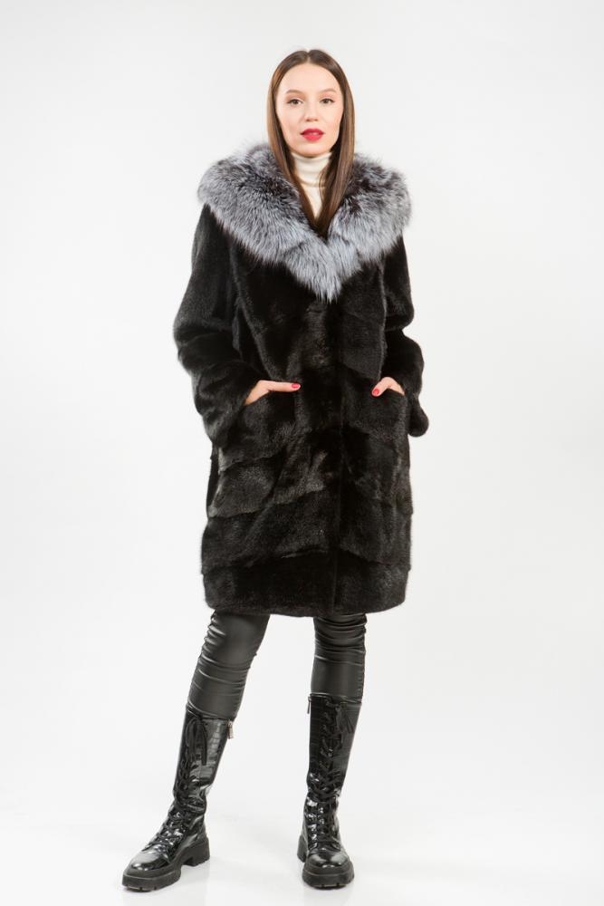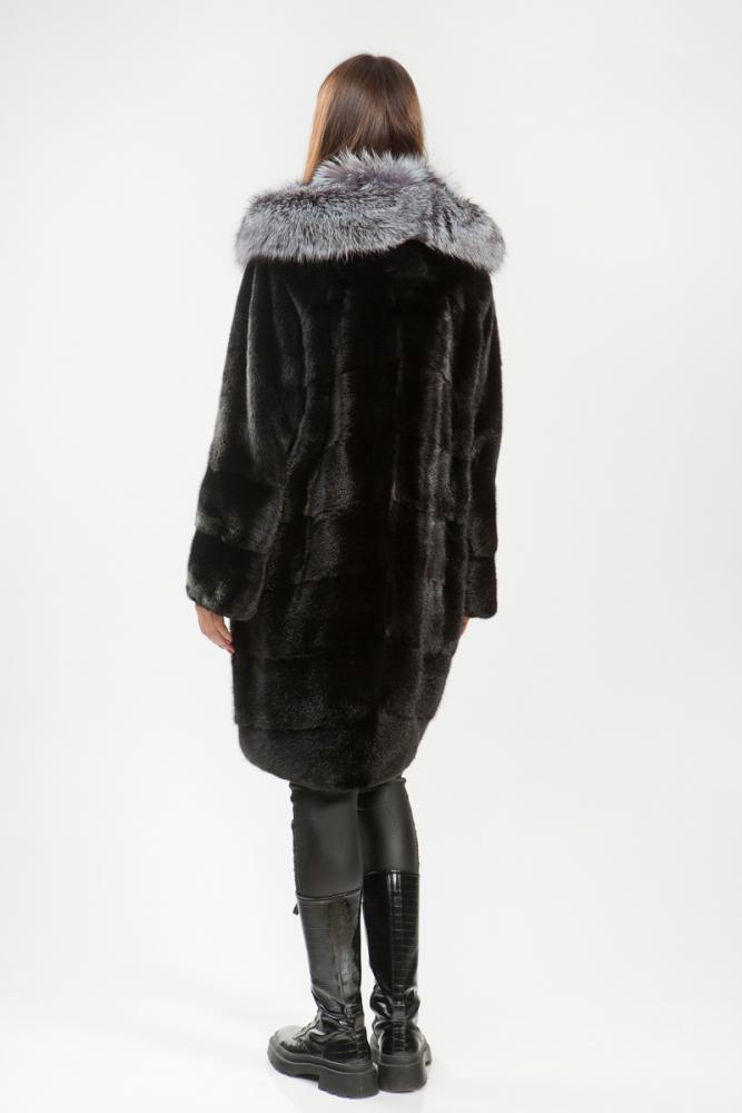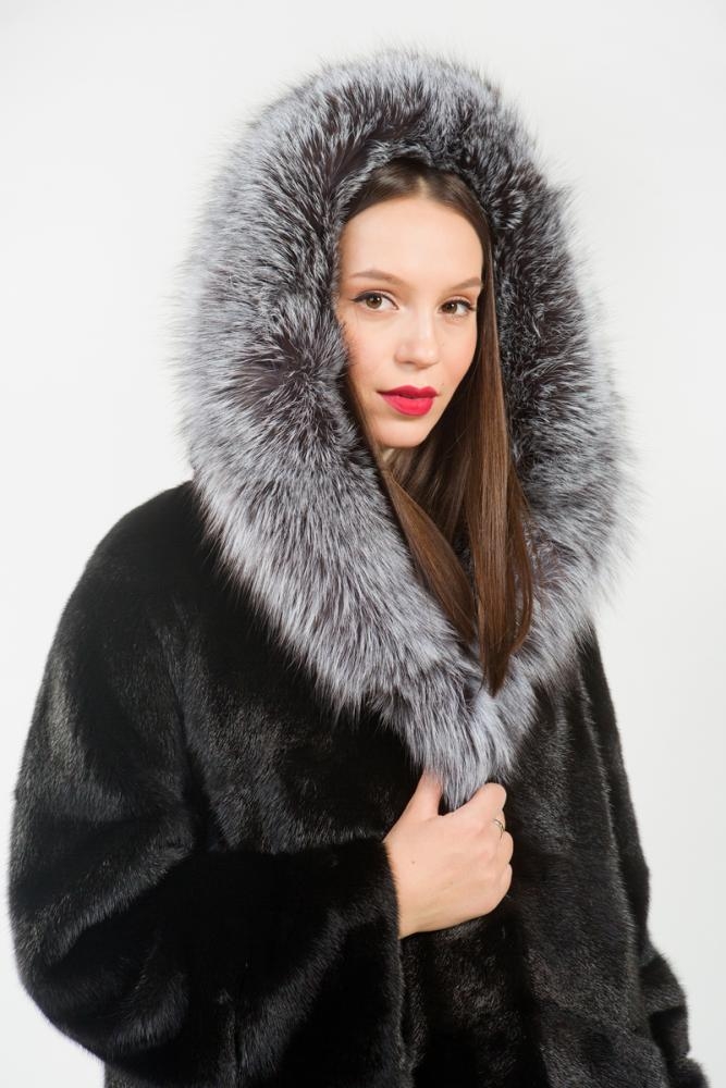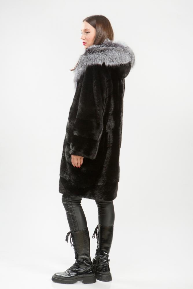Полупальто из меха норки. Капюшон модели декорирован мехом чернобурой лисы. Крой изделия диагональная выкладка пластин. Внутри на талии, на рукавах и по низу модели имеются регулирующие утяжки. Длина изделия 100 см. Рукава шубки трансформируются в более укороченные. Удобное лекало мехового пальто обеспечит максимальный комфорт, а выразительный оттенок черного благородного меха гарантирует образу безупречную гармонию!