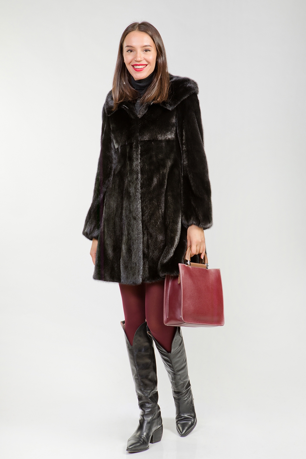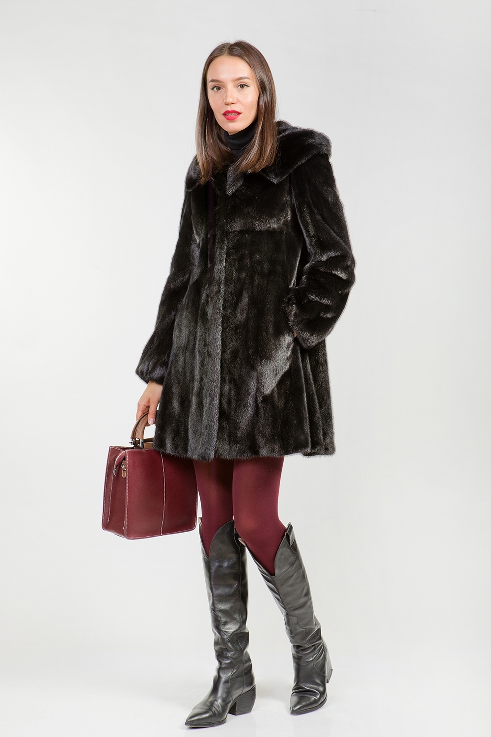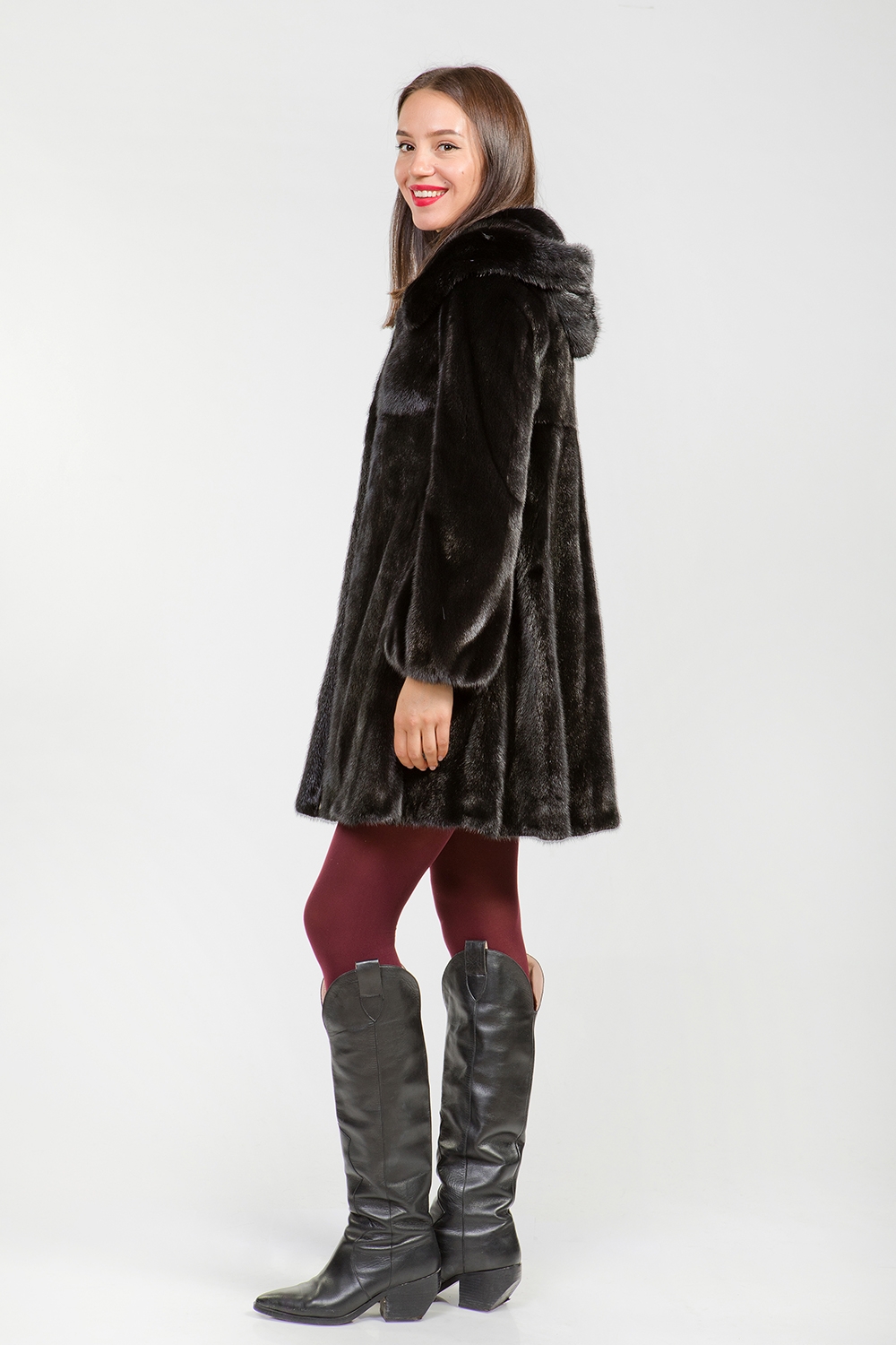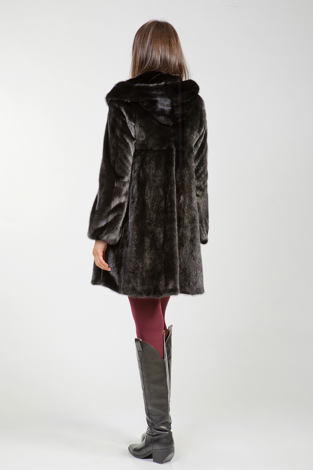 Полупальто из меха норки с капюшоном. Крой изделия роспуск с добавлением пластин. Модель оснащена утяжкой в зоне талии, позволяющая подчеркнуть стройность фигуры. Длина изделия 90 см. Благородный черный цвет меха предоставляет неограниченные возможности для любительниц экспериментов!
