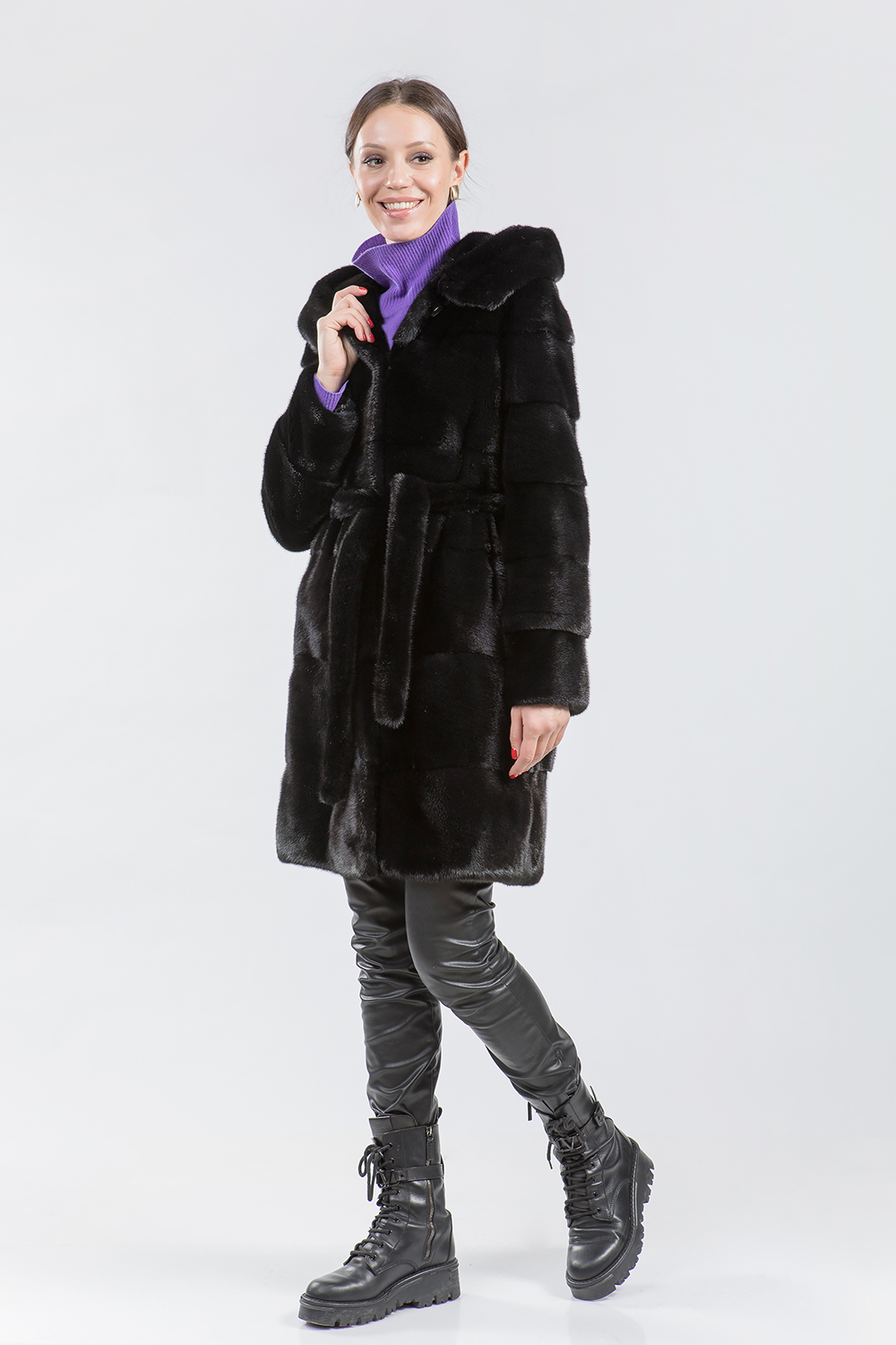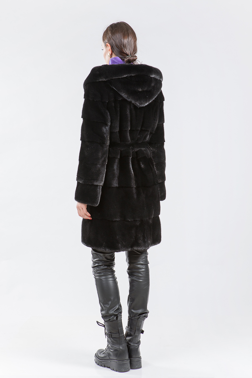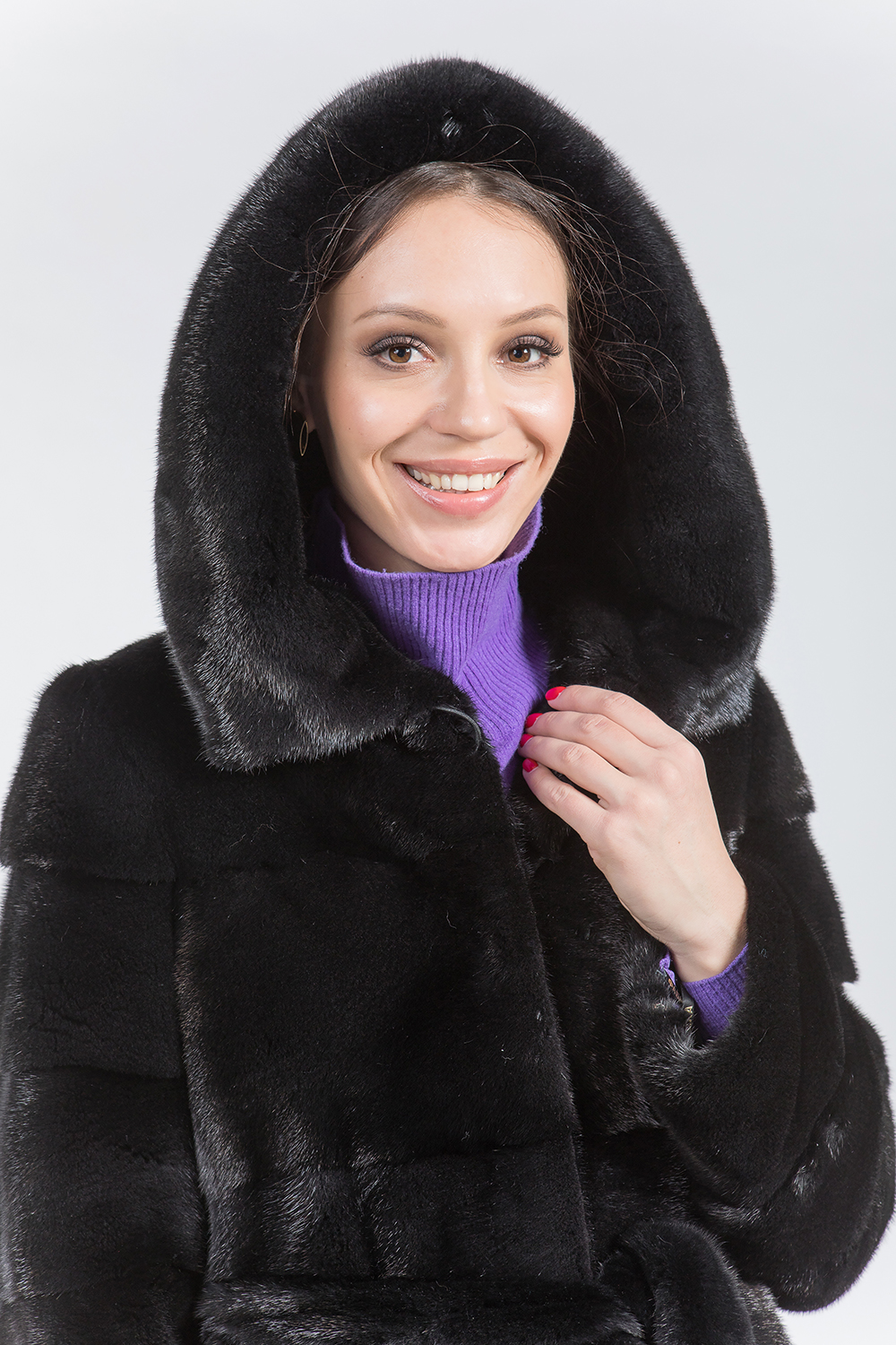 Полупальто из меха норки с капюшоном. Изделие имеет необычный крой, который заключается в поперечной выкладке пластин. Длина шубки составляет 90 см. Особенность модели — возможность отстёгивать рукава и низ, что превращает шубку в миниатюрную и изящную курточку.