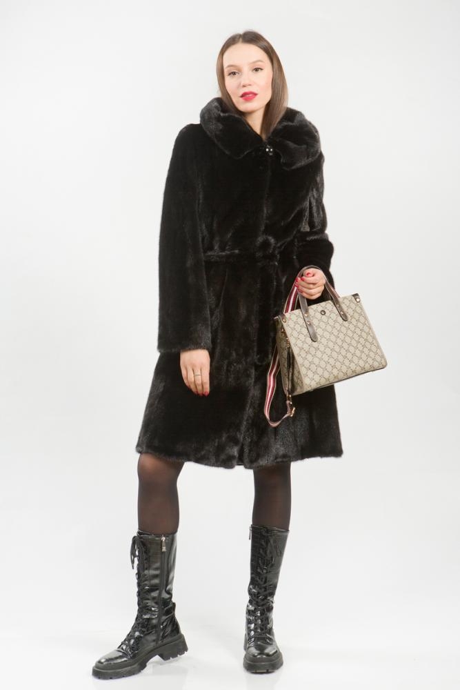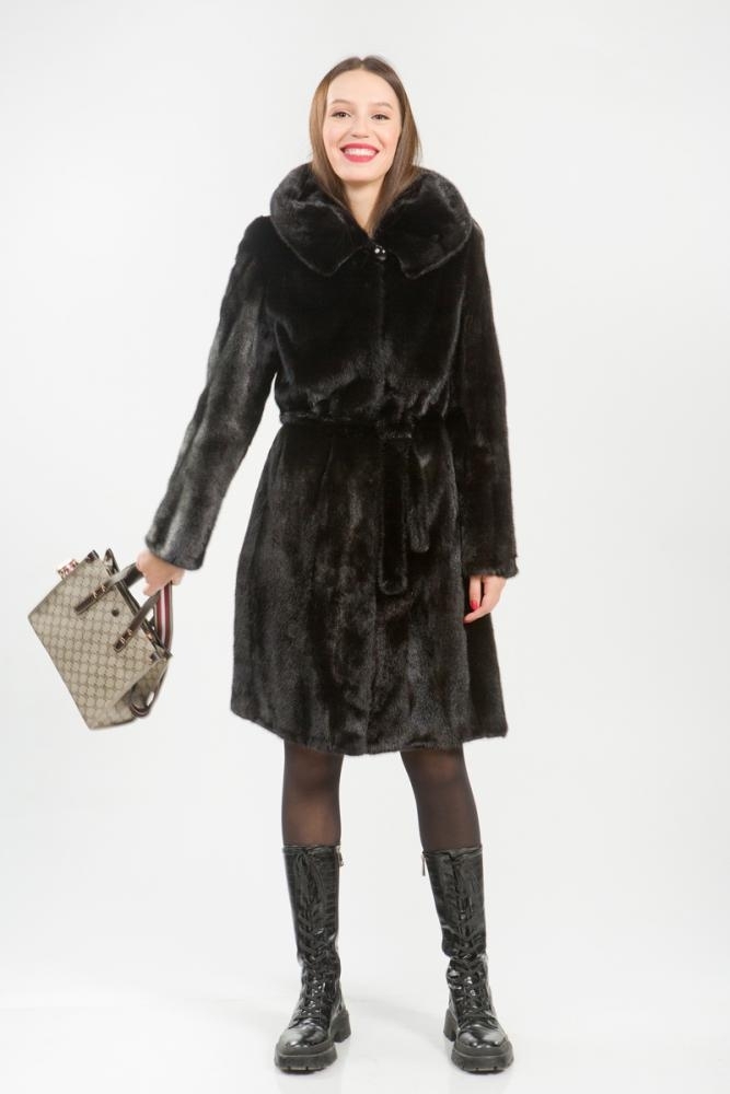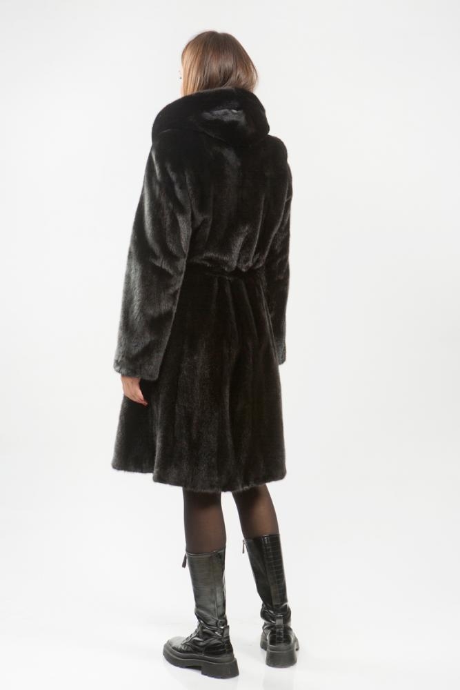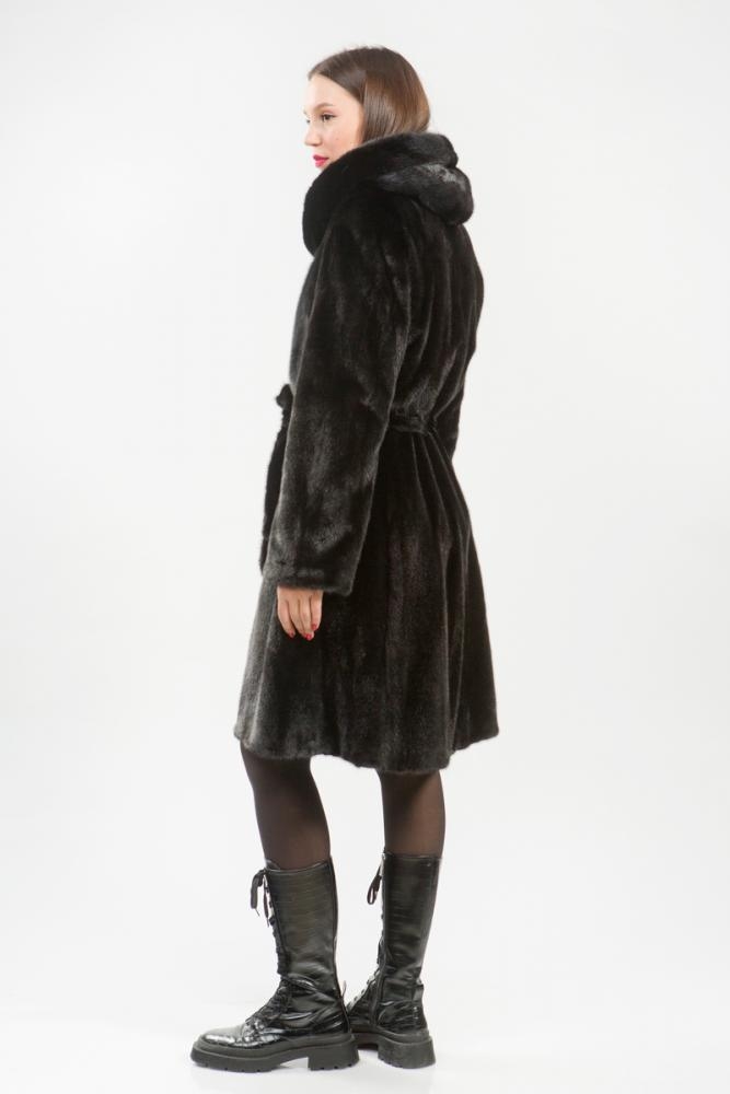 Полупальто из норкового меха с капюшоном. Модель выполнена в технике роспуска с добавлением пластин. Рукава оснащены регулируемыми утяжками. В комплекте пояс из того же норкового меха. Длина изделия составляет 100 сантиметров. Эта молодежная модель очаровывает своей изысканностью. К низу полупальто слегка расширяется, образуя юбочку, а сзади формируются красивые фалды. Комфортное лекало обеспечивает удобство носки, а благородный черный цвет меха придает образу элегантность и статусность.