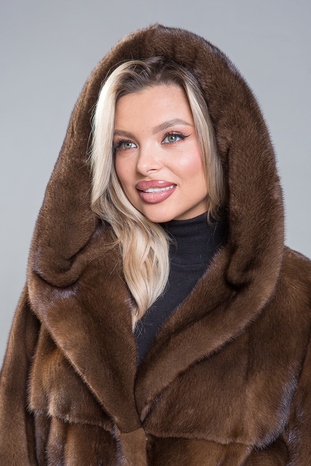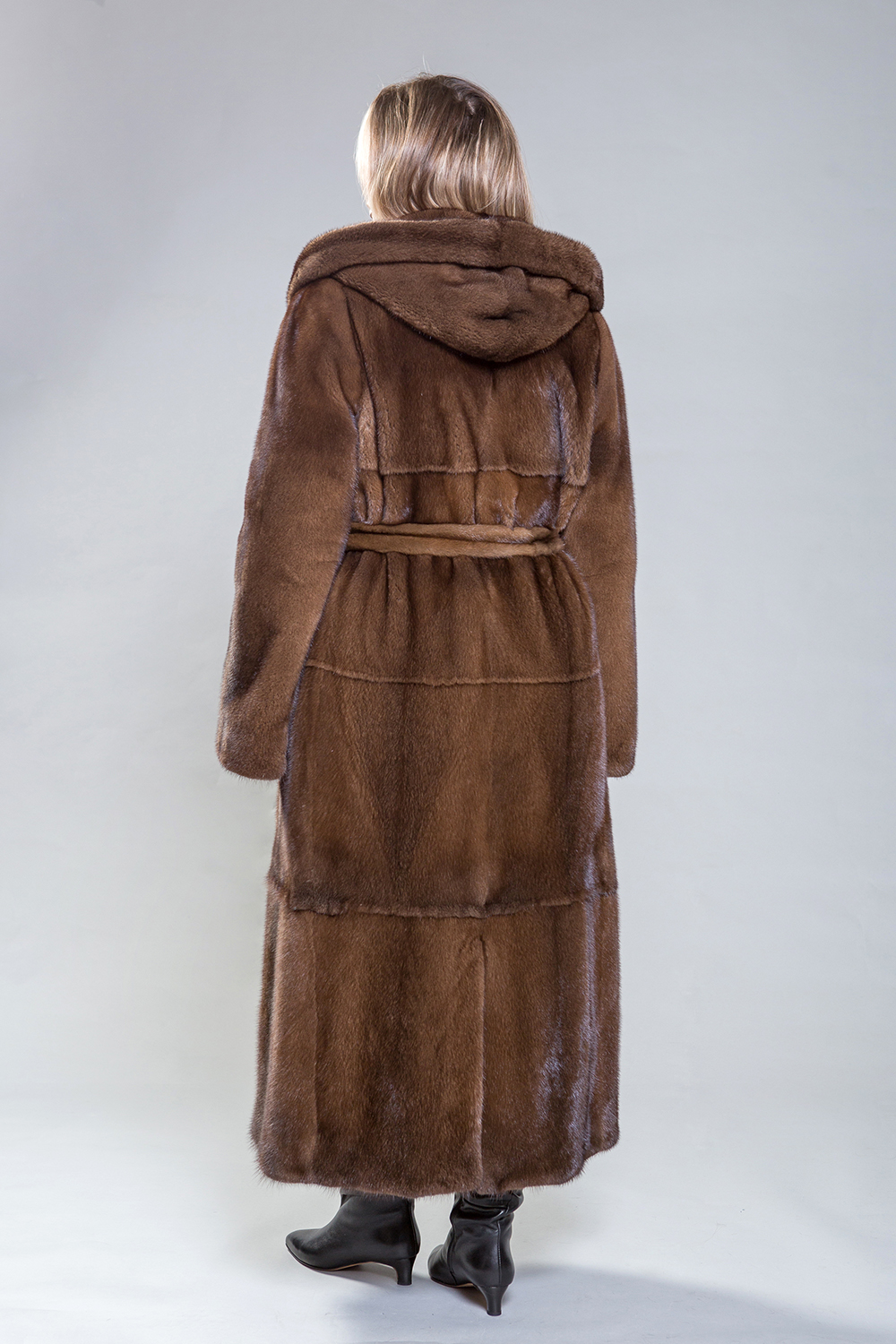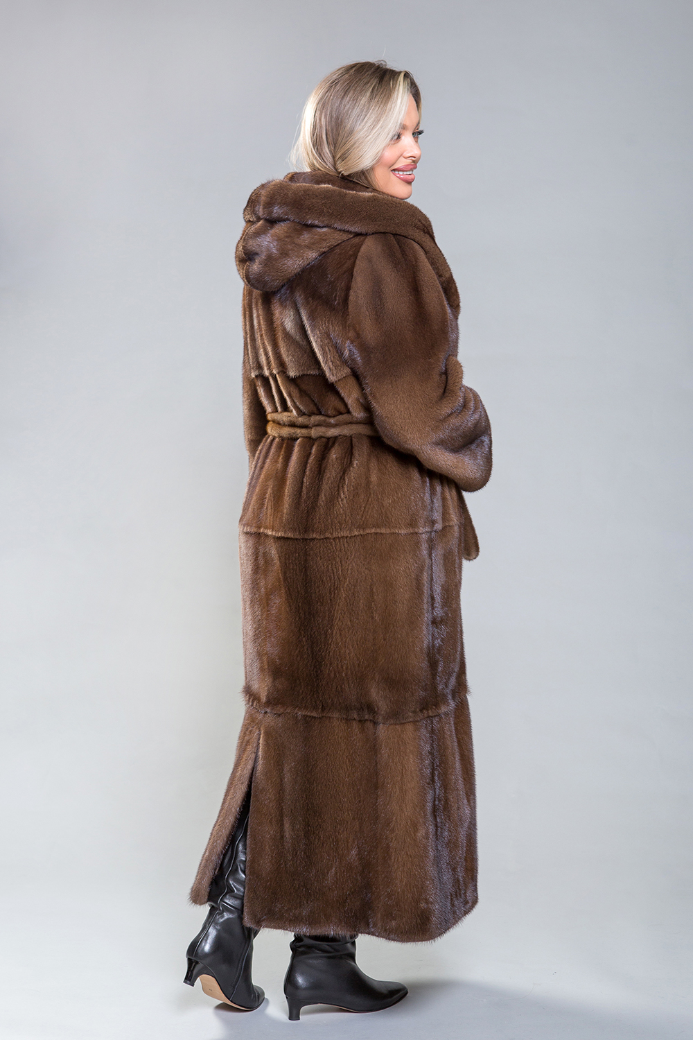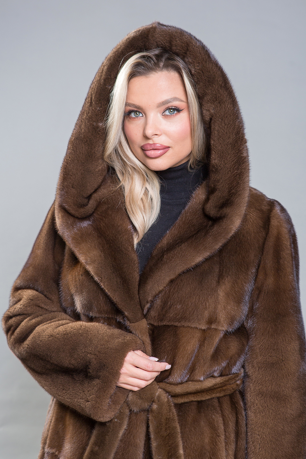 Норковое пальто с капюшоном представляет собой утончённый и роскошный элемент верхней одежды. Его крой выполнен из пластин с элементами роспуска, что придаёт изделию особую текстуру. На рукавах и талии имеются регулируемые утяжки, а сзади расположена элегантная шлица. В комплекте идёт пояс из норки, который подчёркивает изысканность наряда. Длина пальто составляет 130 см.