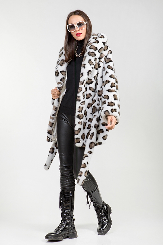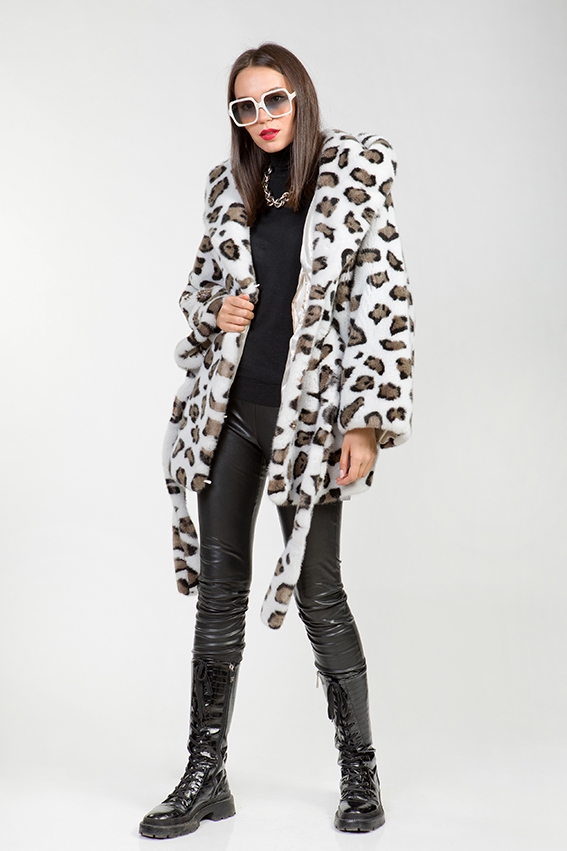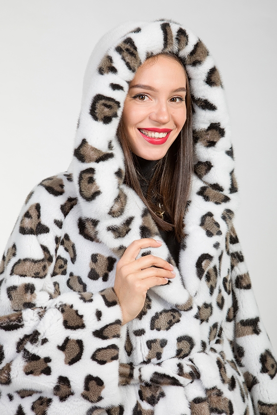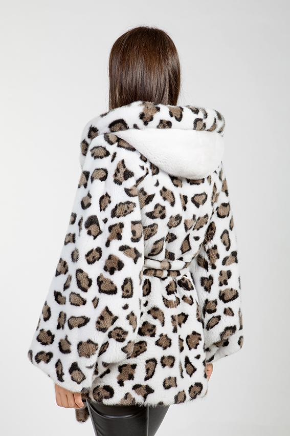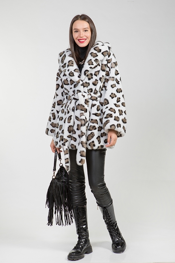 Куртка-пончо из меха норки с капюшоном. Крой изделия пластины с добавлением роспуска. Длина модели 80см. Фасон рукава свободный. Удобный капюшон курточки оснащен утяжками, что обеспечивает защиту от холода! Расцветка напоминающая снежного барса-как источник позитивных эмоций! Эта модель обеспечивает образу величие и престижность!