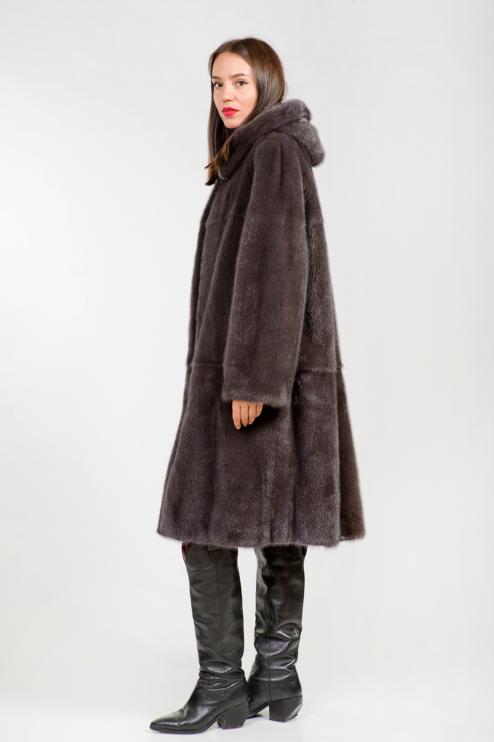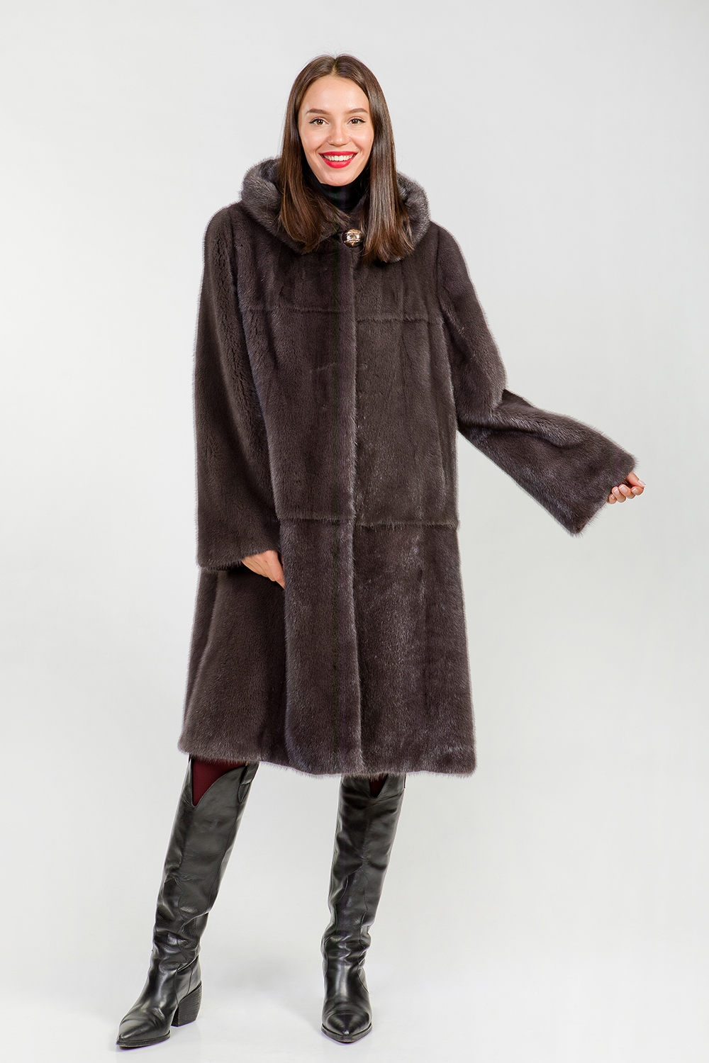 Полупальто из меха норки с капюшоном. Крой изделия пластины с добавлением роспуска. Модель оснащена регулирующими утяжками на рукавах и в зоне талии. Длина изделия 110 см. Шубка классического силуэта-универсальный вариант! Профессиональные стилисты считают такое меховое пальто безошибочным выбором и гарантируют элегантность!