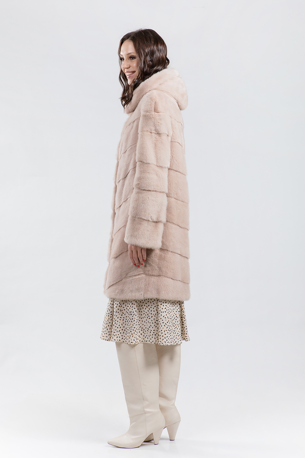 Полупальто из меха норки с капюшоном. Крой изделия диагональная выкладка пластин. На талии, рукавах и по низу модели есть регулирующие утяжки. Длина изделия 100 см. Такая шубка в светлых тонах миндаля является замечательным вариантом для тех, кто не хочет хандрить в пасмурные морозные дни, а предпочитает радовать себя привлекательными луками, поднимающими настроение! Тем более светлая шубка всегда освежает и омолаживает образ!