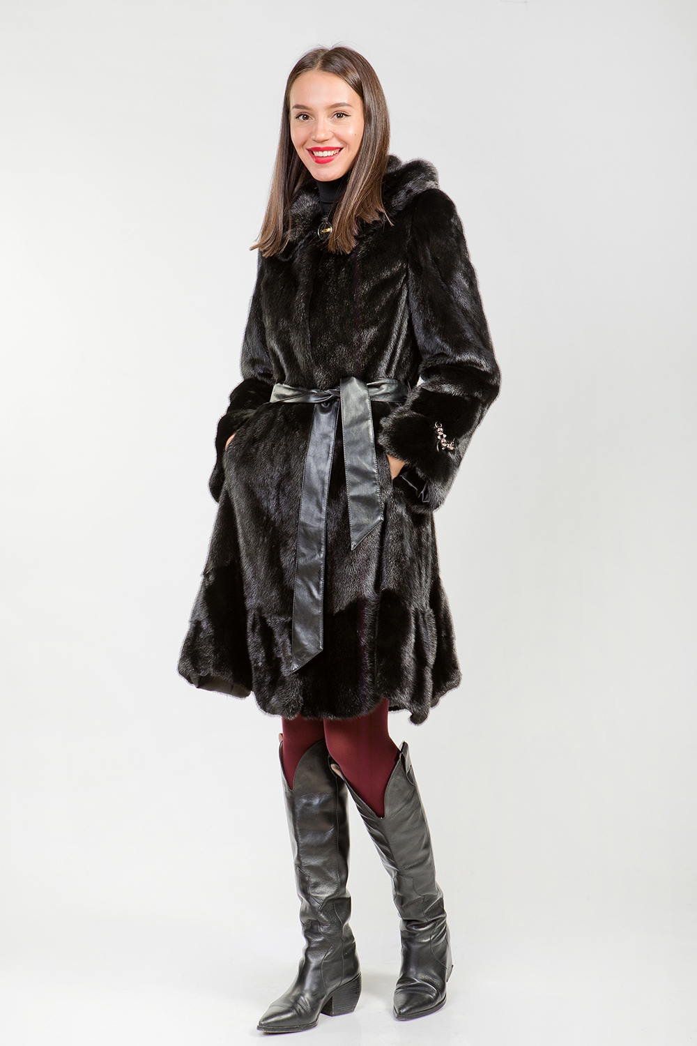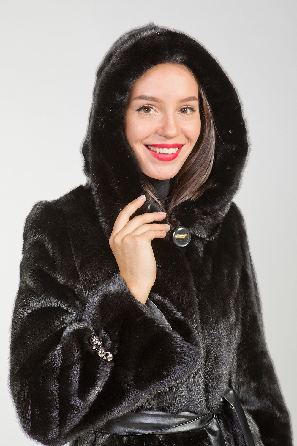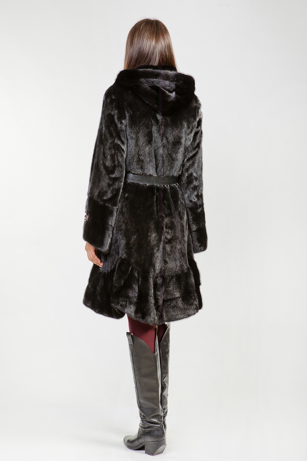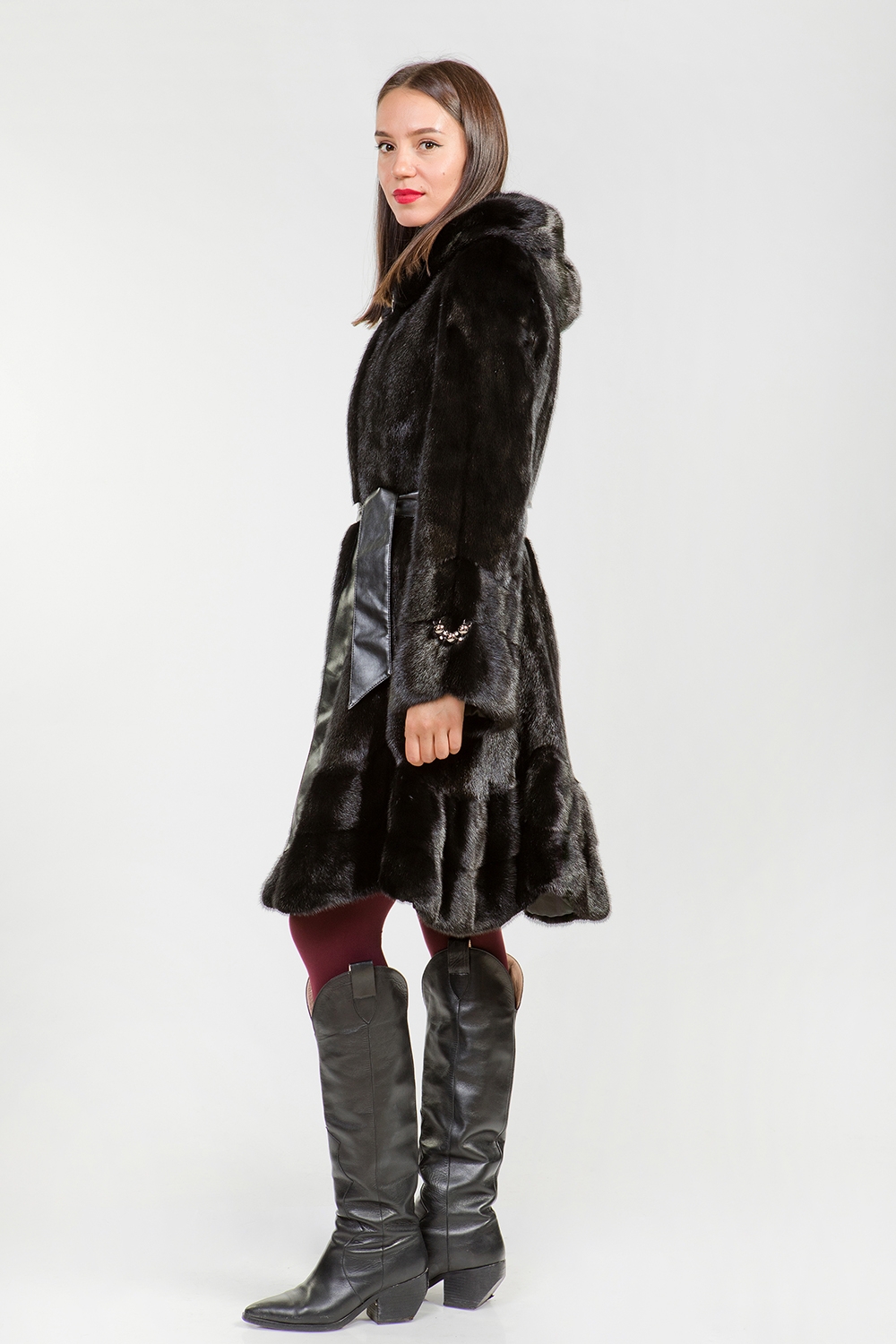 Полупальто из меха норки, дополненное капюшоном. Модель выполнена в технике роспуска с добавлением пластин. В талии предусмотрена утяжка, которая акцентирует внимание на стройности фигуры. Длина изделия составляет 105 см. Юбка-клеш и уютный капюшон придают модели задорный и кокетливый вид, идеально подходящий для создания образа юной леди.