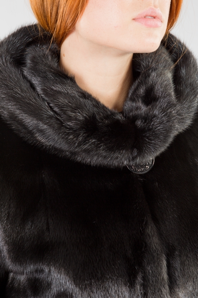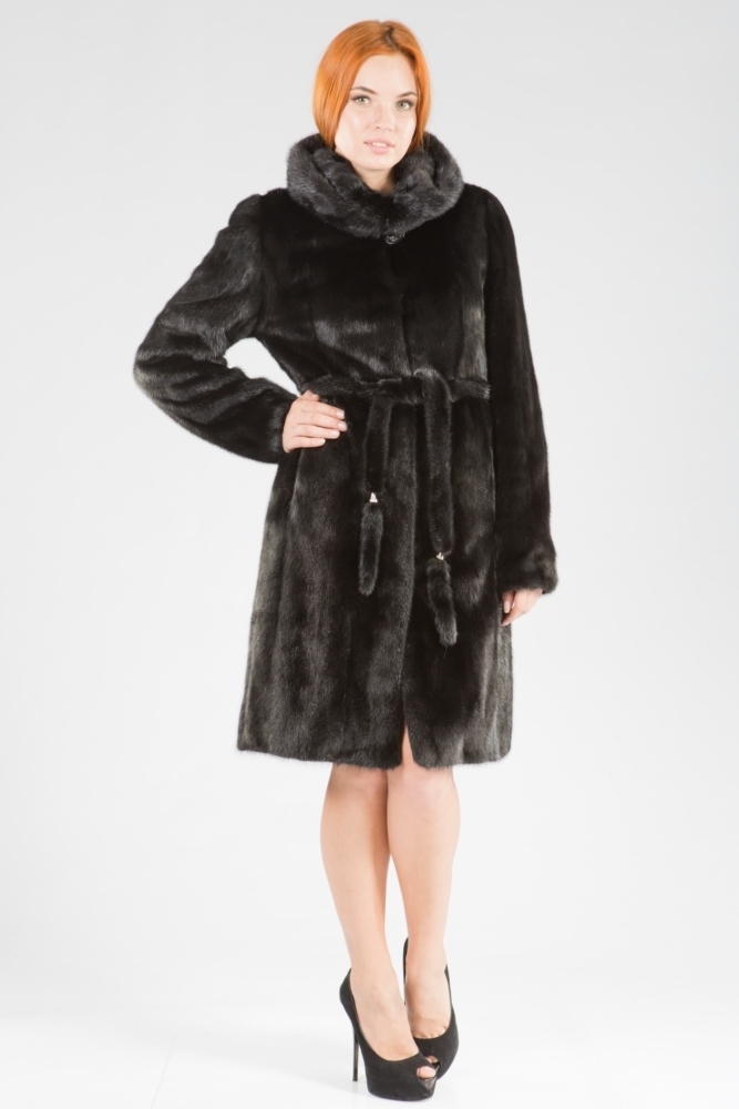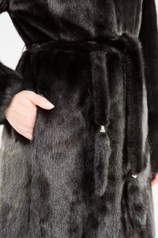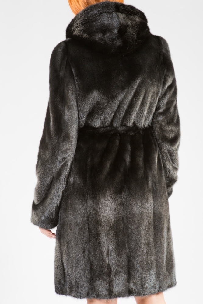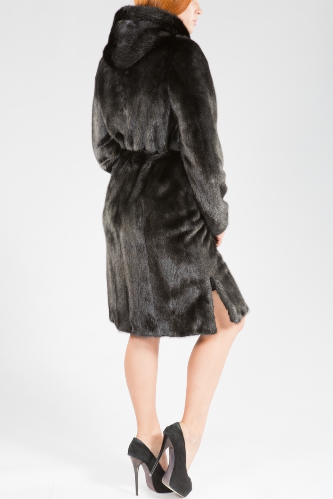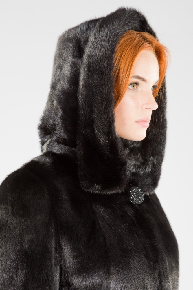 Полупальто из меха норки с капюшоном. Крой изделия пластины с добавлением роспуска. На рукавах модели есть регулирующие утяжки, а по бокам небольшие элегантные разрезы. Пояс из меха норки в комплекте. Благородный блеск черного меха гарантирует образу престижность и презентабельность!