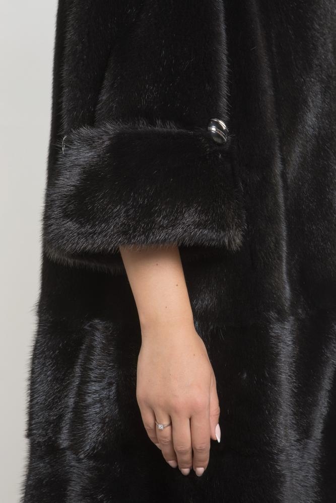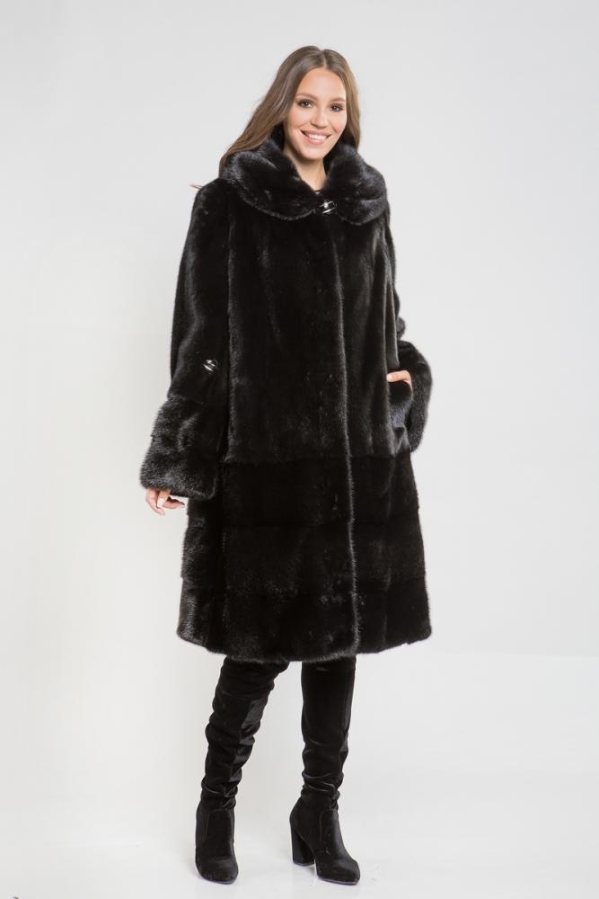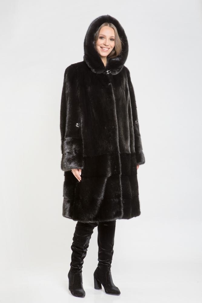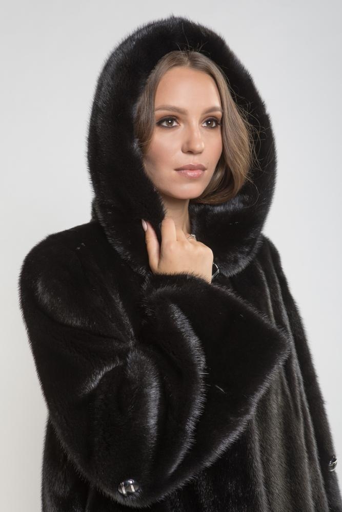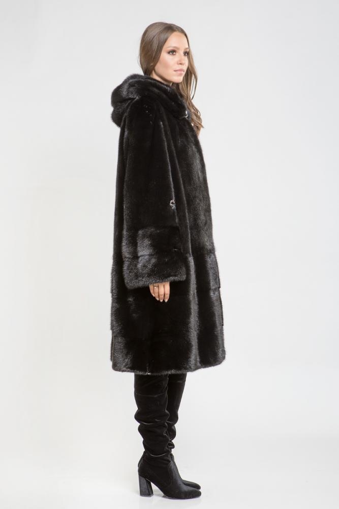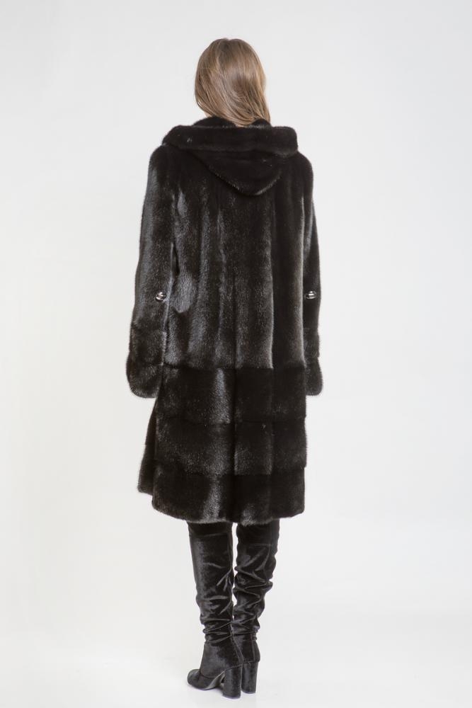 Полупальто, выполненное из меха норки, дополнено капюшоном. Нижняя часть модели выполнена в виде поперечной выкладки пластин. Рукава шубки можно укоротить, что позволяет сочетать её с длинными перчатками или митенками. Внутри и на рукавах изделия предусмотрены регулирующие утяжки, которые обеспечивают комфортную носку. Длина шубки составляет 110 см. Эта элегантная модель идеально подойдёт для ценителей строгого классического стиля.