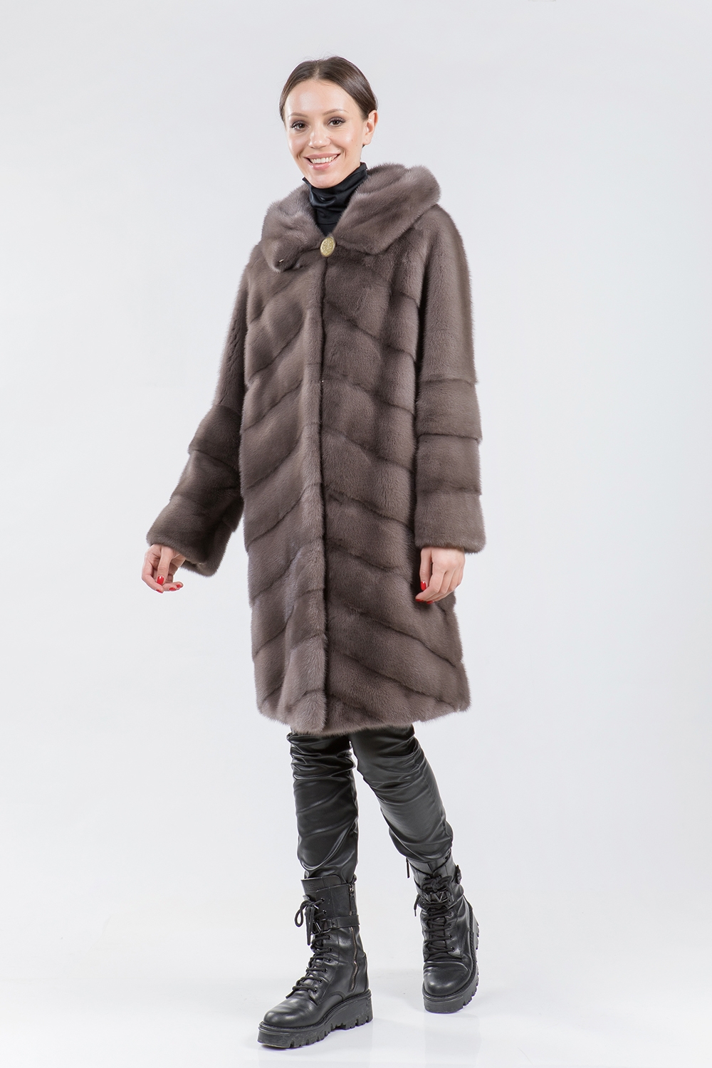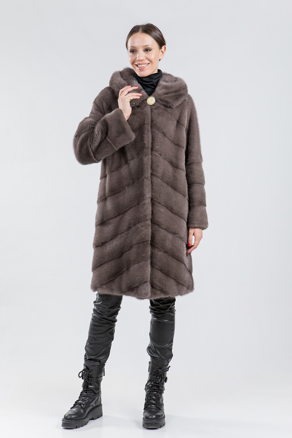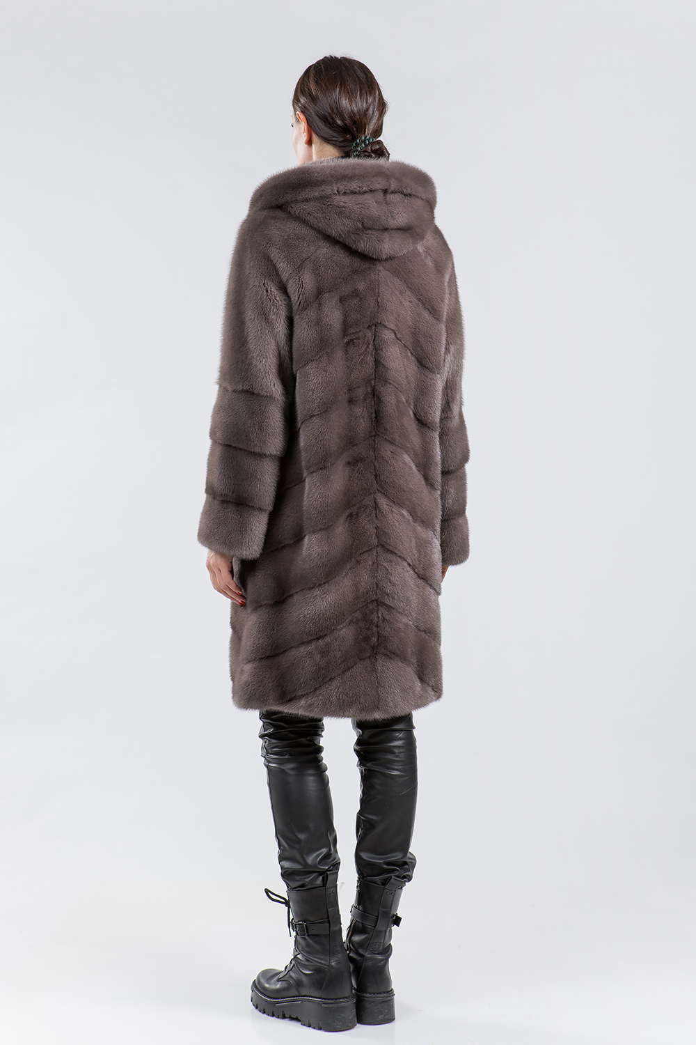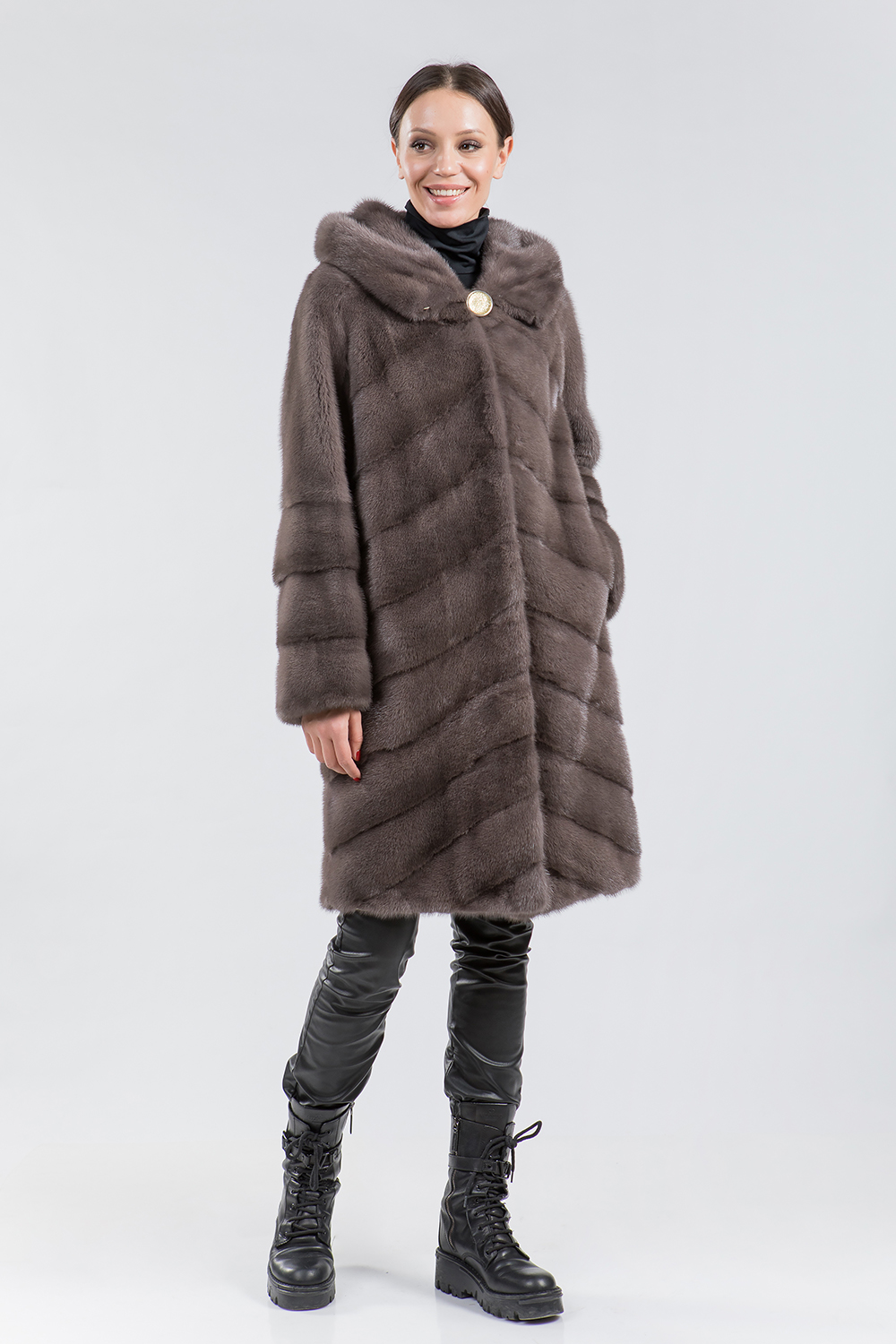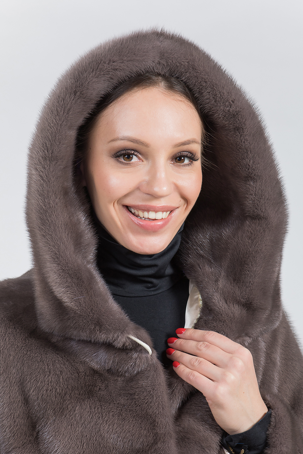 Полупальто из меха норки с капюшоном. Крой изделия диагональная выкладка пластин. Модель оснащена регулирующими утяжками на рукавах, по низу и в зоне талии. Рукава модели трансформируются в более укороченные. Длина изделия 100 см. Практичность шубки неоспорима. Если хочется выглядеть престижно, по-королевски роскошно, то натуральная норковая шуба является идеальным вариантом!