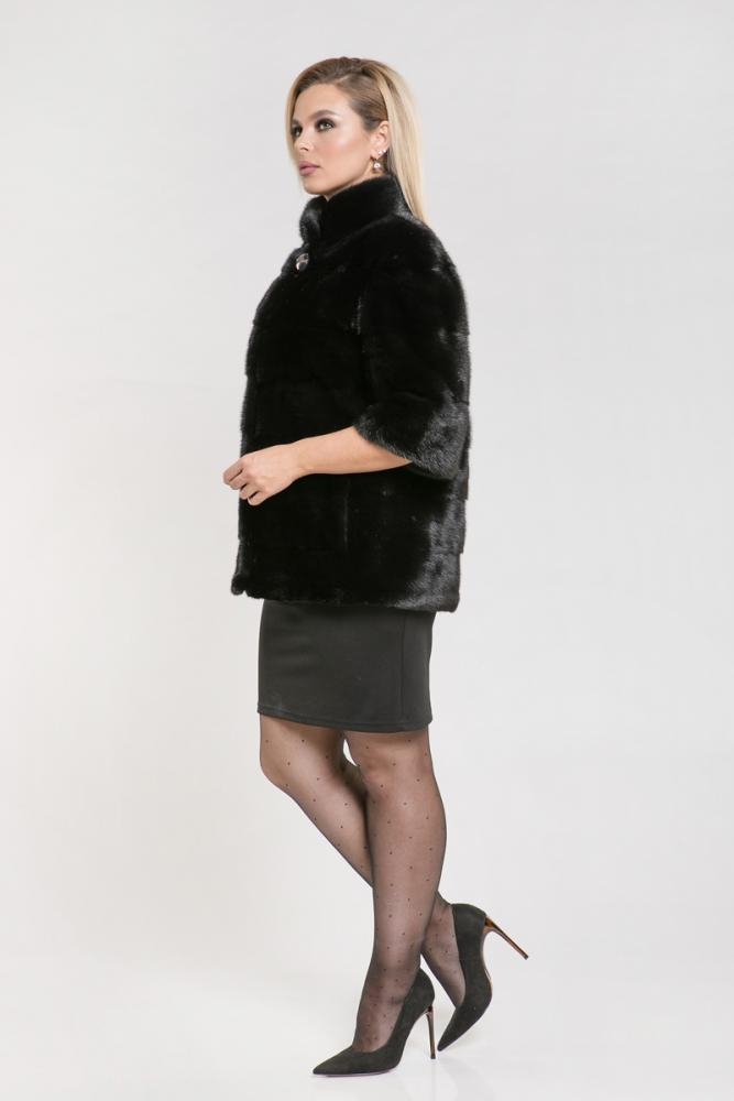 Полупальто из норки с воротником-стойкой. Модель выполнена в технике поперечной выкладки пластин. Особенность этой шубки — отстегивающиеся рукава и низ, что позволяет превратить её в миниатюрную курточку. Длина изделия составляет 90 см. Такая универсальная шубка станет прекрасным дополнением к любому образу!