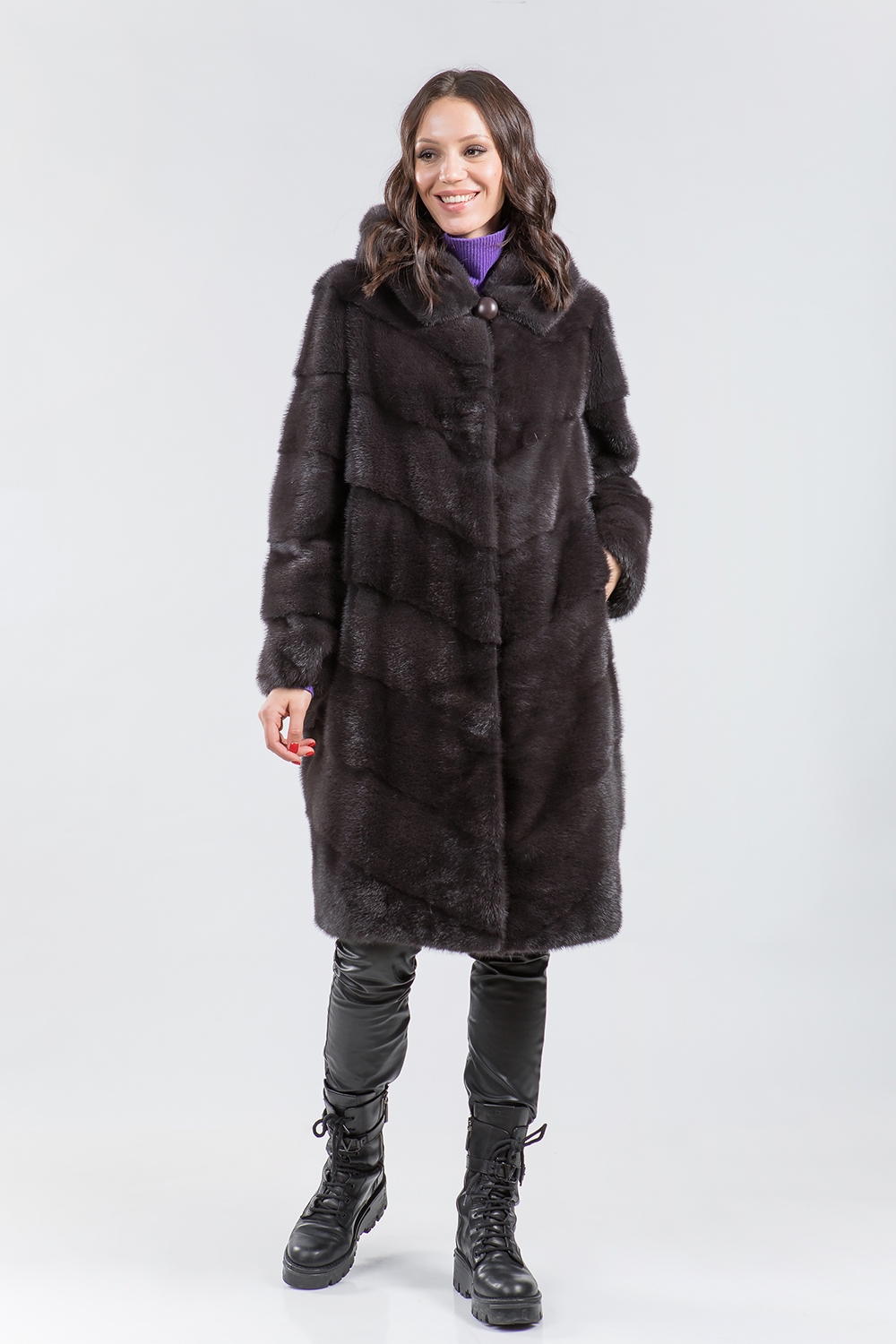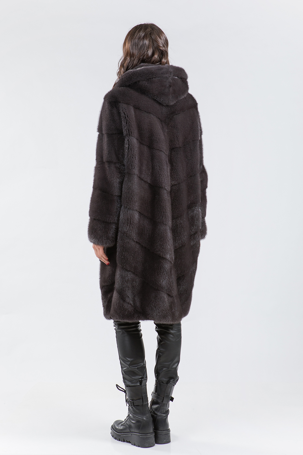 Полупальто из норки с капюшоном. Модель имеет диагональный крой пластин. На рукавах, по низу и в зоне талии предусмотрены регулирующие утяжки. К низу изделие слегка заужено, а рукава можно трансформировать в более короткие. Длина полупальто составляет 100 см. Это практичная и стильная вещь, которая подчеркнёт ваш статус и добавит роскоши в образ.