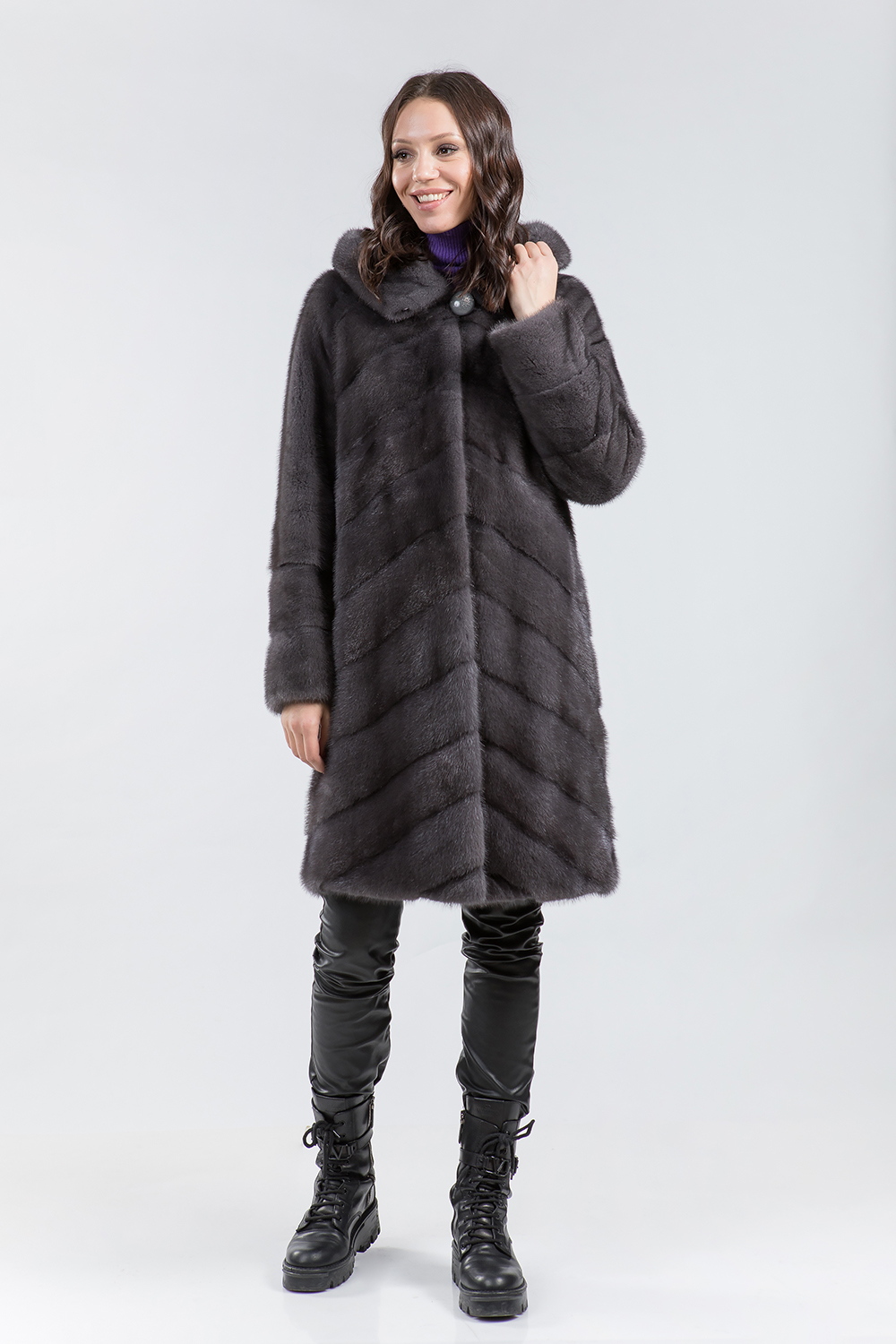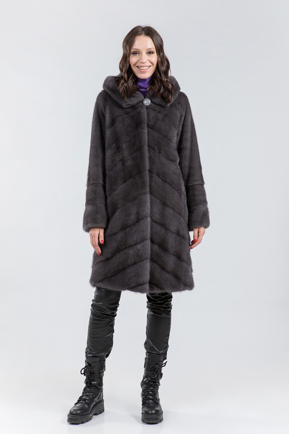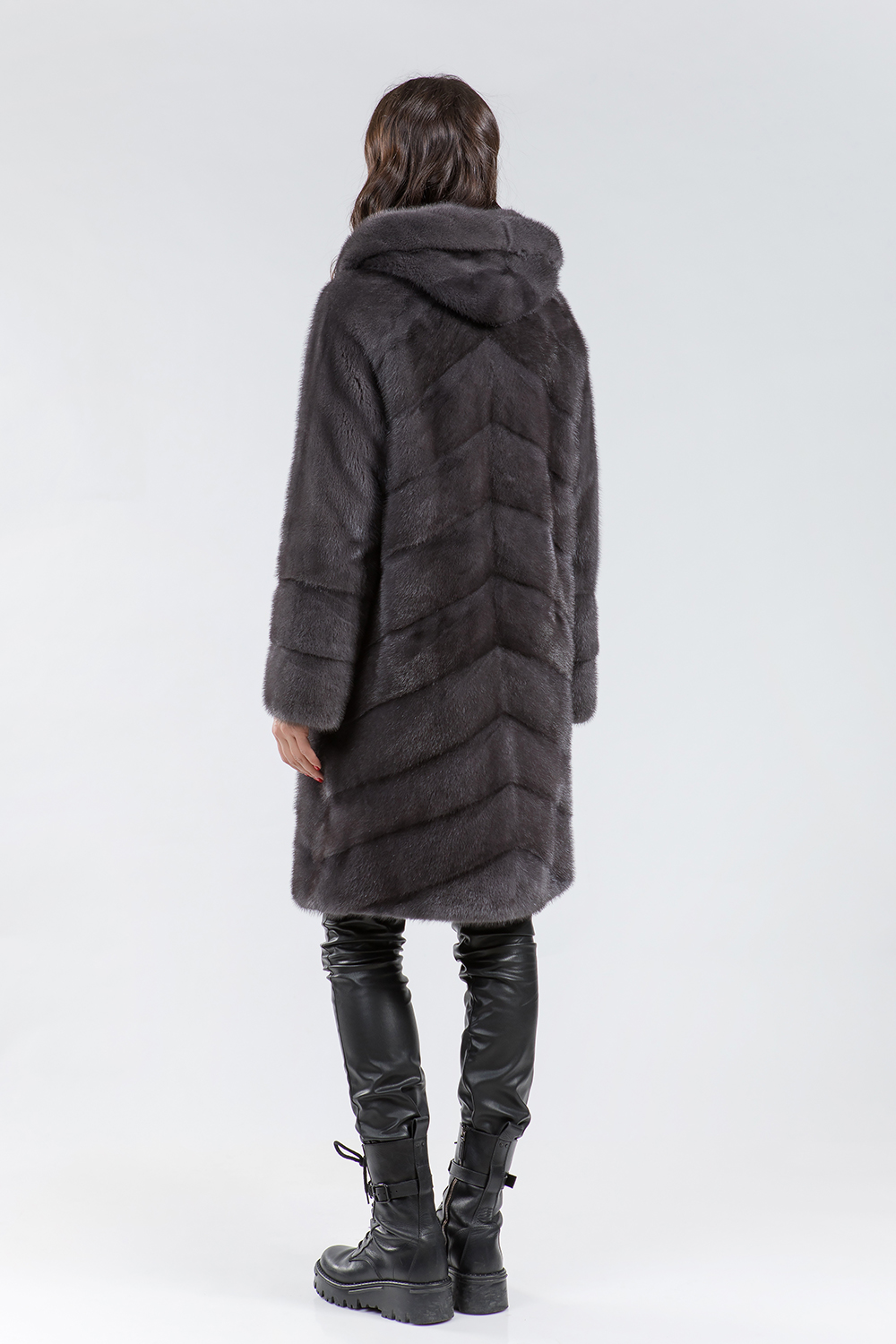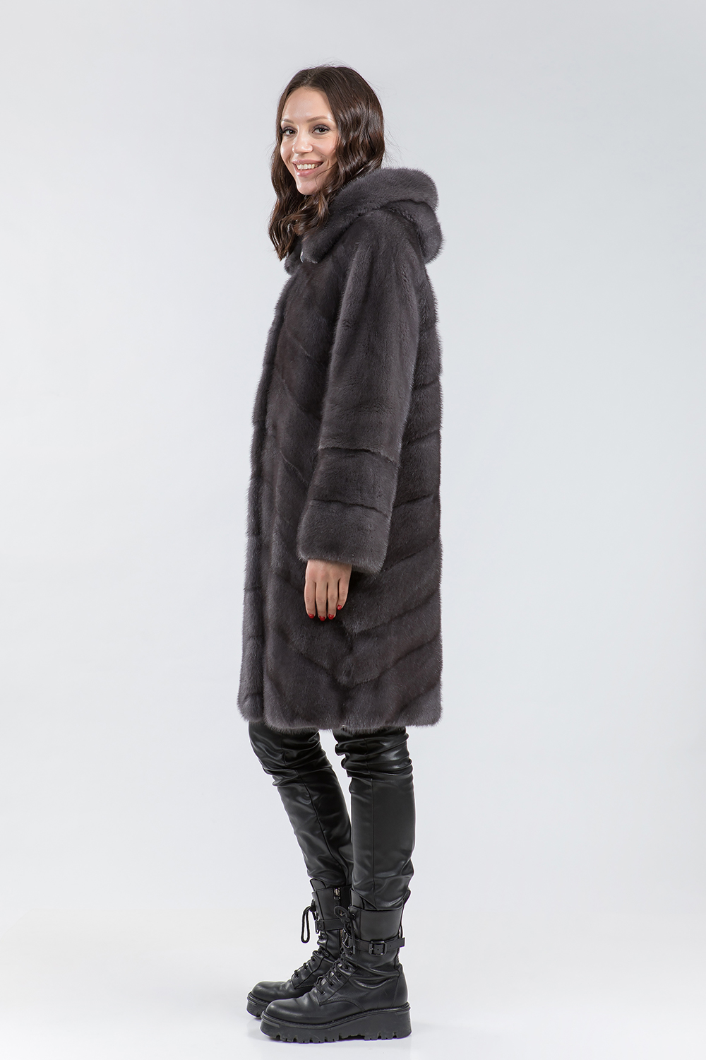 Полупальто из меха норки с капюшоном. Крой изделия диагональная выкладка пластин. Внутри на талии, на рукавах и по низу модели имеются регулирующие утяжки. Длина изделия 100 см. Рукава модели трансформируются в более укороченные. Удобное лекало этого норкового пальто обеспечит максимальный комфорт, а благородный цвет муссона гарантирует образу безупречную гармонию!
