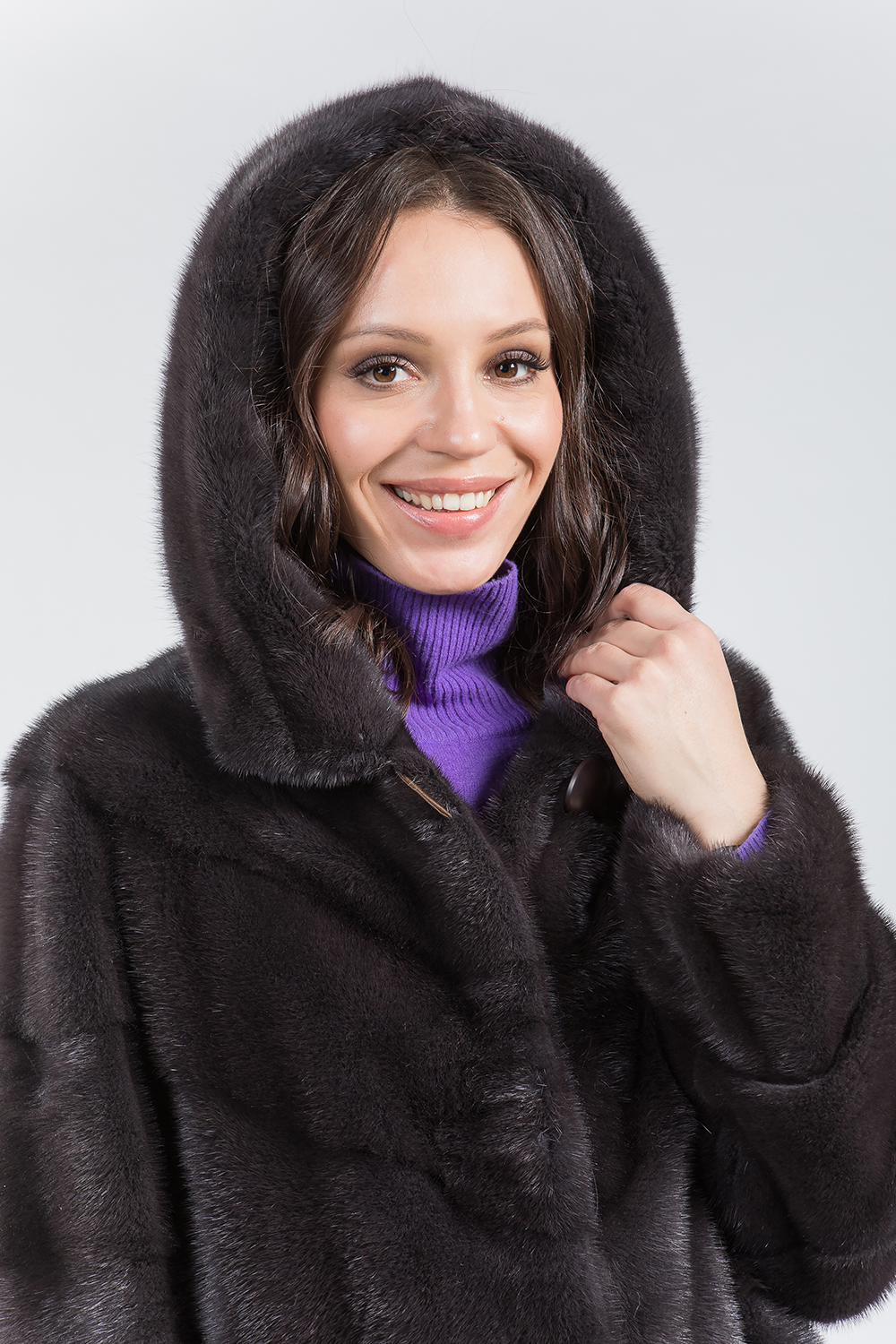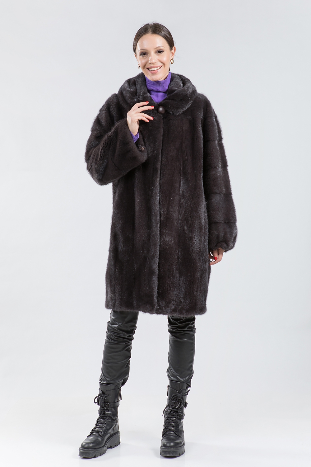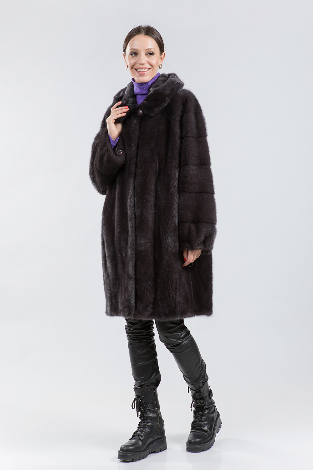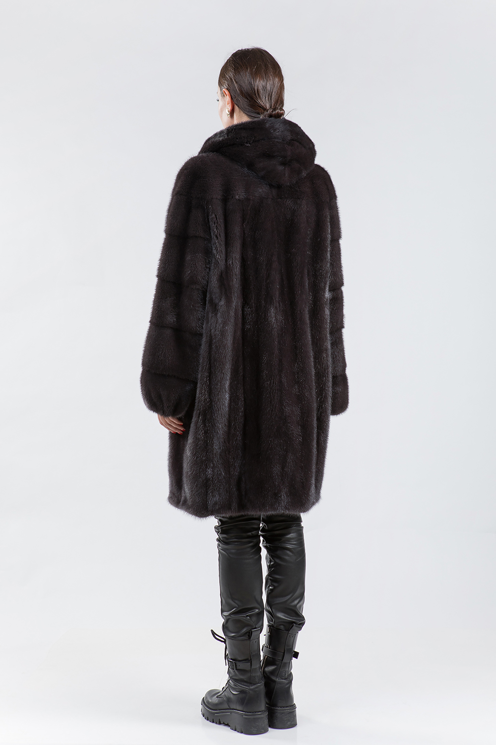 Норковое полупальто с капюшоном. Модель имеет свободный крой и рукава, выполненные из поперечных пластин. Пальто оснащено регулируемыми утяжками по низу, на рукавах и в области талии. Длина изделия составляет 100 см, а его особенностью является слегка зауженный низ. Сделайте эту зиму стильной и модной с новым норковым полупальто!
