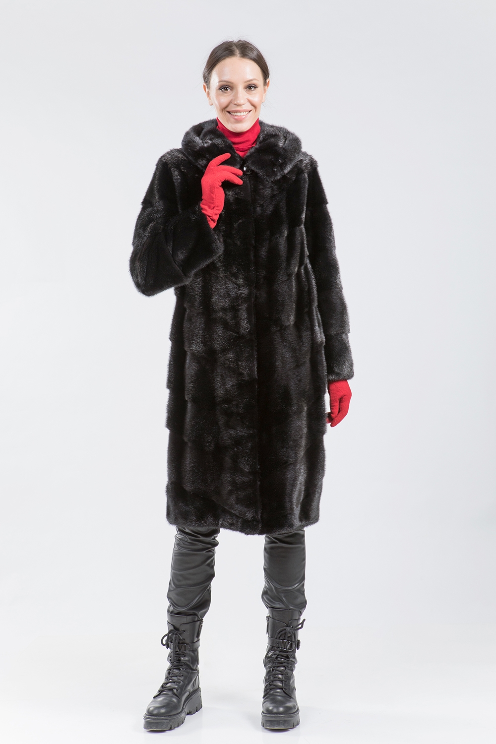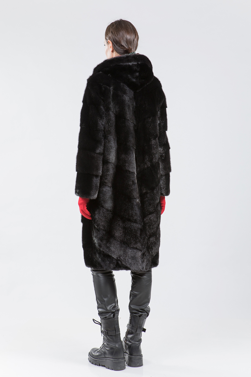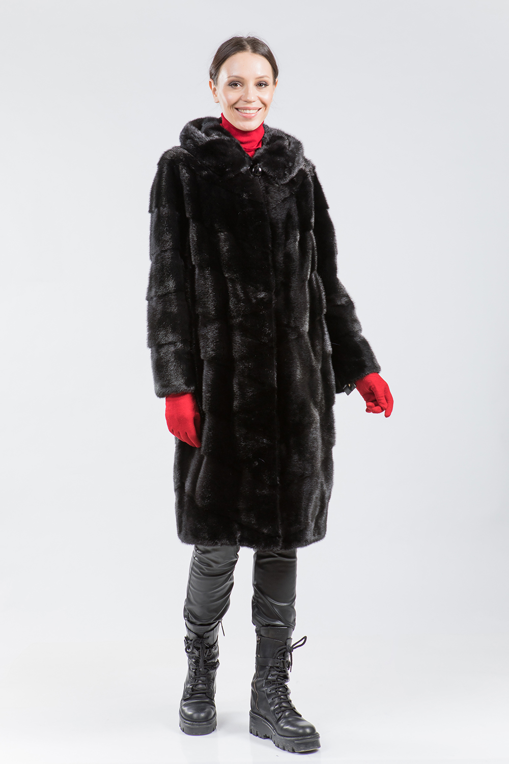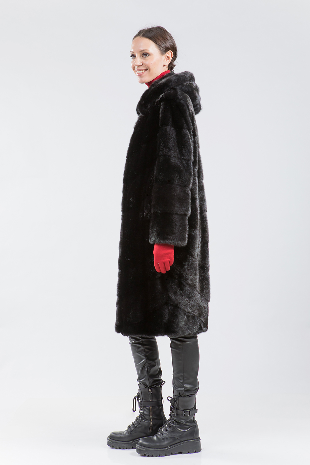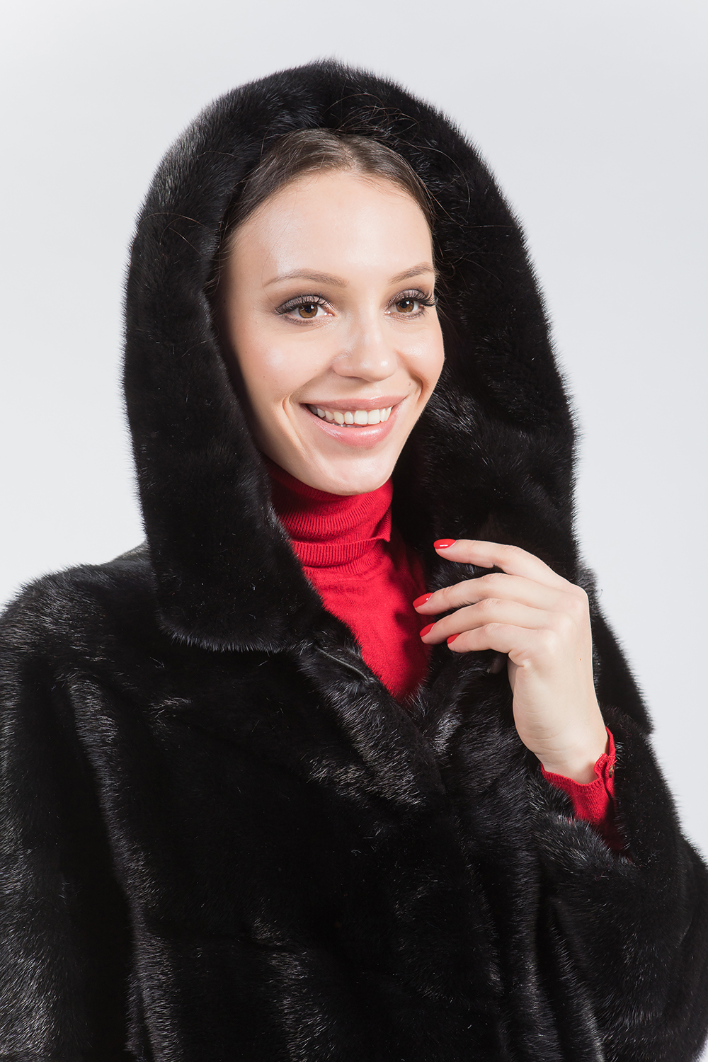 Полупальто из норки с капюшоном. Модель выполнена в диагональной технике выкладки пластин. У изделия есть регулируемые утяжки на рукавах, по низу и в зоне талии. Рукава можно трансформировать в более короткие. Длина полупальто — 110 сантиметров. Эта шуба практична и роскошна. Если вы хотите выглядеть стильно и элегантно, то натуральная норковая шуба — это идеальный выбор!