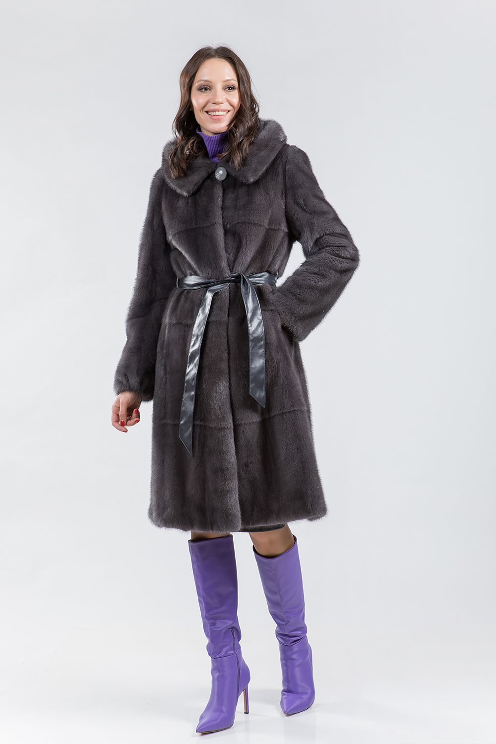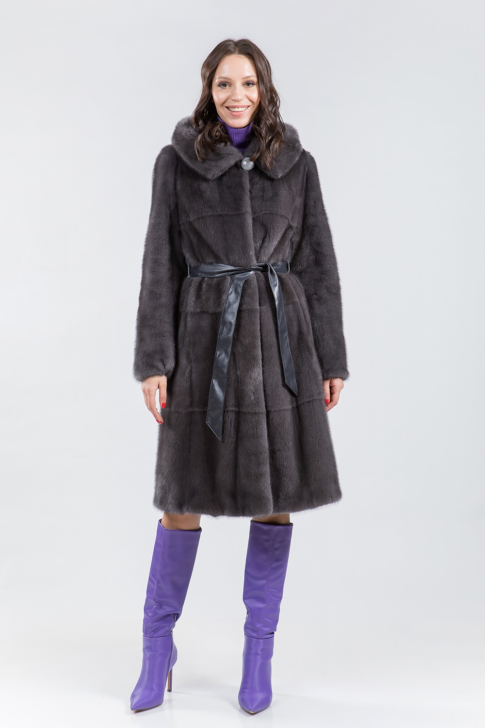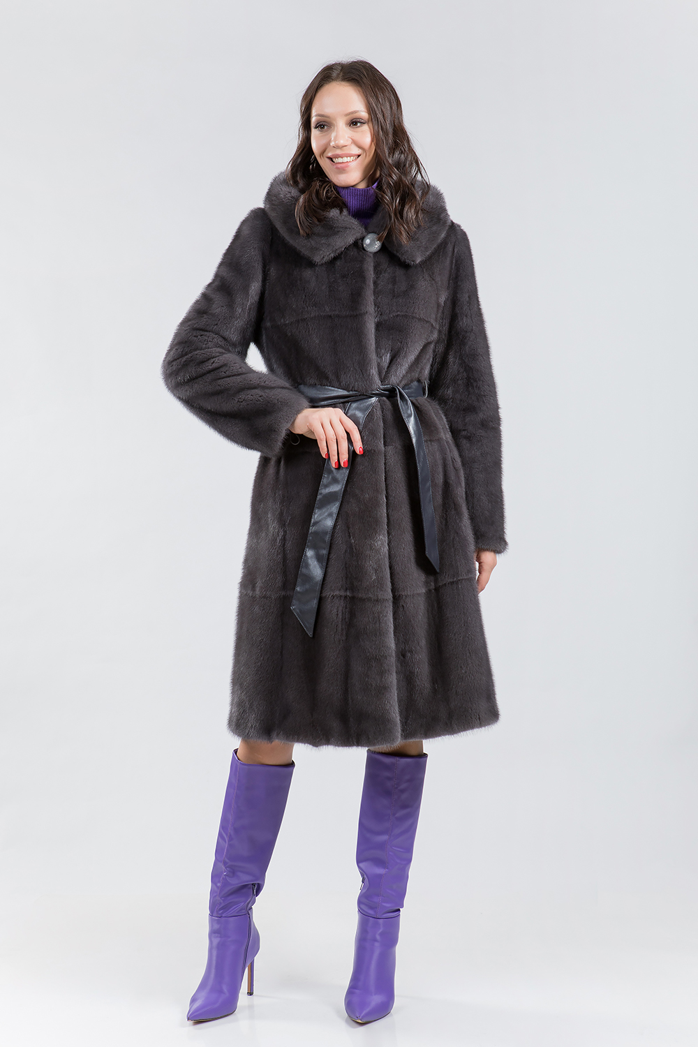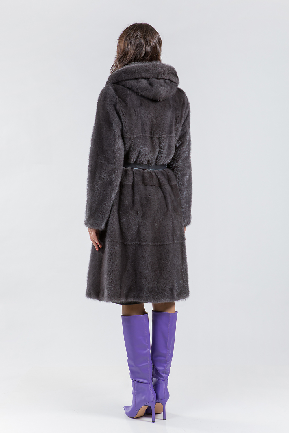 Полупальто из меха норки с капюшоном. Крой изделия пластины с добавлением роспуска. Модель оснащена регулирующими утяжками на рукавах и в зоне талии. Длина изделия 110 см. Кожаный пояс модели позволяет скорректировать шубку по фигуре. Меховое пальто выглядит эффектно, благодаря нежному оттенку муссона!