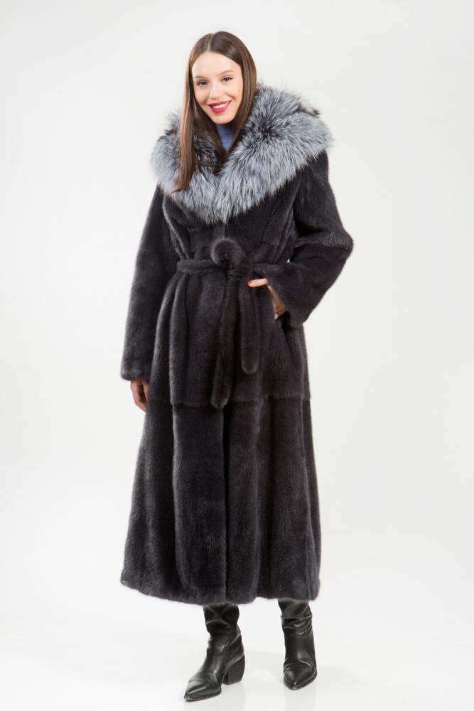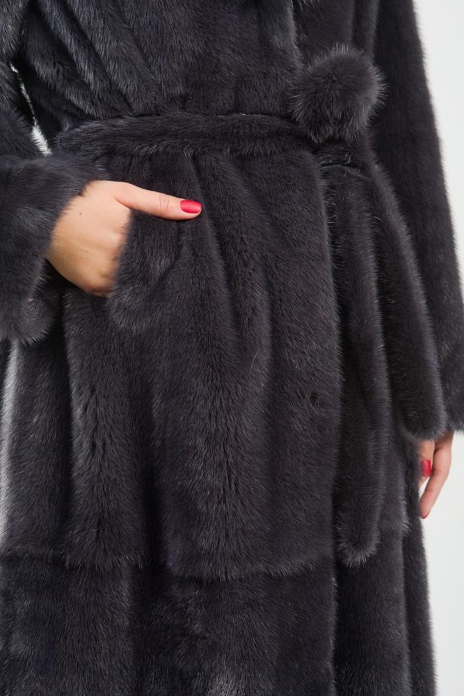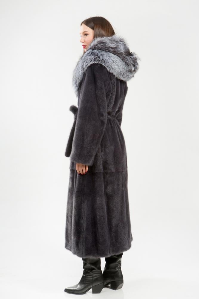 Пальто из меха норки. Капюшон модели декорирован мехом лисы. Крой изделия пластины с добавлением роспуска. На рукавах модели есть регулирующие утяжки, а по бокам шубки элегантные разрезы. Пояс из меха норки в комплекте. Длина изделия 135 см. Если хочется выглядеть престижно, по-королевски роскошно, подчеркнуть свой высокий статус, такое длинное норковое пальто является идеальным вариантом!
