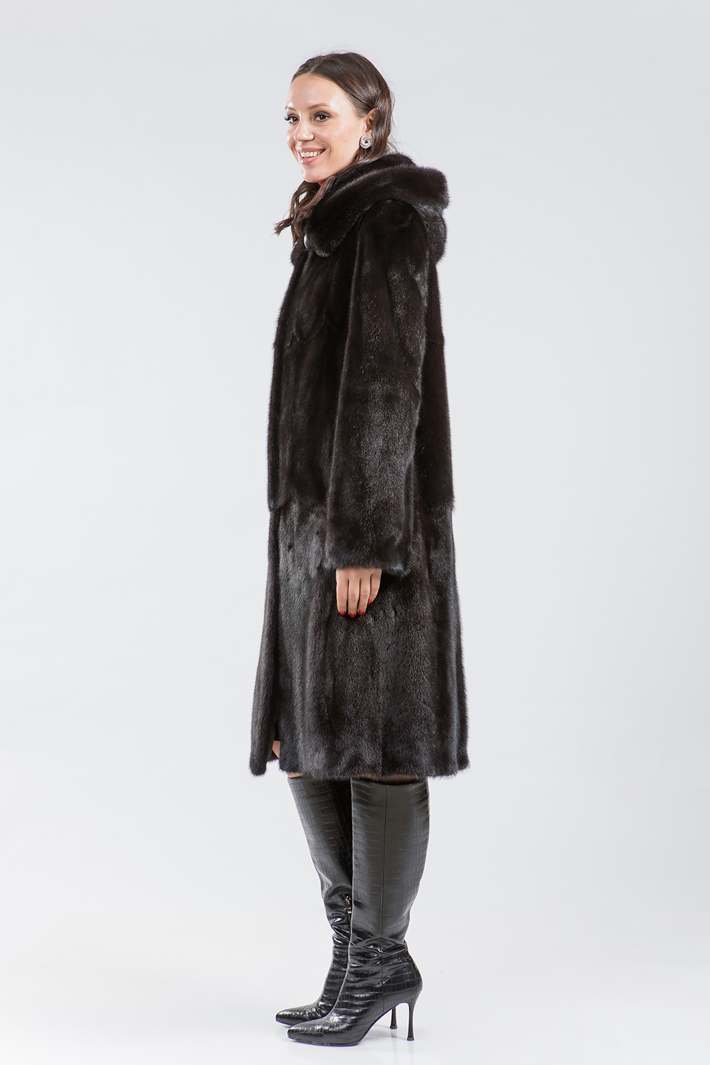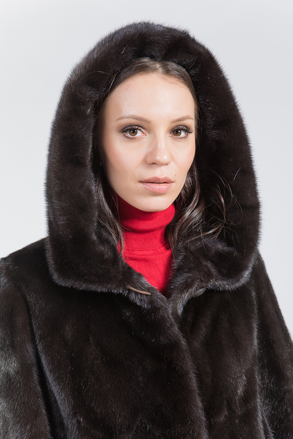 Полупальто из меха норки с капюшоном. Форма изделия выполнена в виде пластин с добавлением роспуска. Пальто оснащено регулируемыми утяжками на рукавах и в области талии. Длина изделия составляет 110 см. Эта модель классического силуэта является универсальным вариантом. Профессиональные стилисты уверены, что такое меховое пальто — безошибочный выбор, который гарантирует элегантность.