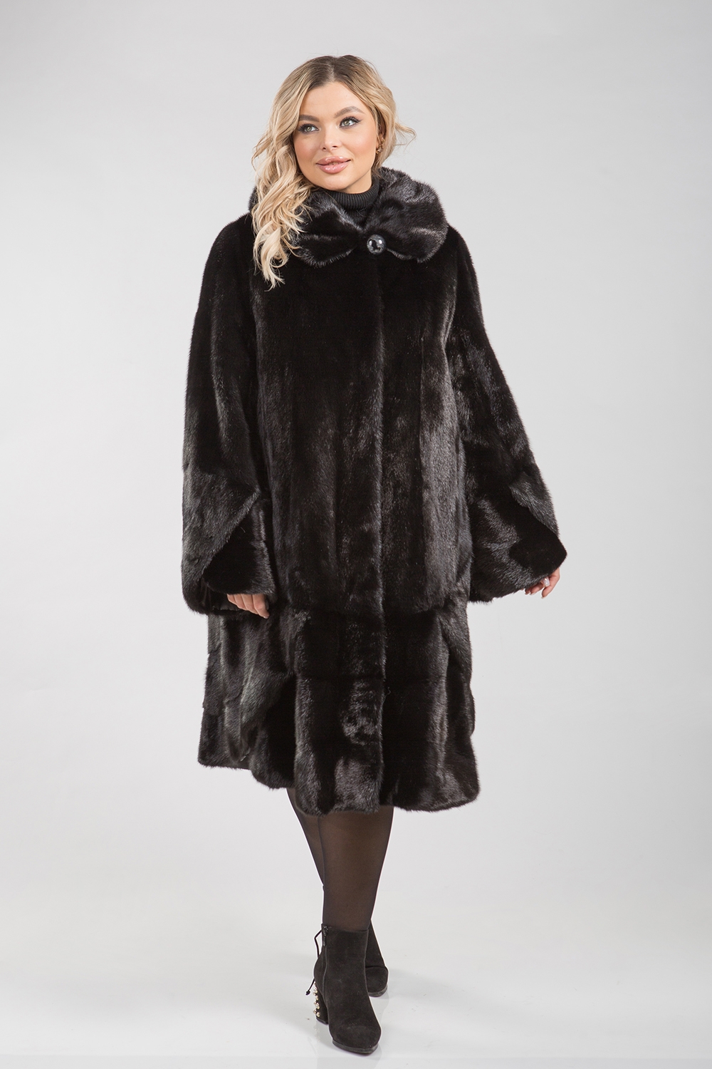 Полупальто из норки с капюшоном, выполненное в стиле «роспуск» с добавлением пластин. Длина изделия составляет 110 см. Модель имеет слегка расклешенный силуэт, как и рукава. По низу шубки расположена поперечная выкладка пластин, что придаёт ей дополнительный объем.