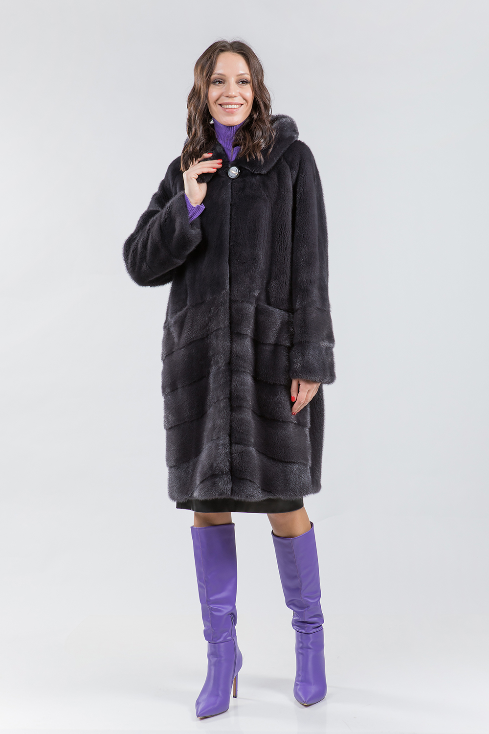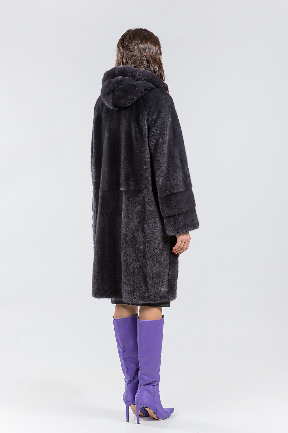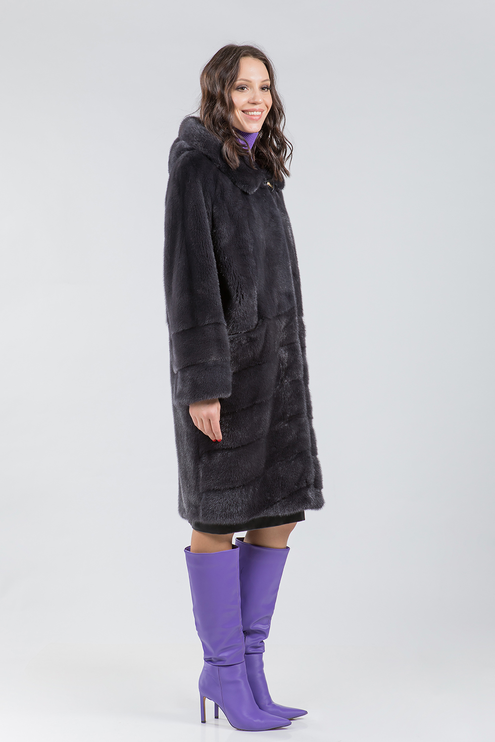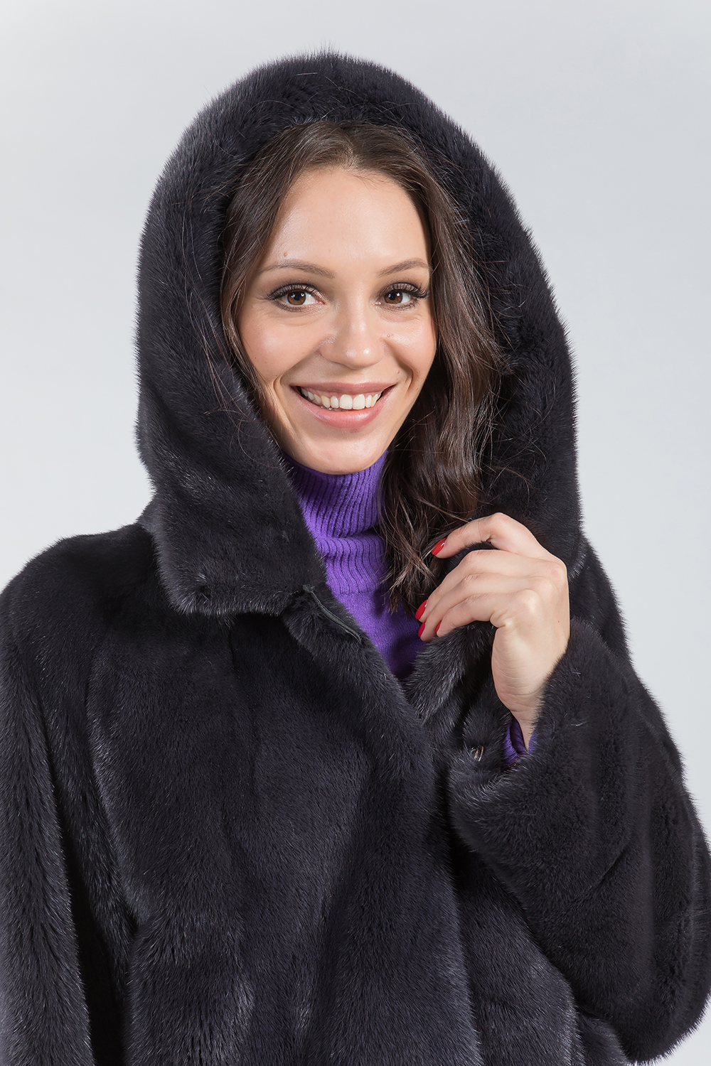 Полупальто из меха норки с капюшоном. Крой изделия комбинированный, перед выполнен в роспуск, низ модели диагональная выкладка пластин, а спинка шубки полностью сшита в роспуск. На талии, рукавах и по низу изделия имеются регулирующие утяжки. Длина модели 100 см. Норковое пальто великолепного цвета муссона будет к лицу и блондинкам и брюнеткам. Натуральный мех норки красиво играет на солнце и не теряет свою первоначальную структуру на протяжении долгого времени!
