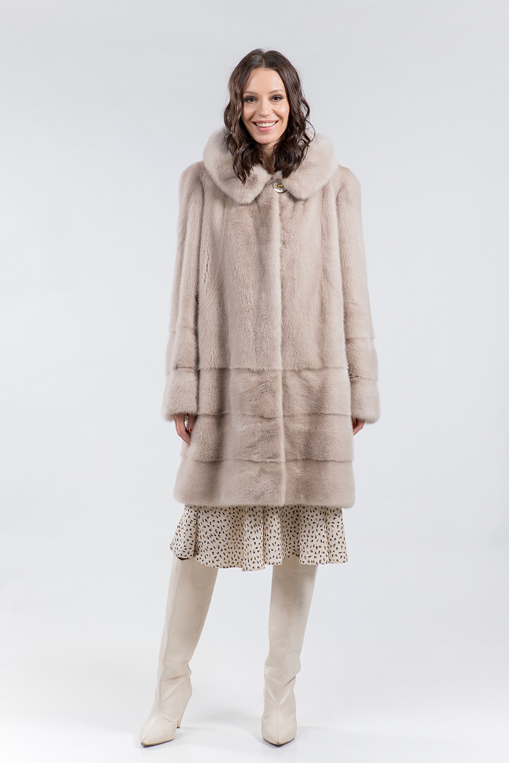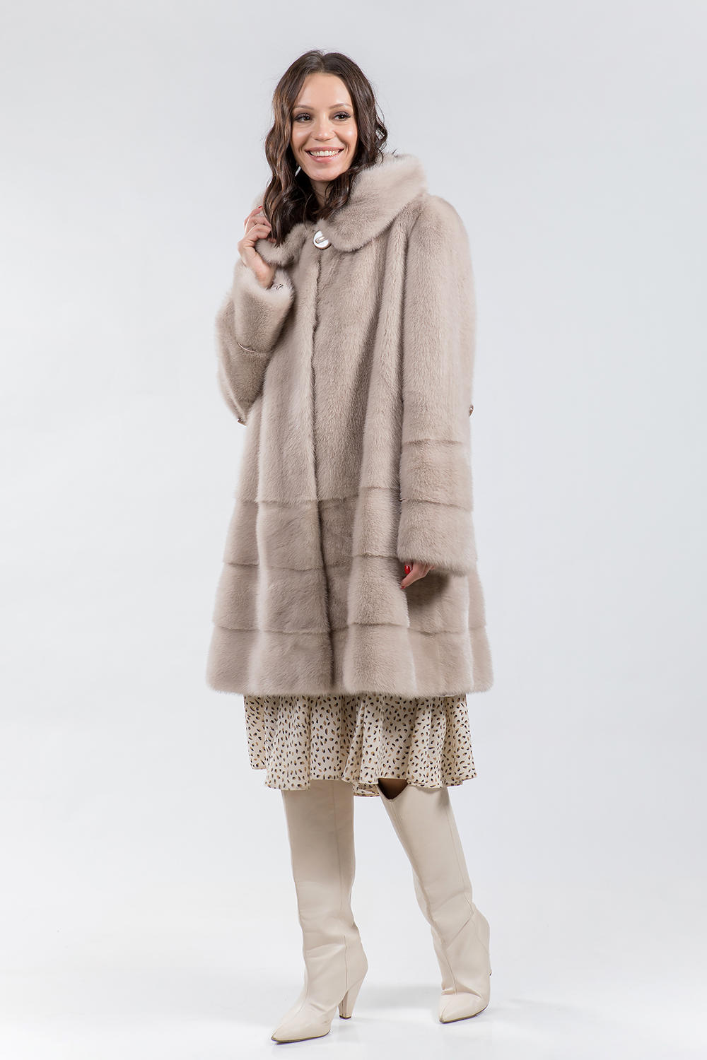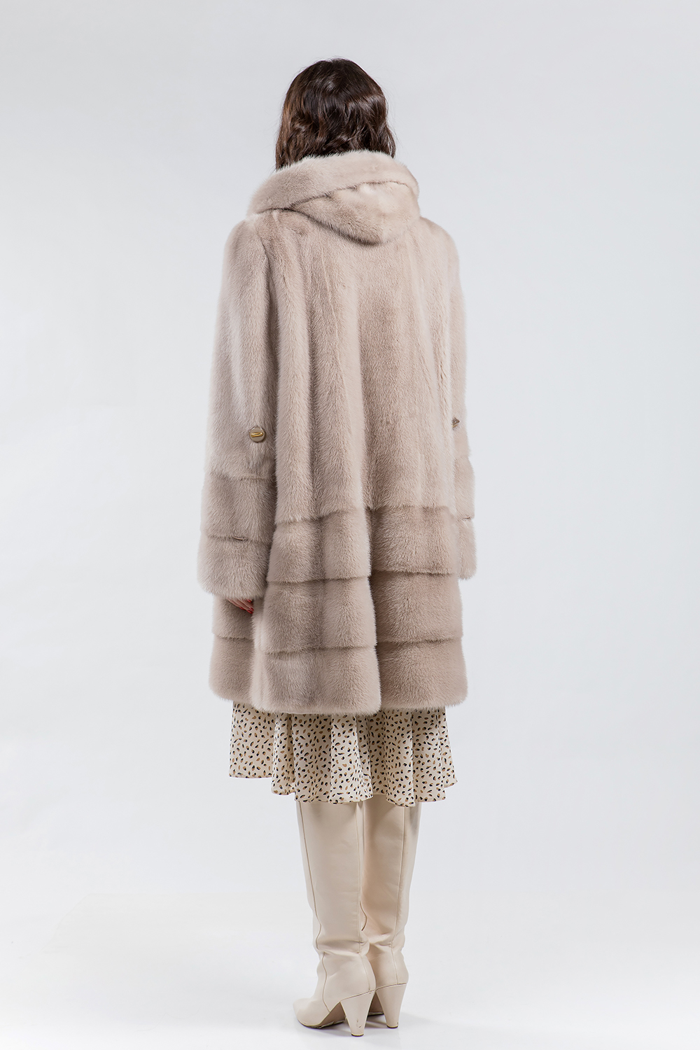 Полупальто из меха норки с капюшоном. Крой изделия комбинированный. Верх модели собран в роспуск, а низ изделия поперечная выкладка пластин. Рукава модели трансформируются в более укороченные. Внутри на талии и на рукавах изделия есть регулирующие утяжки. Длина модели 100 см. Шубка идеально будет смотреться на любой фигуре! Гарантирует элегантность и утонченность образа!
