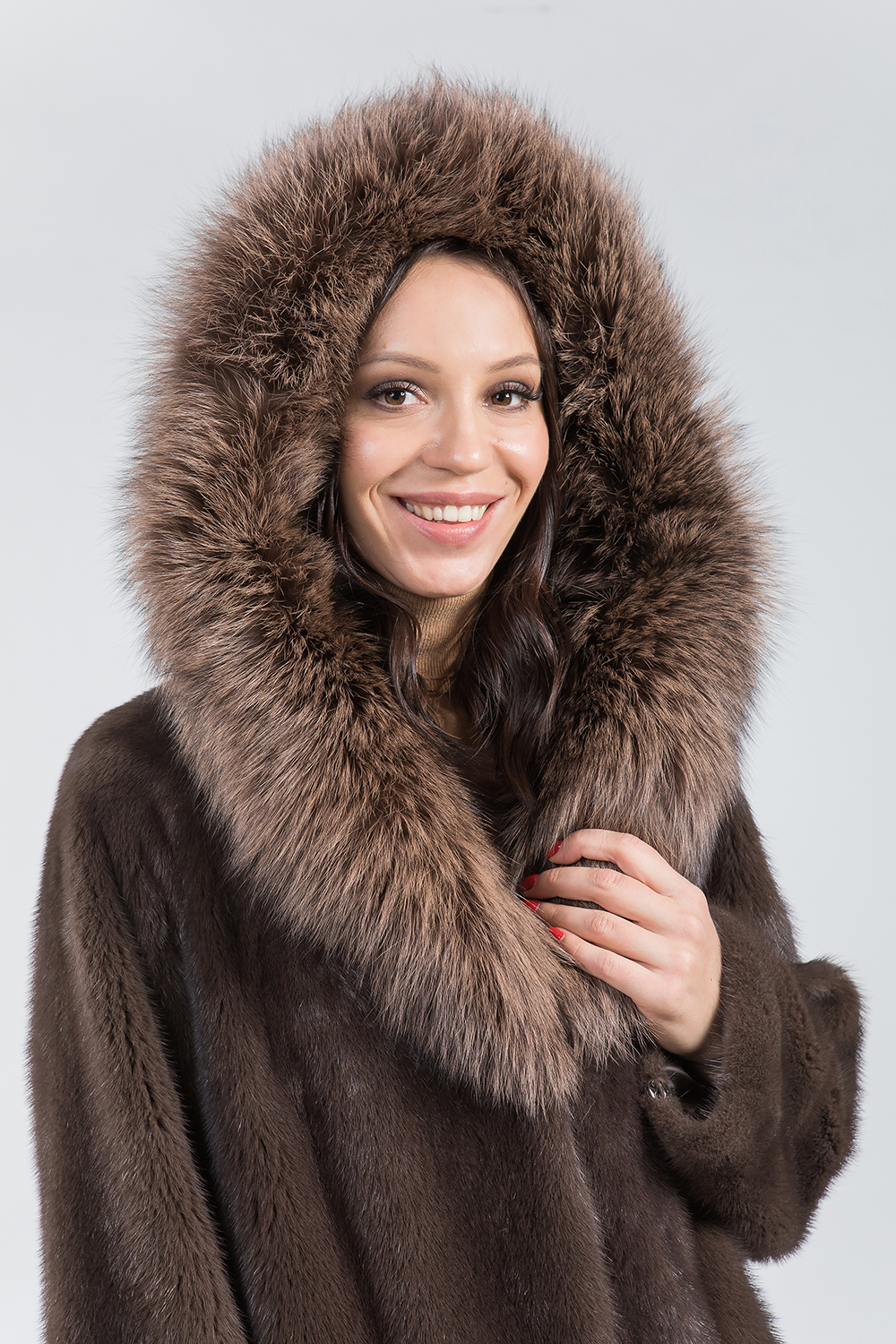 Полупальто из меха норки. Капюшон модели декорирован тонированной лисой. Крой изделия комбинированный, перед выполнен в роспуск, низ модели пластины, а спинка шубки полностью-диагональная выкладка пластин. На талии, рукавах и по низу изделия имеются регулирующие утяжки. Длина модели 100 см. Престижный вид модели предают элегантный сдержанный оттенок тонированного меха норки и удачное сочетание коротковорсового и длинноворсового материалов.