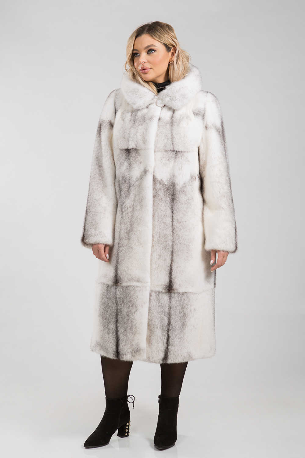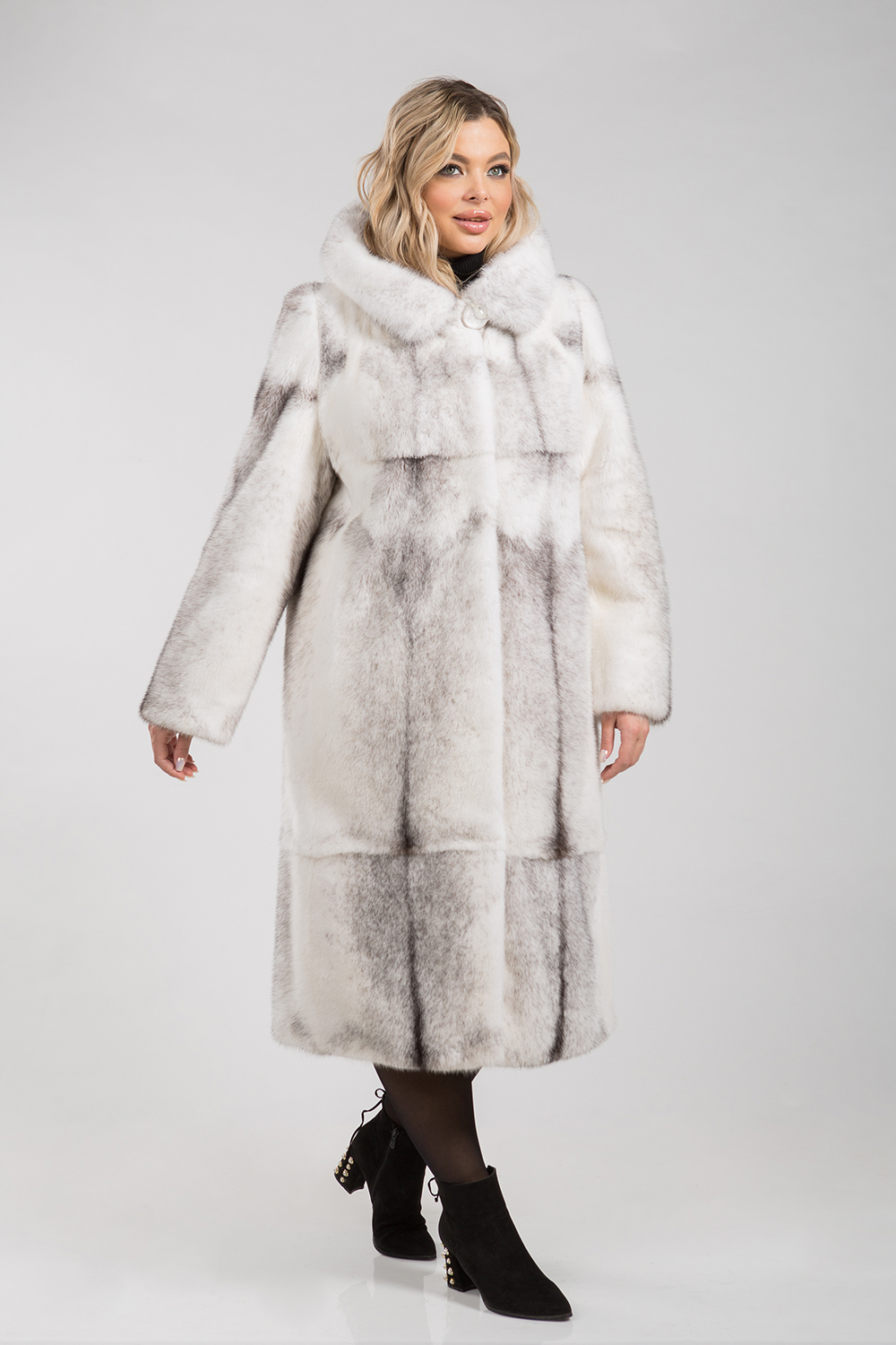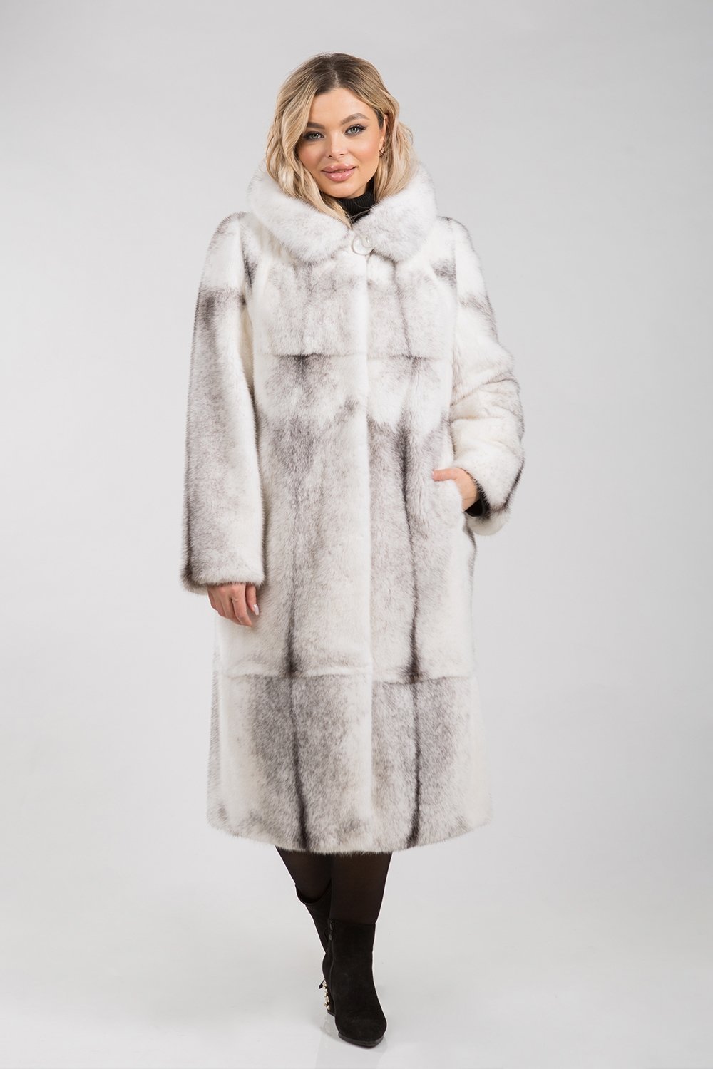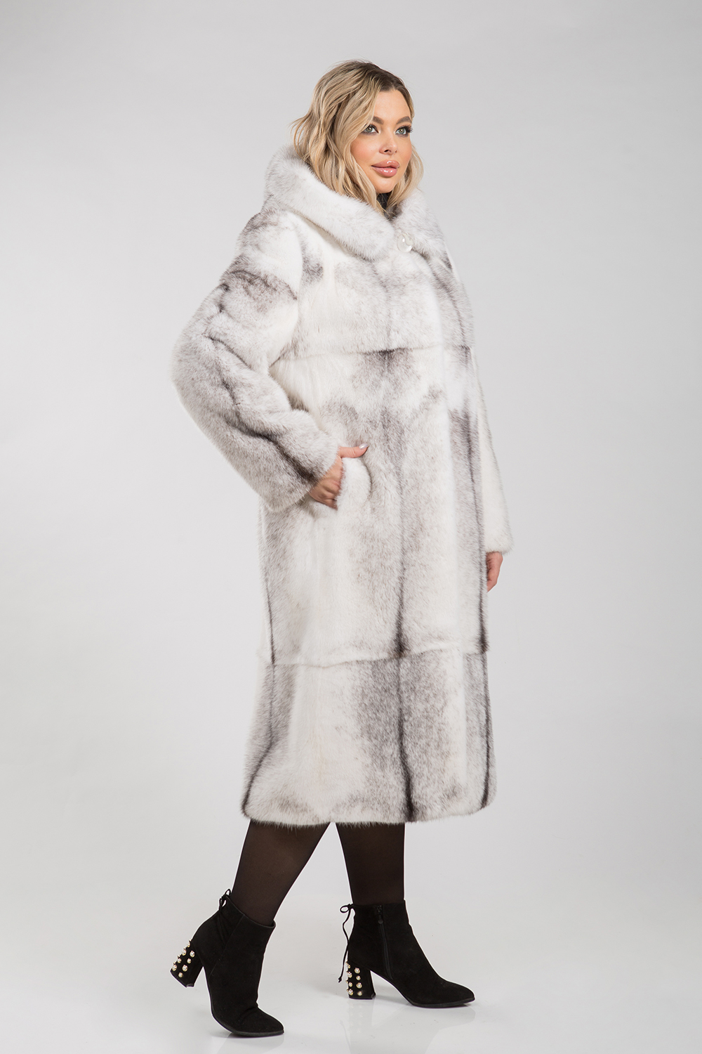 Полупальто из меха норки с капюшоном. Крой изделия пластины с добавлением роспуска. Модель оснащена регулирующими утяжками на рукавах и в зоне талии. Длина изделия 115 см. Элегантная шубка для ценителей строгого классического стиля.