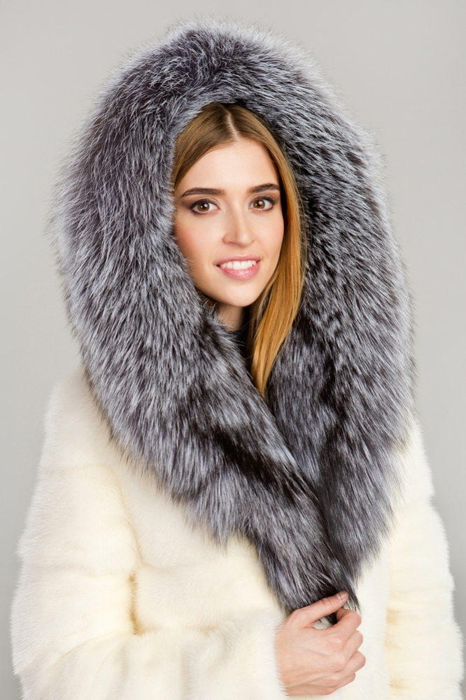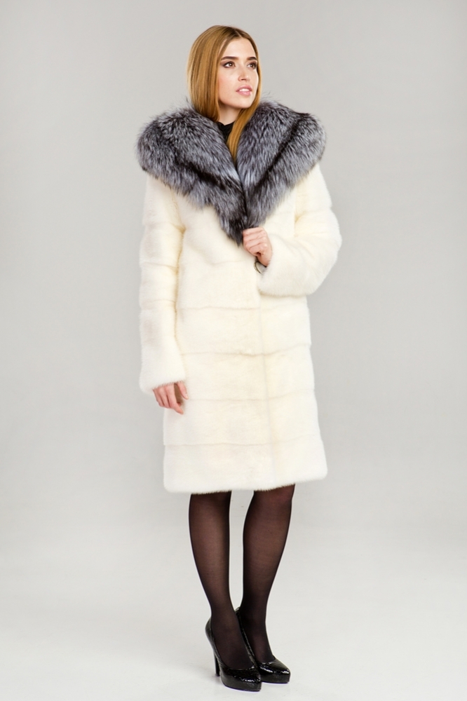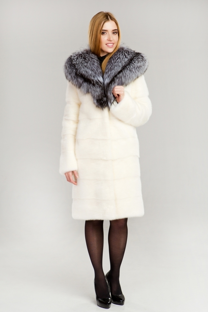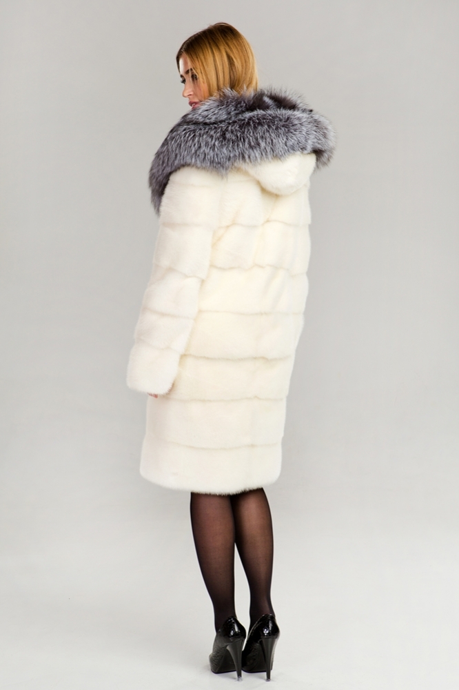 Полупальто из меха норки с капюшоном, украшенным роскошным лисьим мехом. Поперечная выкладка пластин придает изделию уникальный крой. Модель оснащена регулируемыми утяжками на рукавах, по низу и в зоне талии. Длина полупальто составляет 100 см. В подарок идет меховой пояс. Рукава можно укоротить с помощью скрытых молний. Белоснежное норковое пальто придает свежесть и молодость образу, а великолепный капюшон из лисы добавляет нотку элегантности и шика!