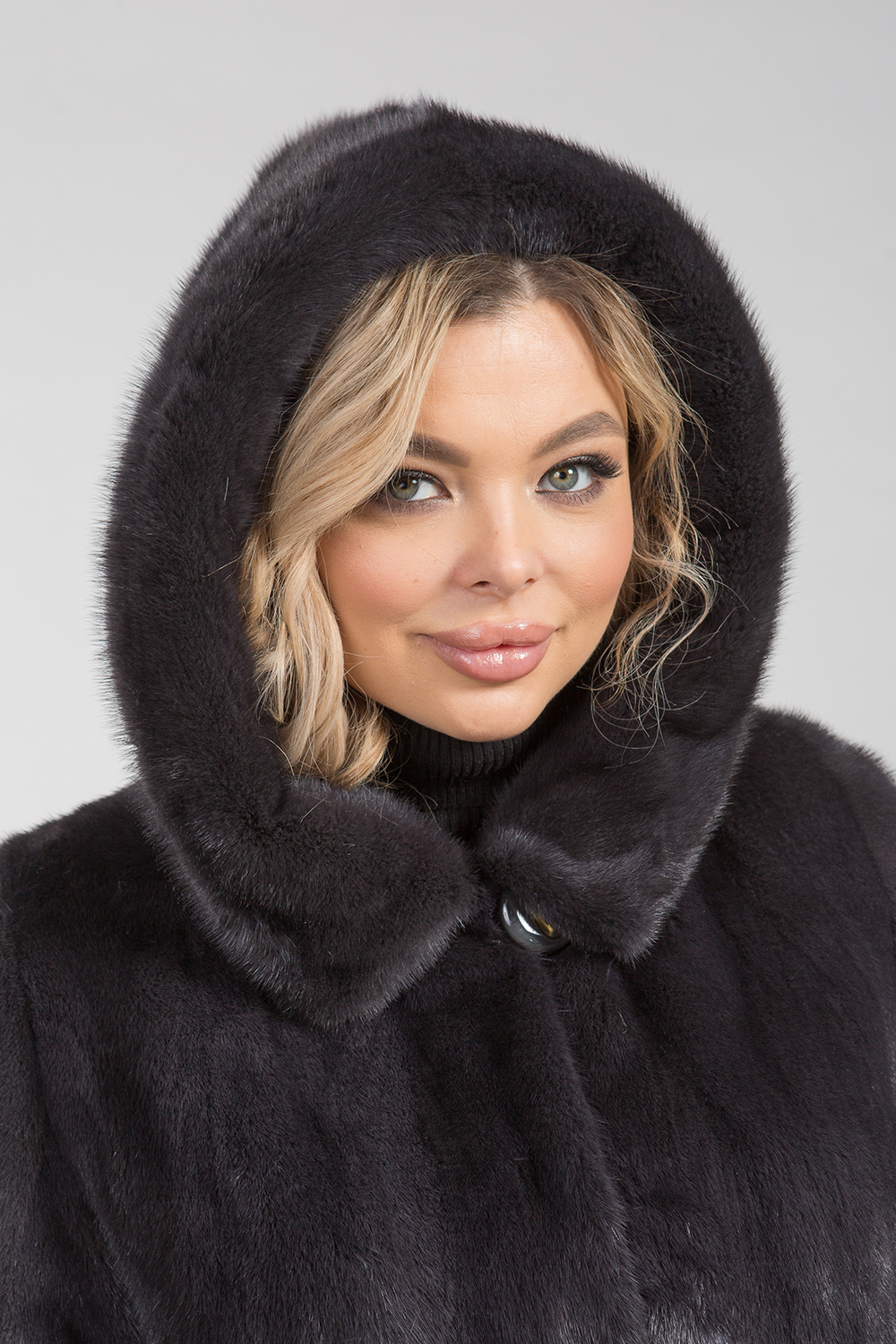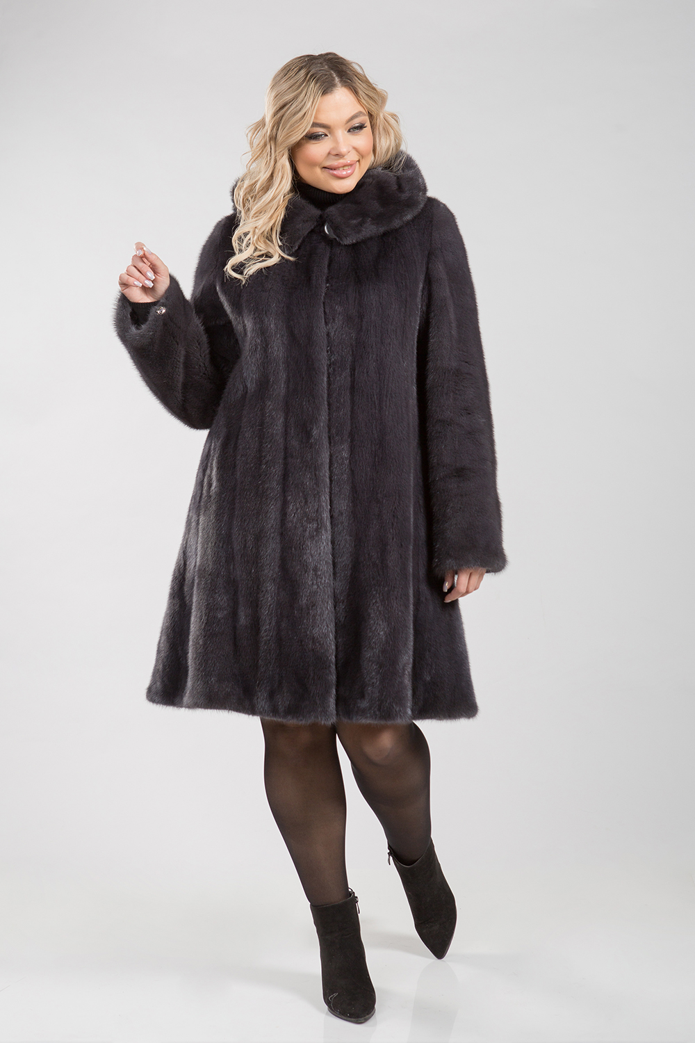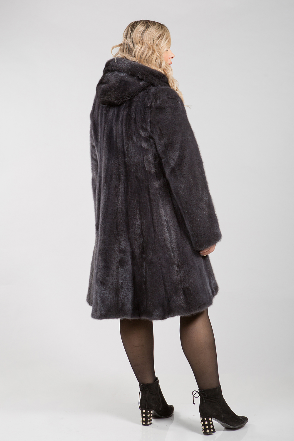 Полупальто из меха норки с капюшоном. Крой изделия роспуск. Модель оснащена регулирующими утяжками на рукавах и в зоне талии. Длина изделия 90 см. Слегка расклешенный низ модели обеспечивает шубке кокетливый вид. Благородный грифельный цвет представляет неограниченные возможности для любительниц экспериментов, регулярных изменений стиля, имиджа!