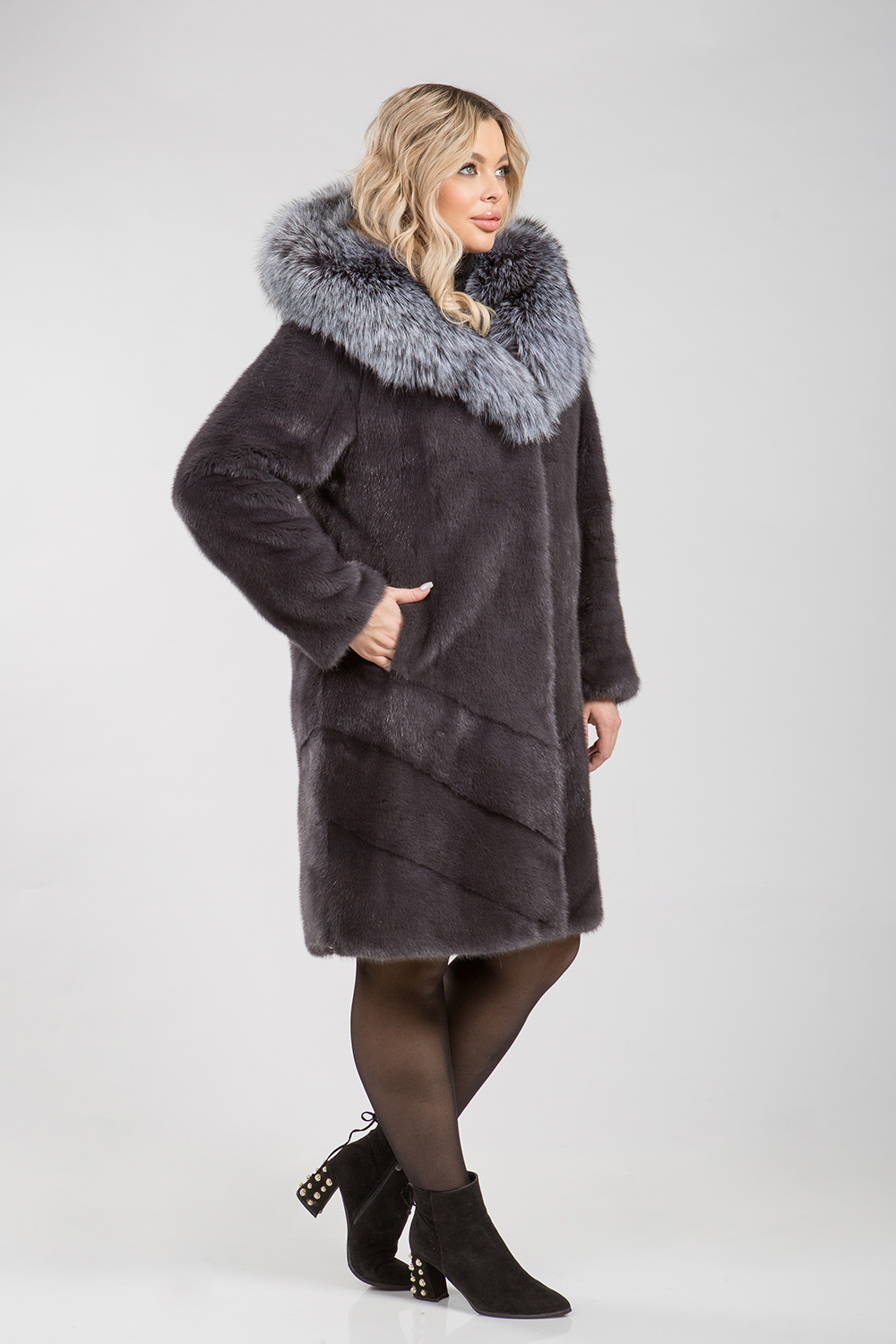 Полупальто из меха норки. Капюшон модели декорирован мехом лисы. Крой изделия комбинированный, перед выполнен в роспуск, низ модели пластины, а спинка шубки полностью-диагональная выкладка пластин. На талии, рукавах и по низу изделия имеются регулирующие утяжки. Длина модели 100 см. Престижный вид модели предают элегантный оттенок цвета муссона и удачное сочетание коротковорсового и длинноворсового материалов.