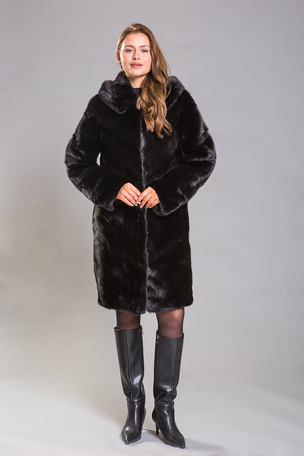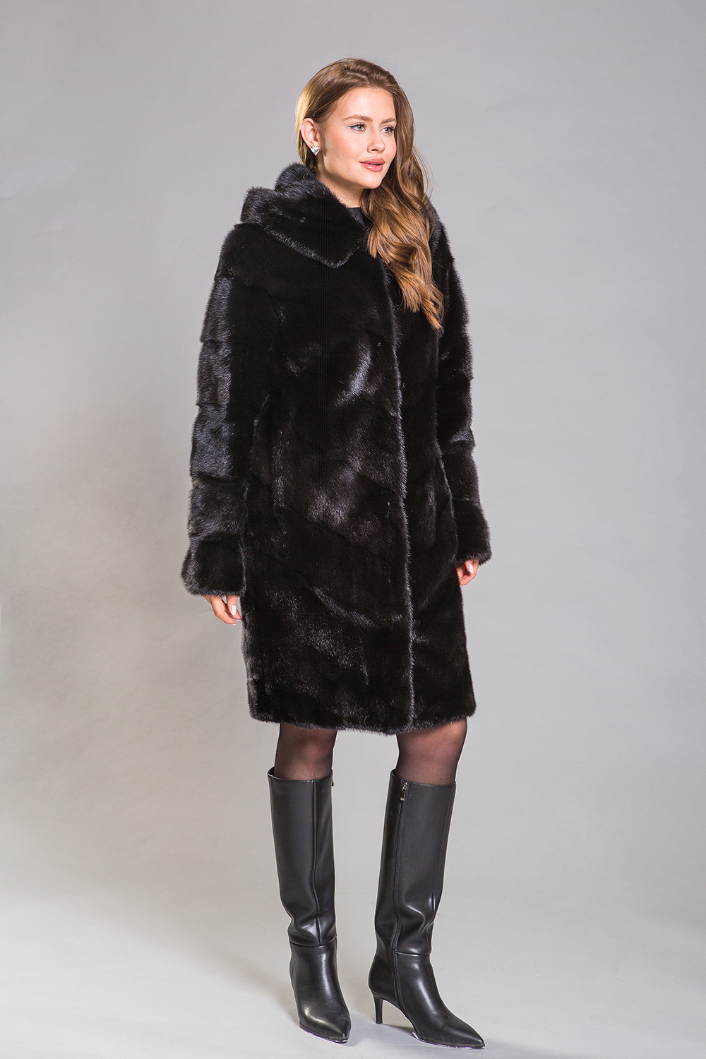 Полупальто из норкового меха с капюшоном, созданное в уникальном стиле диагональной выкладки пластин. Эта модель оснащена регулирующими утяжками в трёх ключевых местах: на талии, на рукавах и по низу изделия, что обеспечивает идеальную посадку шубки на фигуре. Длина полупальто составляет 100 сантиметров. Благодаря своему универсальному фасону, эта шубка подойдёт для любого типа фигуры!