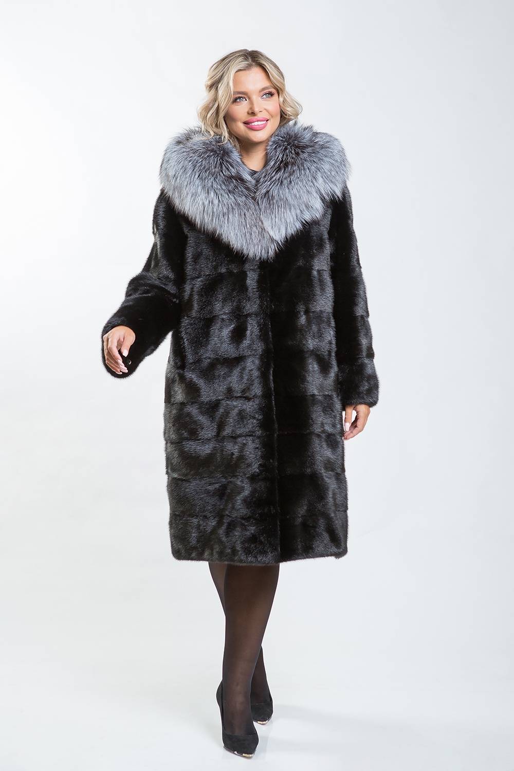 Это полупальто выполнено из норкового меха, а его капюшон украшен чернобурой лисой. Модель имеет необычный крой: пластины меха располагаются в поперечном направлении. Для удобства и регулировки талии, рукавов и низа предусмотрены специальные утяжки. Длина полупальто составляет 110 сантиметров.