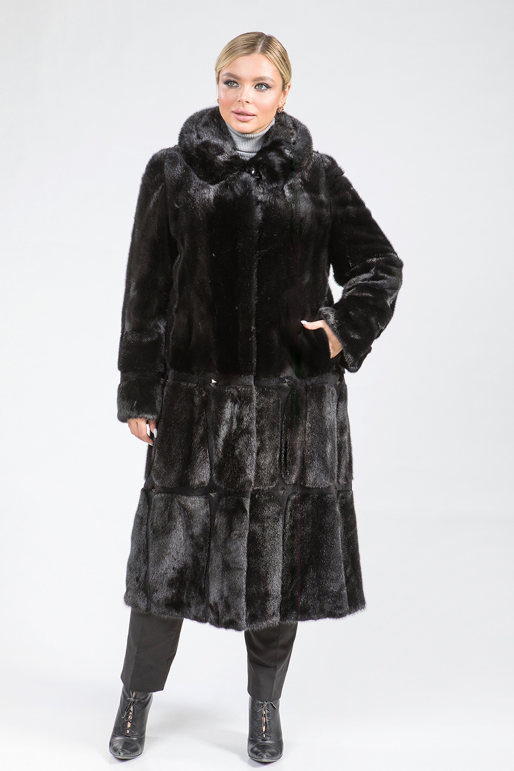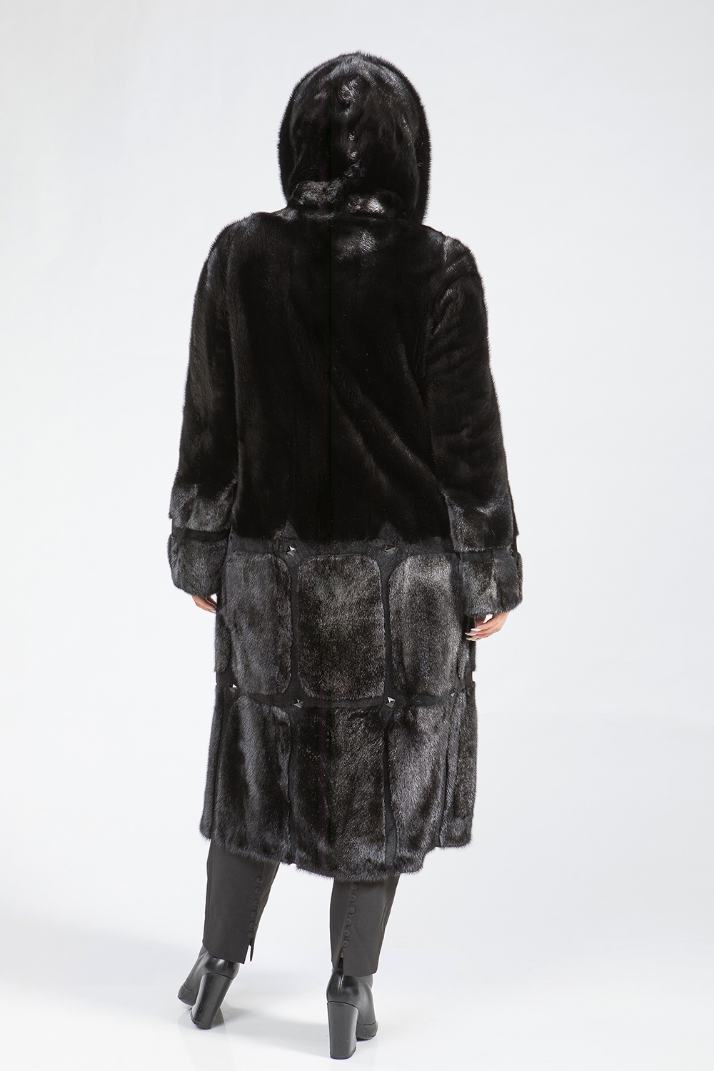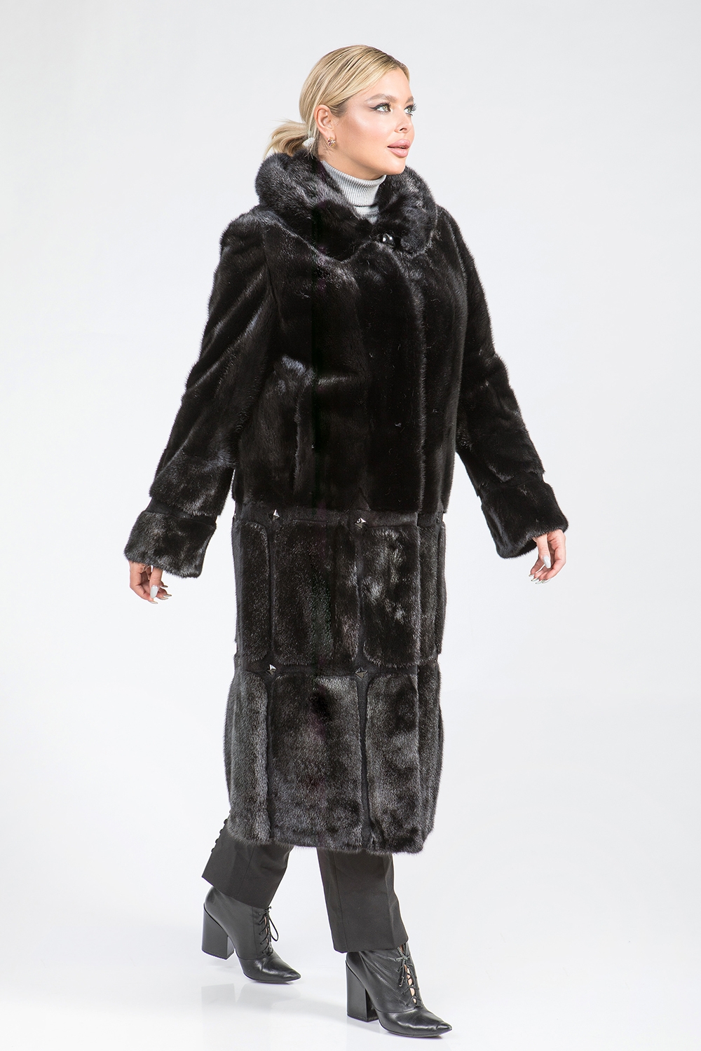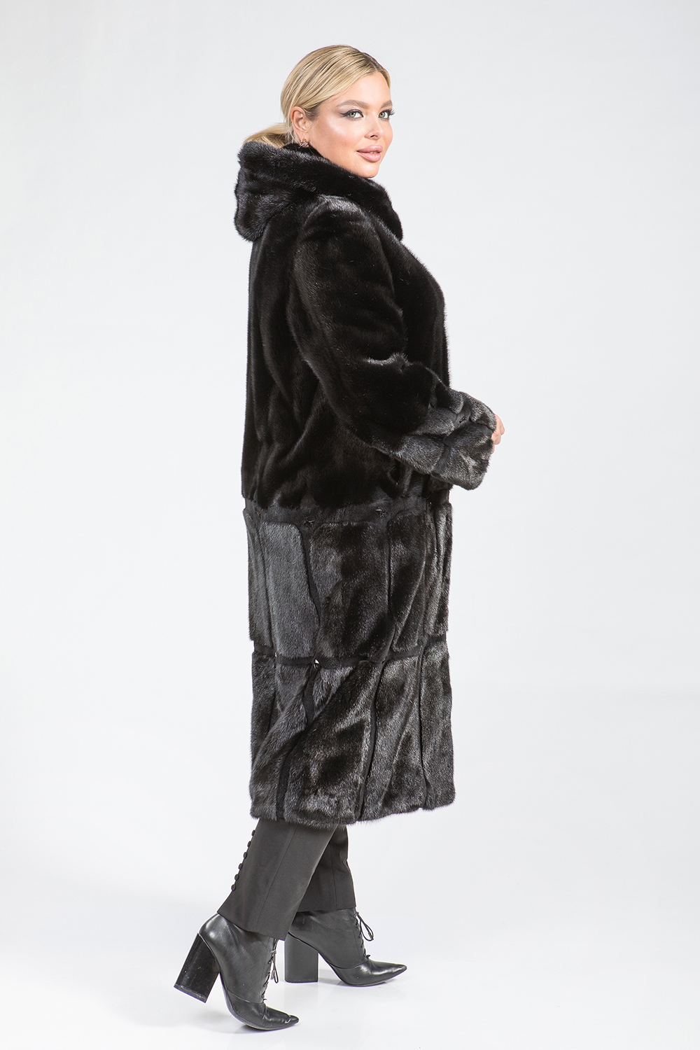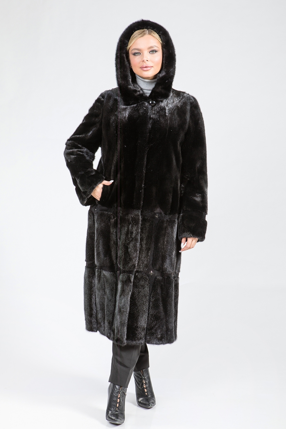 Полупальто из меха норки с капюшоном, выполненное в виде пластин, идеально подойдет для холодной погоды. Модель оснащена регулируемыми утяжками на рукавах и талии, что позволяет создать комфортную посадку. Длина изделия составляет 120 см.