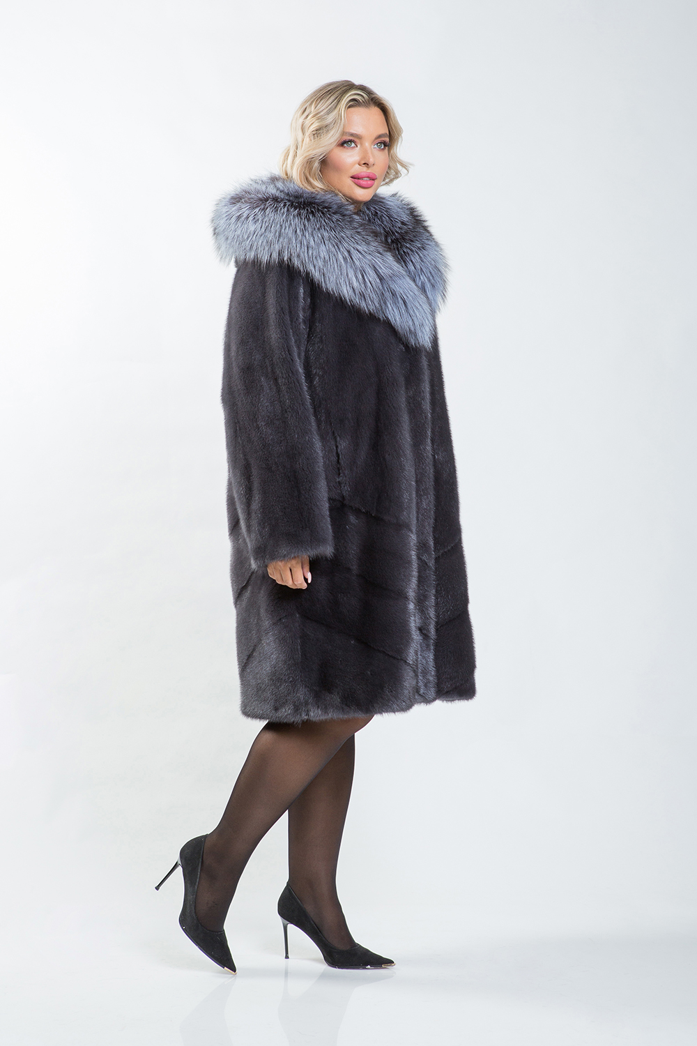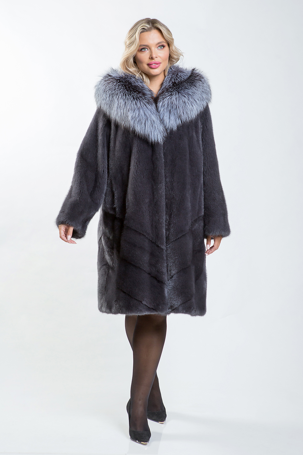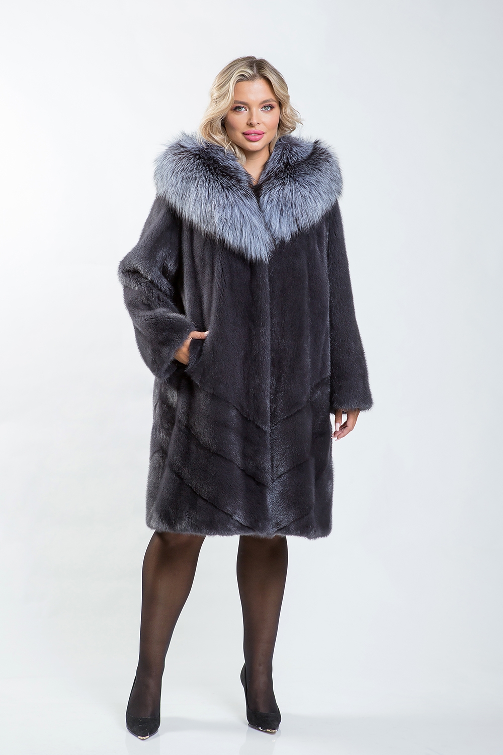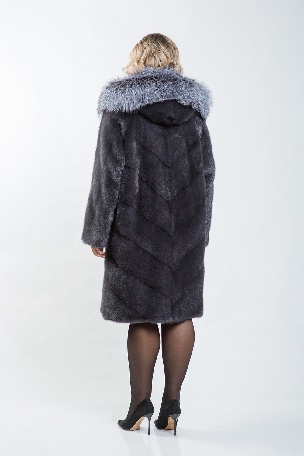 Полупальто из норкового меха украшено капюшоном, отделанным чернобуркой лисой. Модель сочетает в себе несколько техник кроя: перед выполнен в роспуск, низ — с диагональной выкладкой пластин, а спинка представляет собой полностью диагональную выкладку.