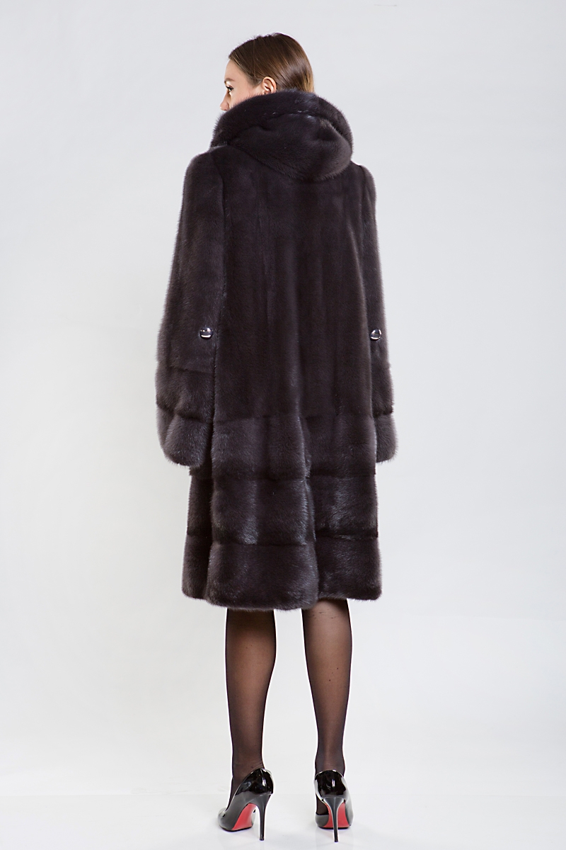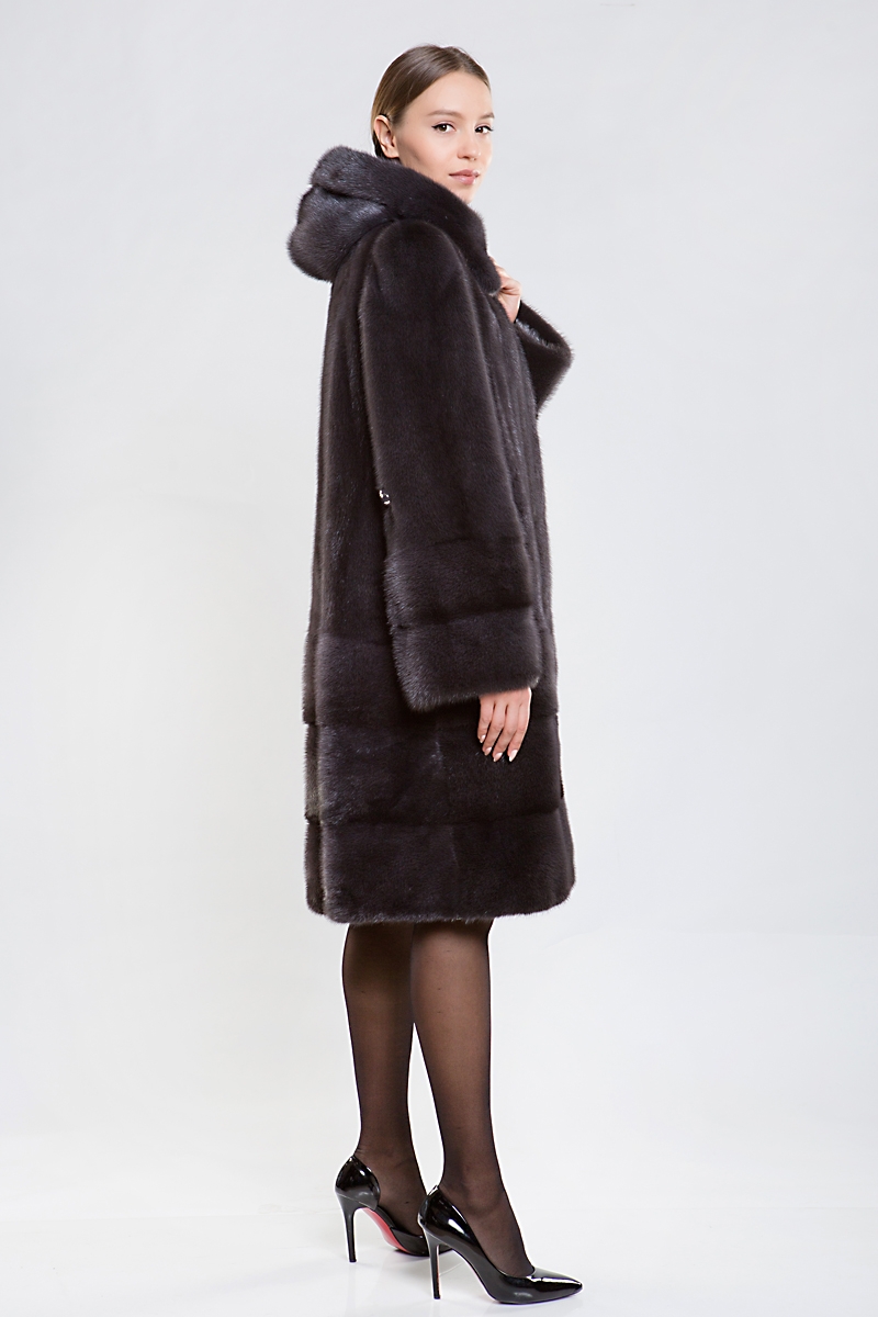 Полупальто из меха норки с капюшоном. Крой изделия комбинированный. Верх модели собран в роспуск, а низ изделия поперечная выкладка пластин. Рукава модели трансформируются в более укороченные. Длина изделия 100 см. Шубка хорошо сидит на любой фигуре. Гарантирует элегантность и утонченность образа!