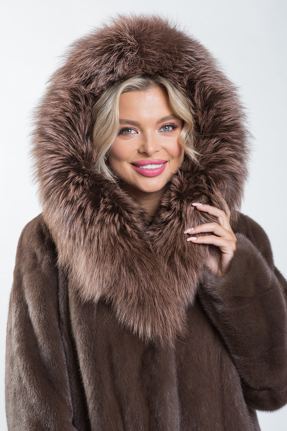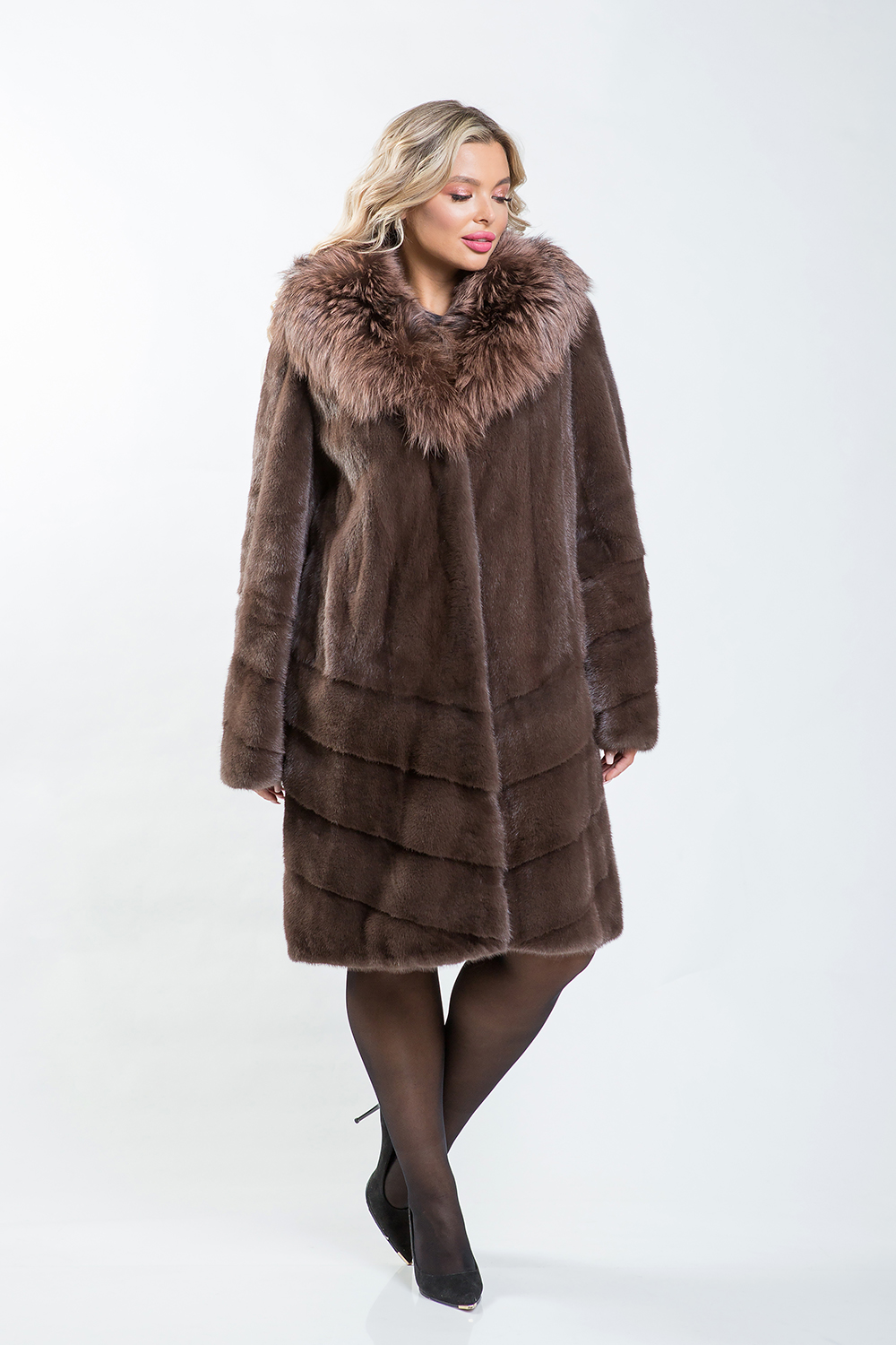 Полупальто из меха норки. Капюшон модели декорирован тонированной лисой. Крой изделия комбинированный, верх модели выполнен в роспуск, низ диагональная выкладка пластин. На талии, рукавах и по низу изделия имеются регулирующие утяжки. Длина модели 100 см. Престижный вид модели предают элегантный сдержанный оттенок тонированного меха норки и удачное сочетание коротковорсового и длинноворсового материалов.