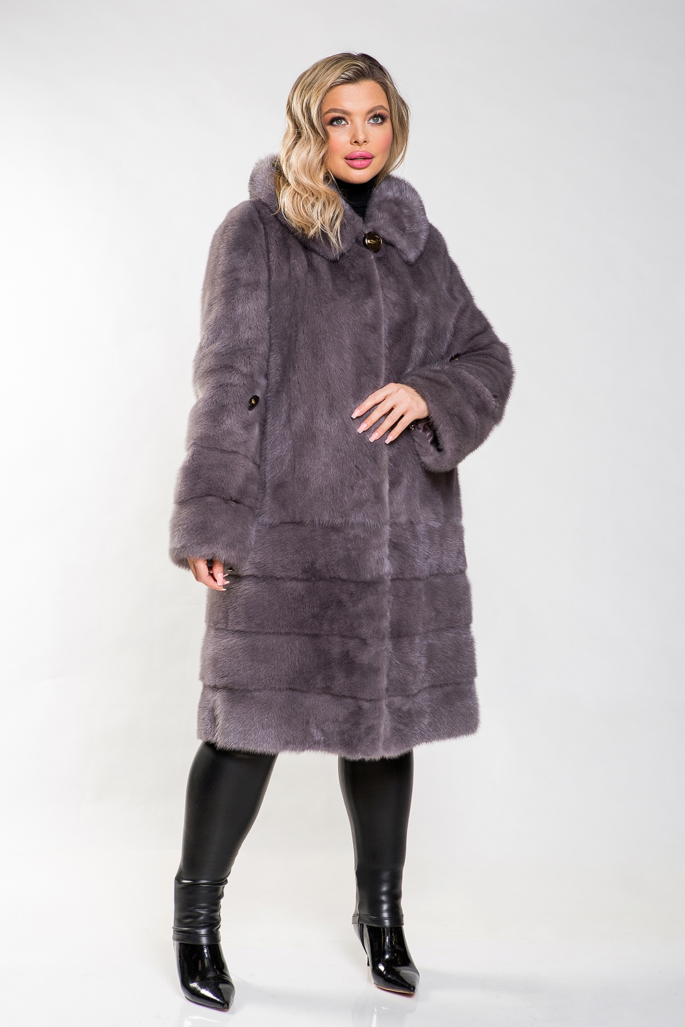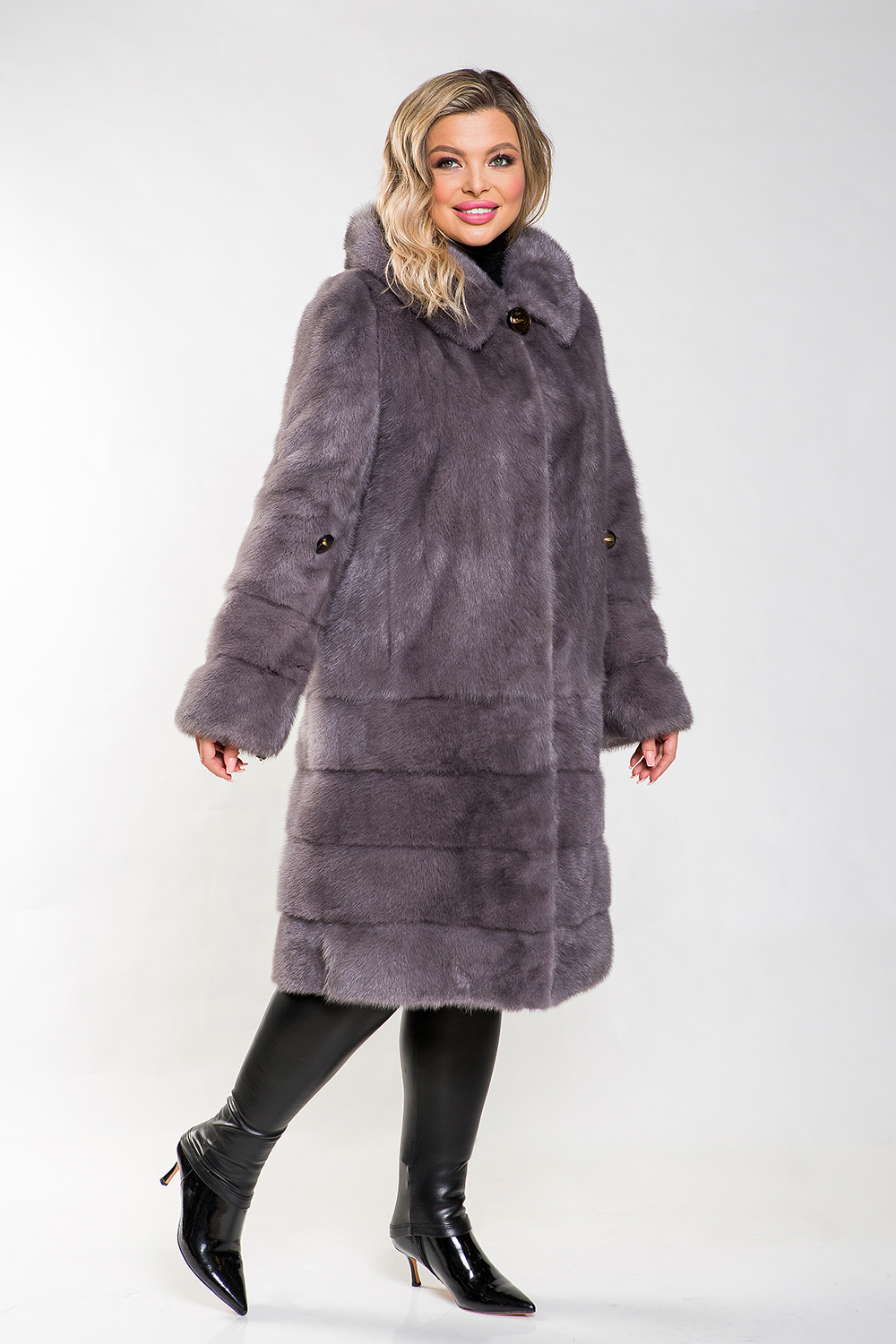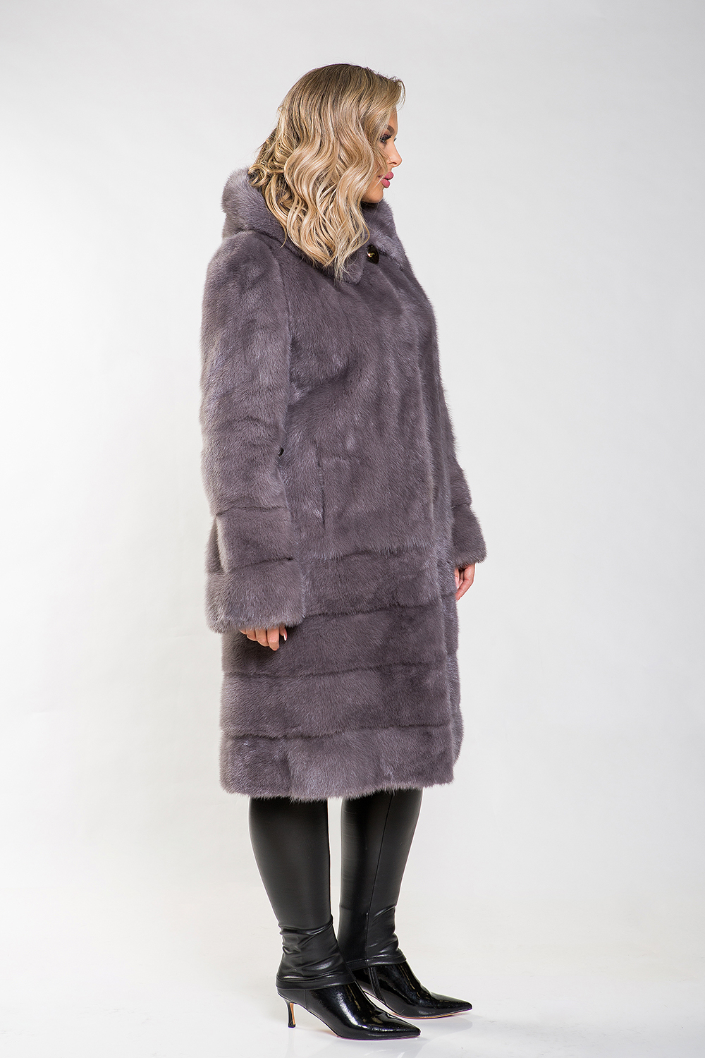 Полупальто из норки с капюшоном. Модель имеет интересный крой: верх выполнен в виде роспуска, а низ — из поперечно выложенных пластин.