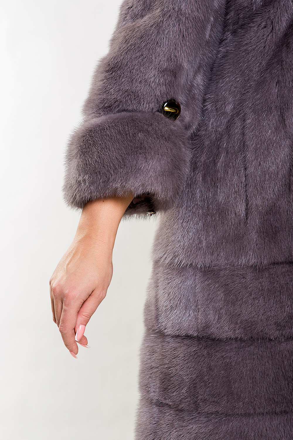 Это меховое пальто оснащено регулируемыми утяжками на талии и рукавах, что позволяет адаптировать его под любую фигуру. Длина изделия составляет 110 см, а рукав можно укоротить, что делает модель более комфортной в носке.