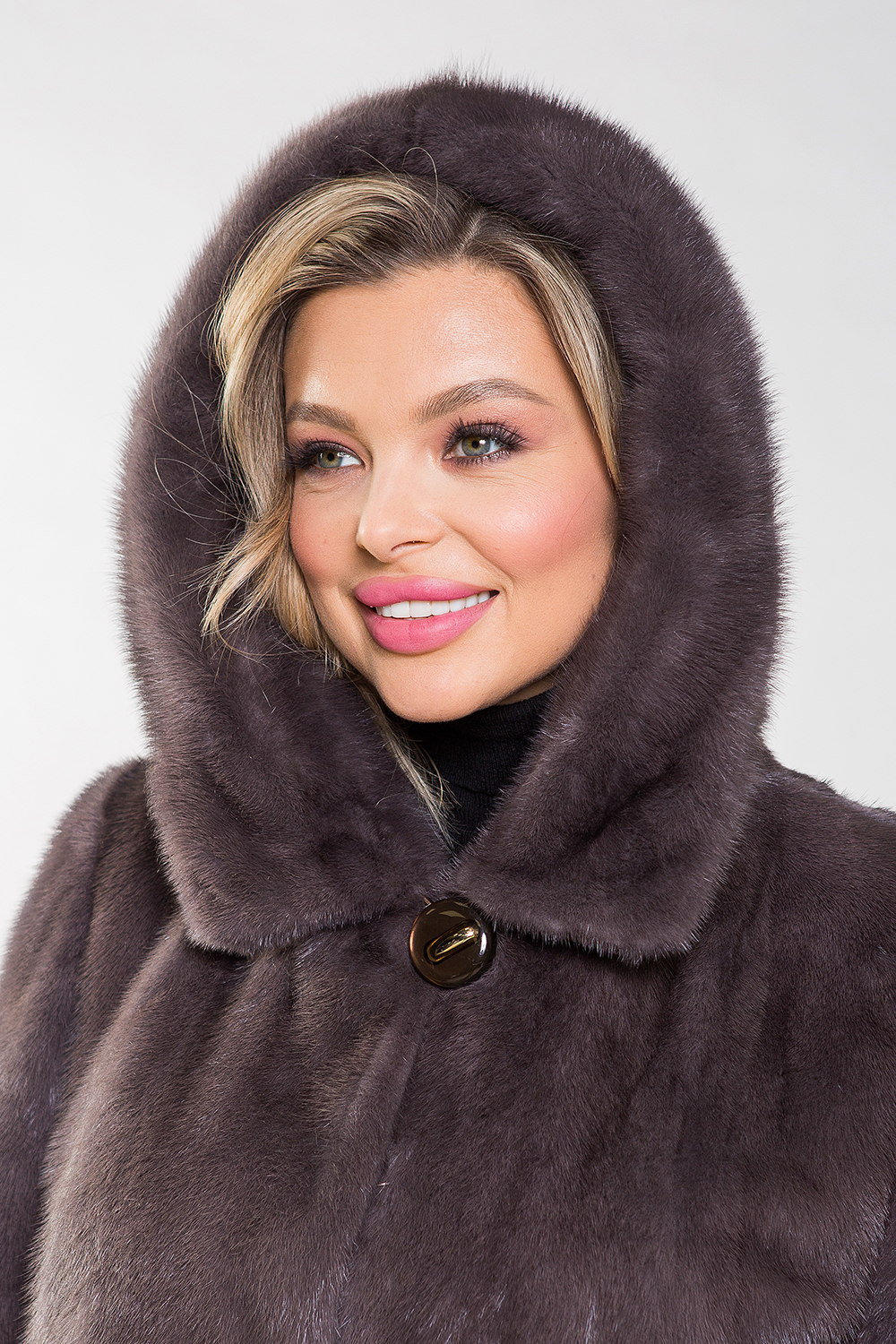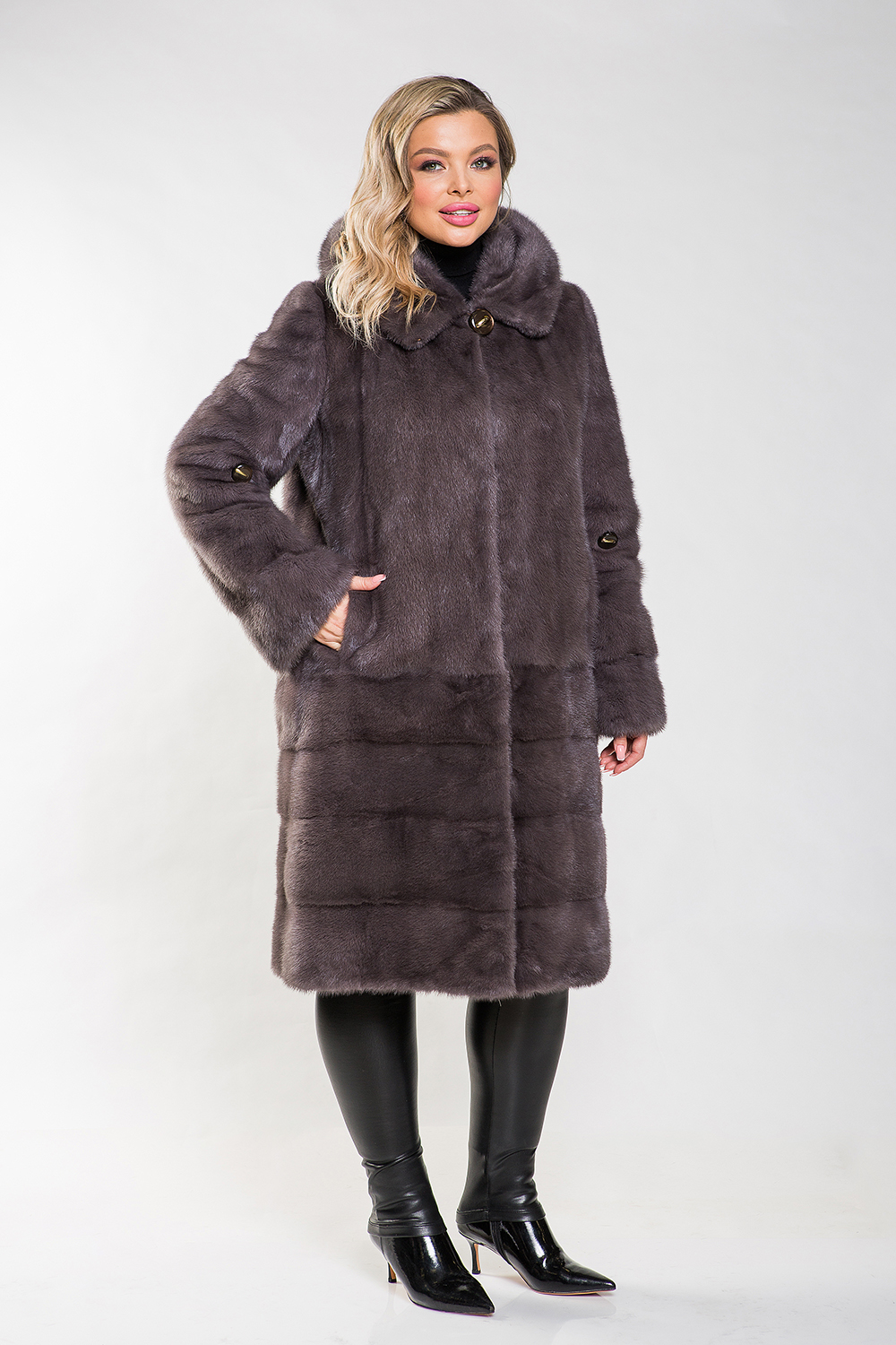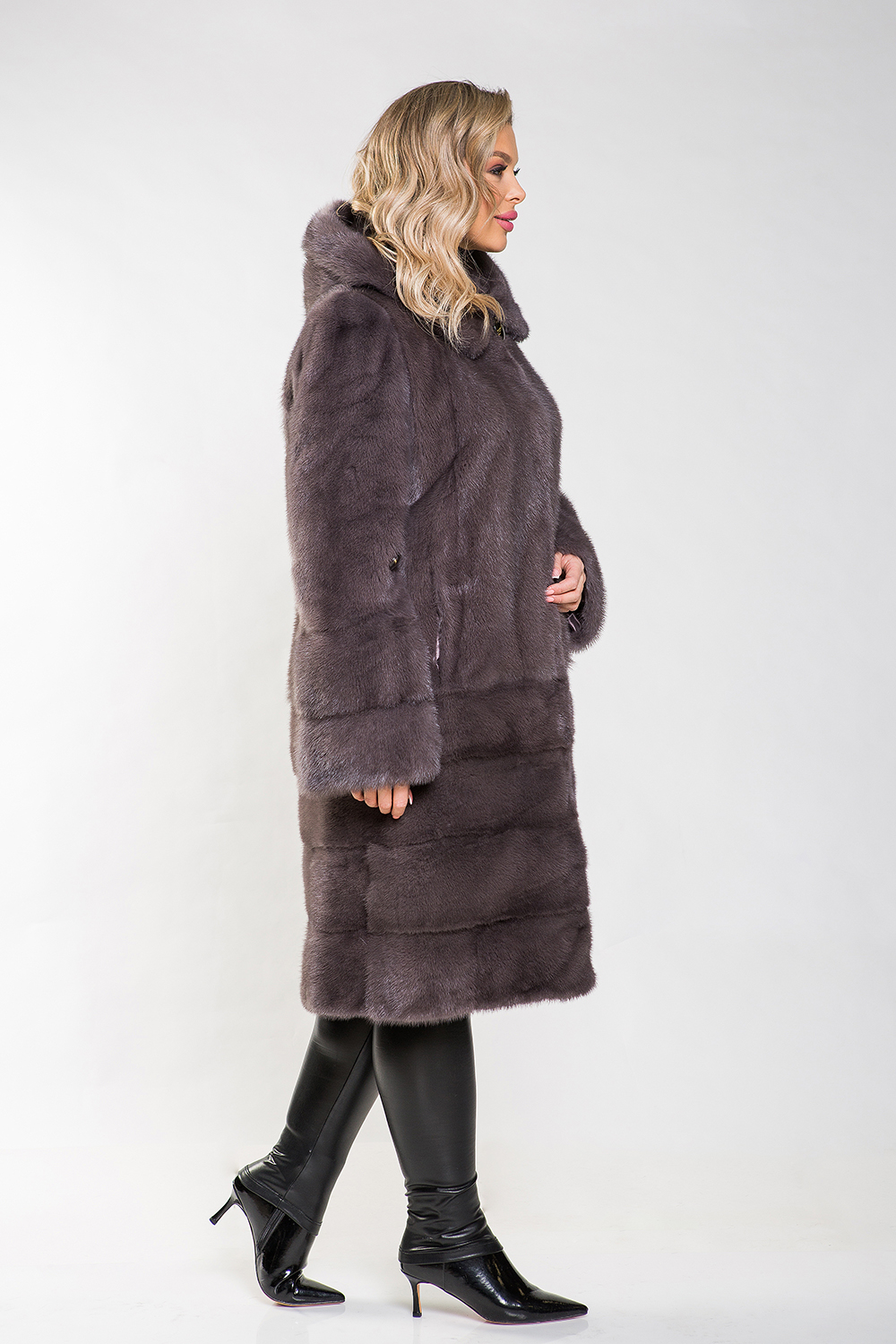 Полупальто из норки с капюшоном — модель, отличающаяся оригинальным кроем: верх выполнен в виде роспуска, а низ — из поперечно выложенных пластин. Это меховое пальто оснащено регулируемыми утяжками на талии и рукавах, что делает его универсальным и подходящим для любой фигуры.