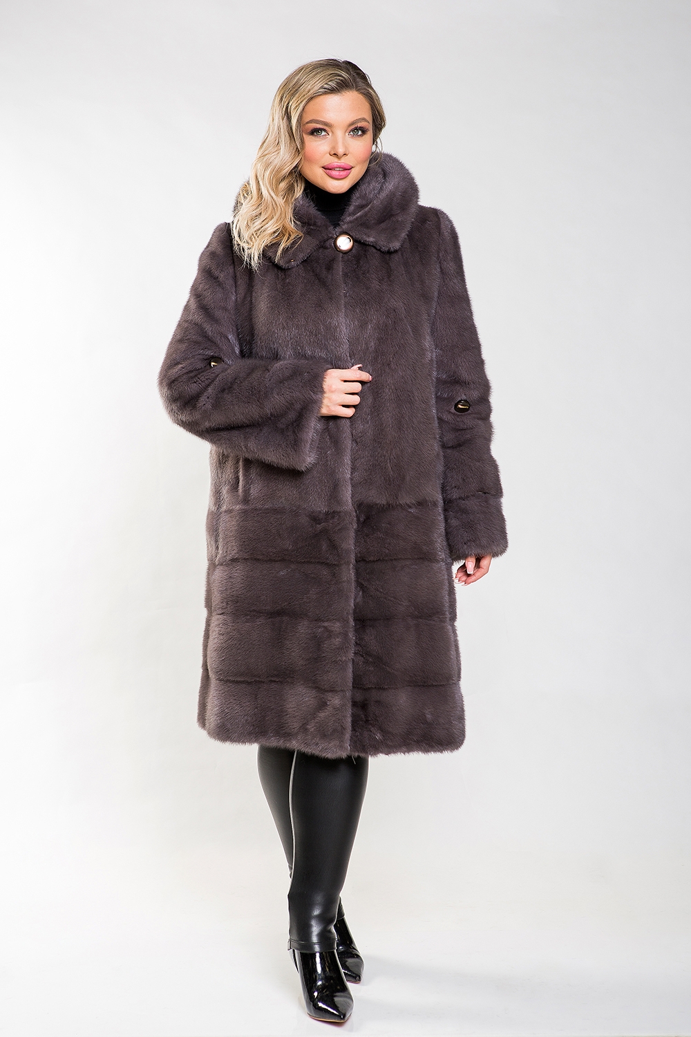 Длина изделия составляет 110 см, а рукава можно укоротить, что обеспечивает дополнительный комфорт в носке. Удобная конструкция шубки гарантирует удобство и свободу движений, а благородный оттенок муссона создает гармоничный образ.