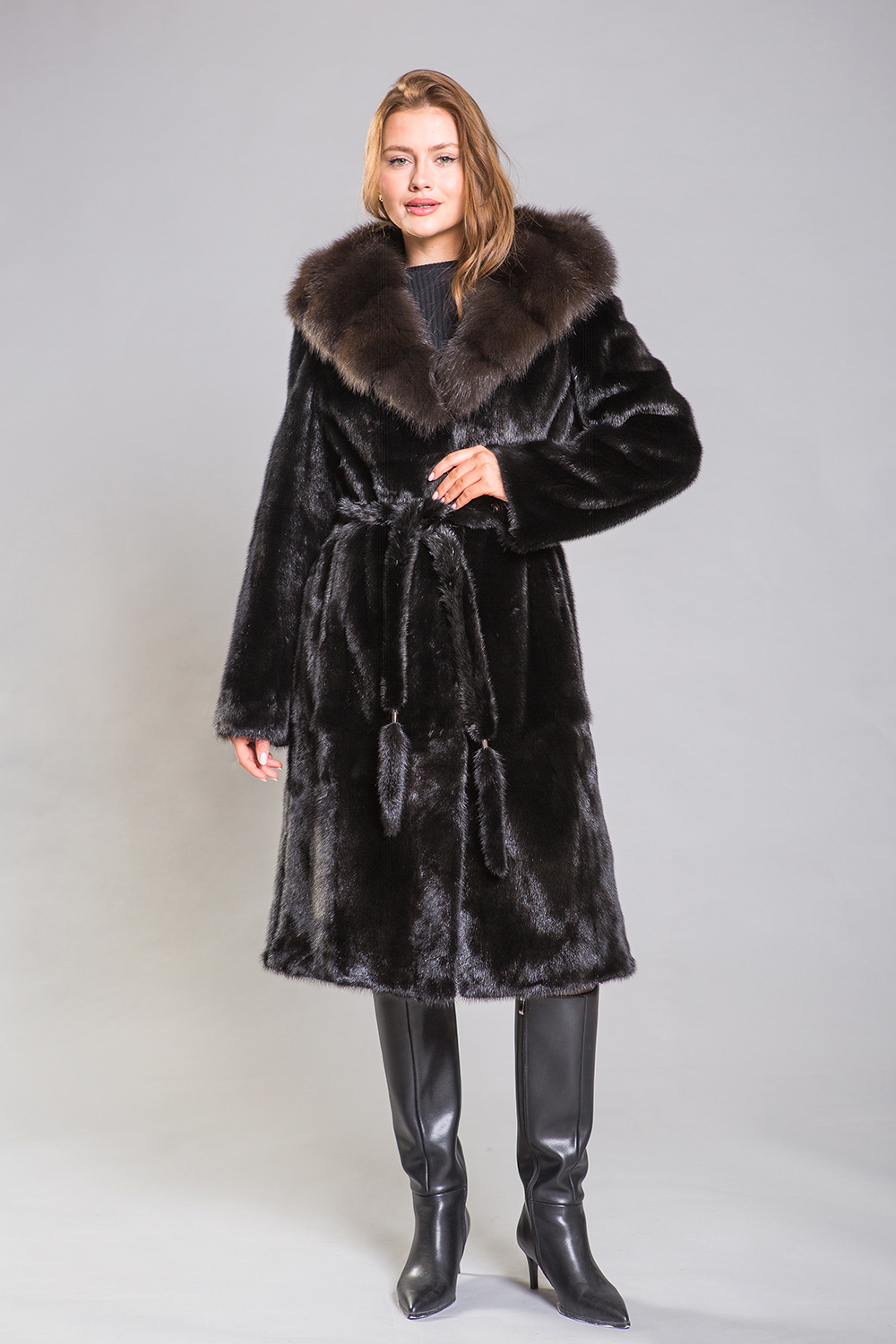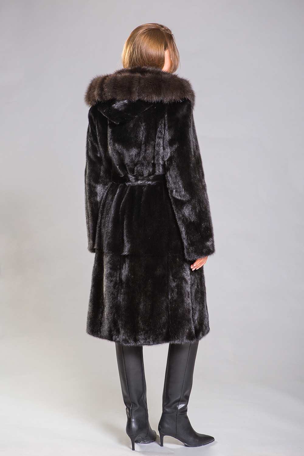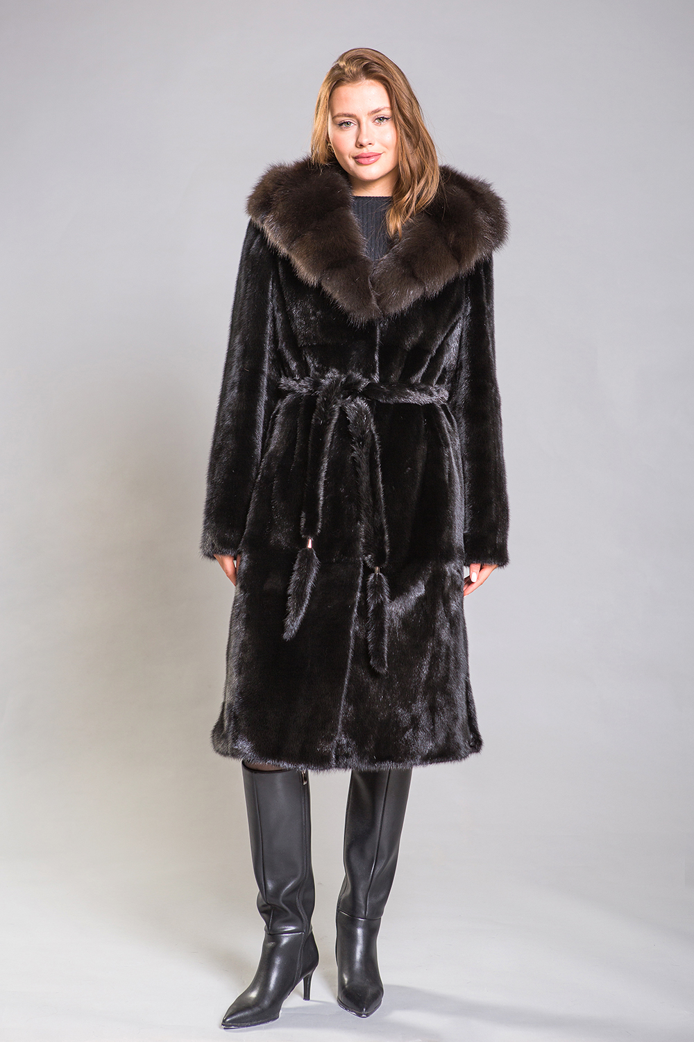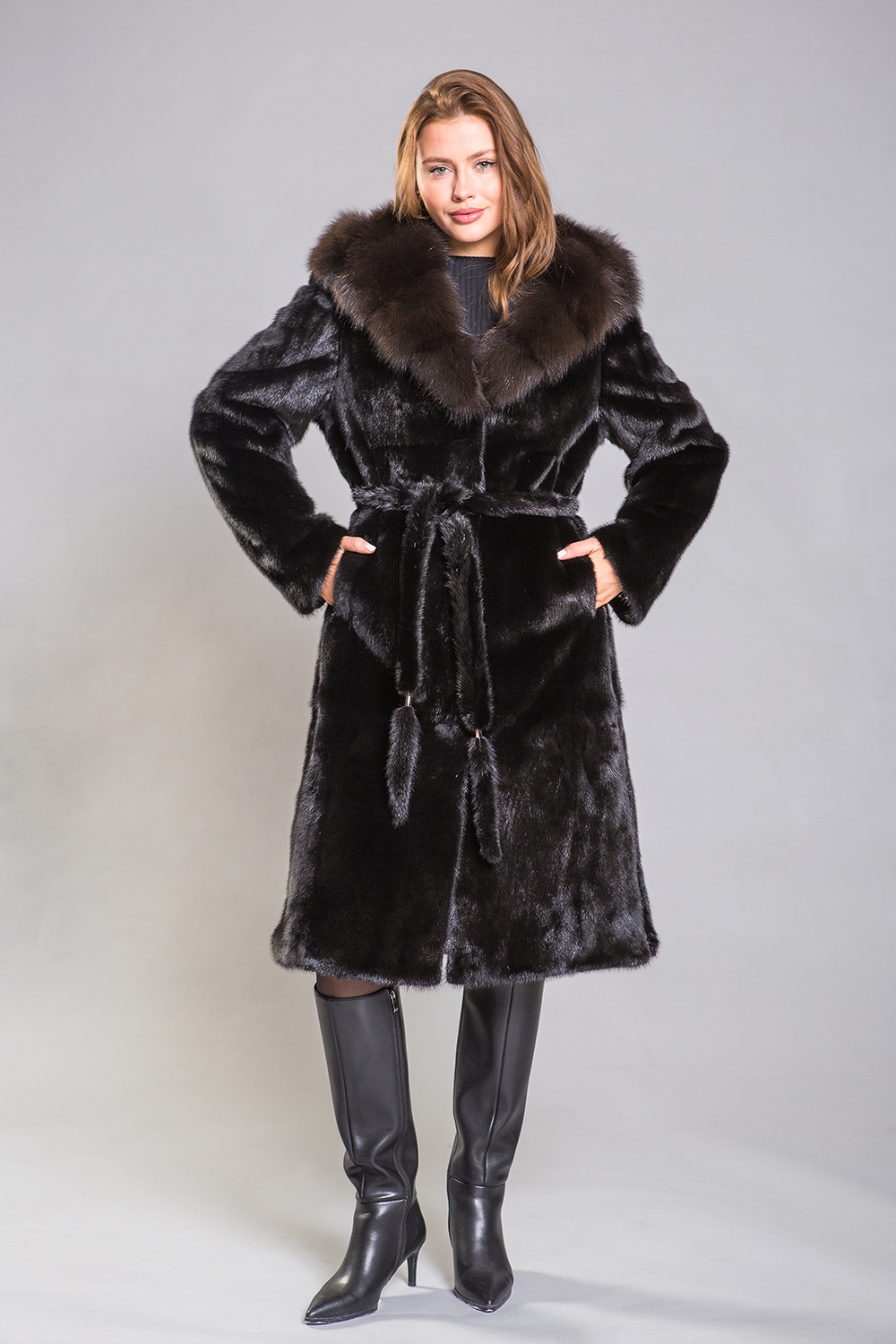 Длина полупальто составляет 110 сантиметров. Меховой пояс подчеркивает стройность и элегантность силуэта, создавая утонченный образ. Эта шубка прекрасно впишется в строгий классический стиль, а её изюминкой являются разрезы по бокам, которые добавляют особый шарм.