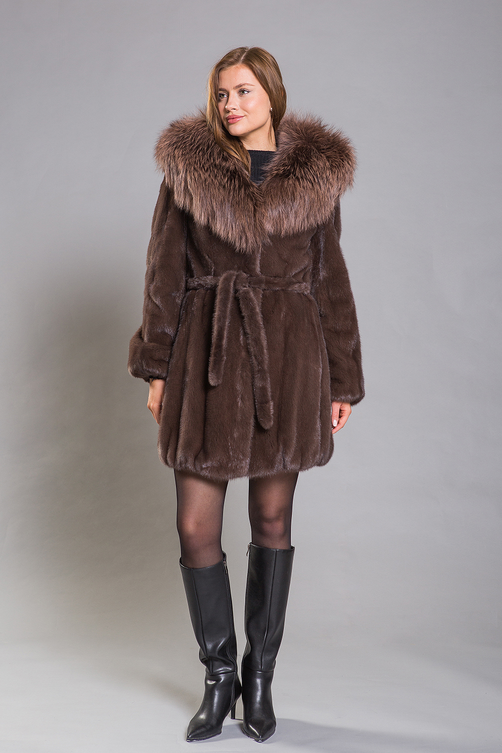 Меховой пояс не только подчеркивает талию, но и придает стройность фигуре. Эта миниатюрная шубка выглядит невероятно эффектно благодаря великолепному капюшону из лисы, который вносит нотки шика и гламура в зимний образ. Создайте себе комфортный и стильный зимний look!