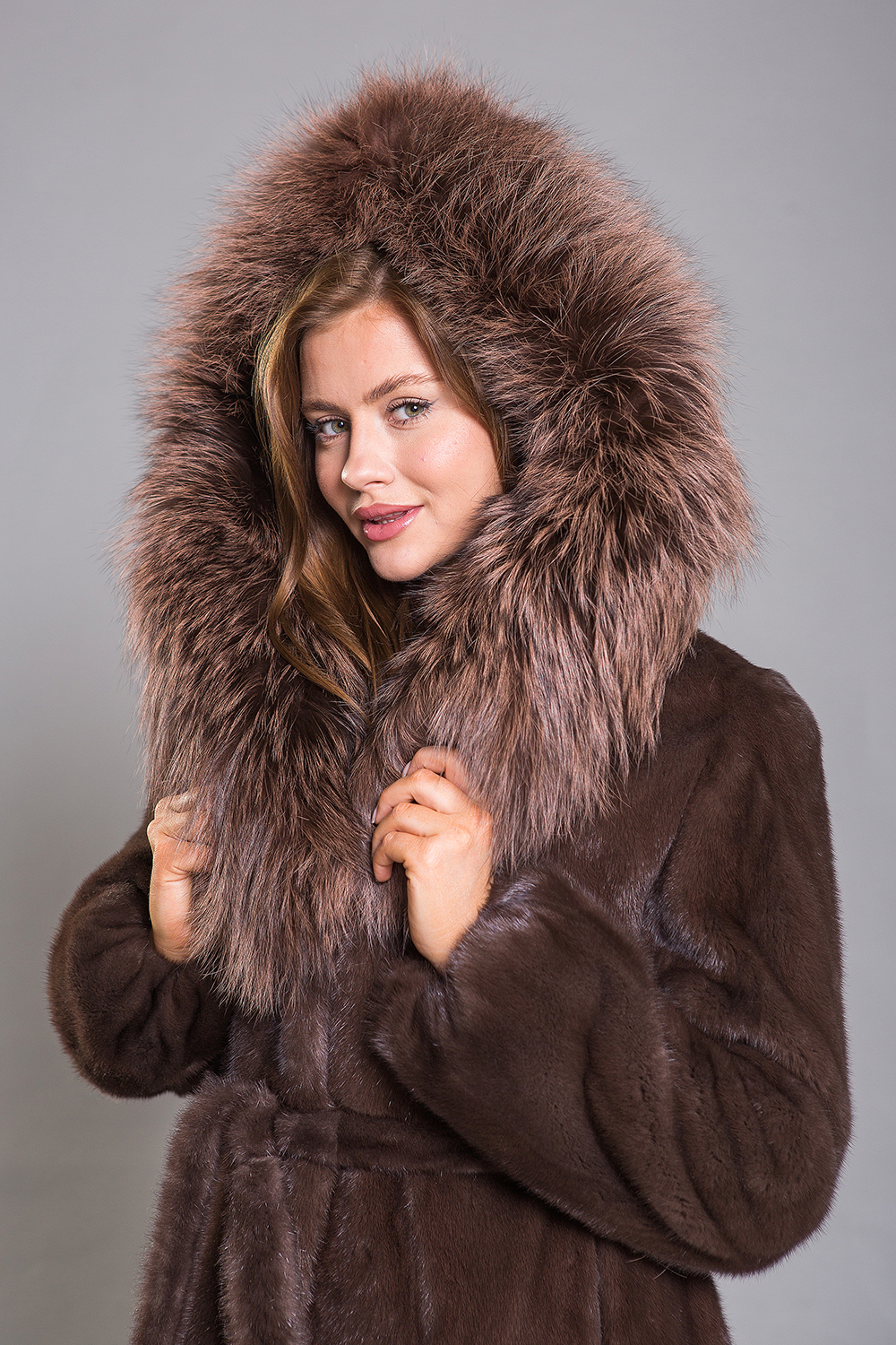 Полупальто, выполненное из меха норки, отличается роскошным капюшоном, украшенным мехом тонированной лисы. Крой изделия представляет собой роспуск с добавлением пластин, что создает слегка присборенную к низу модель. Длина пальто составляет 90 см.