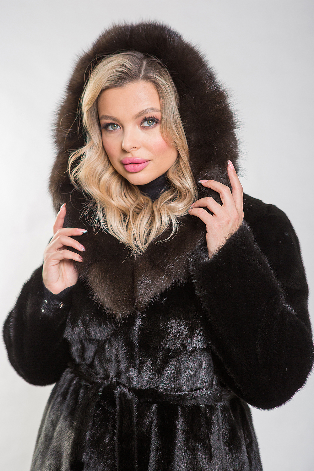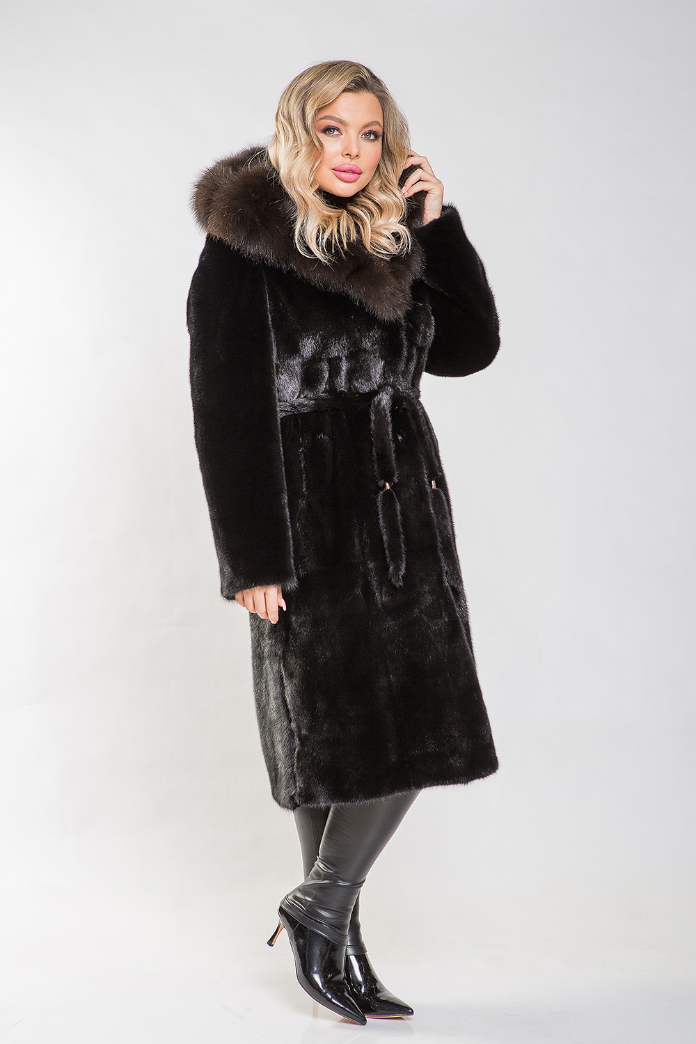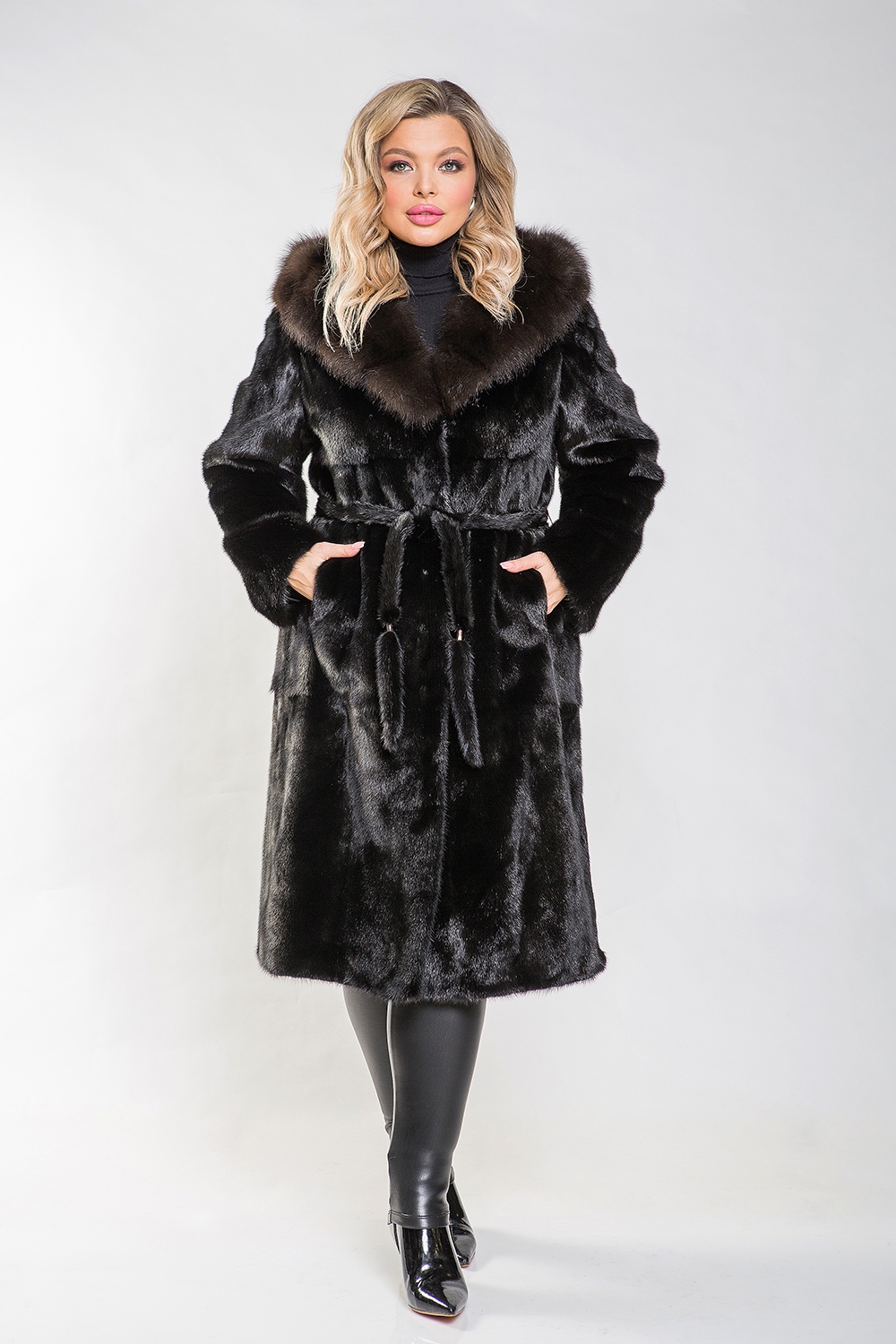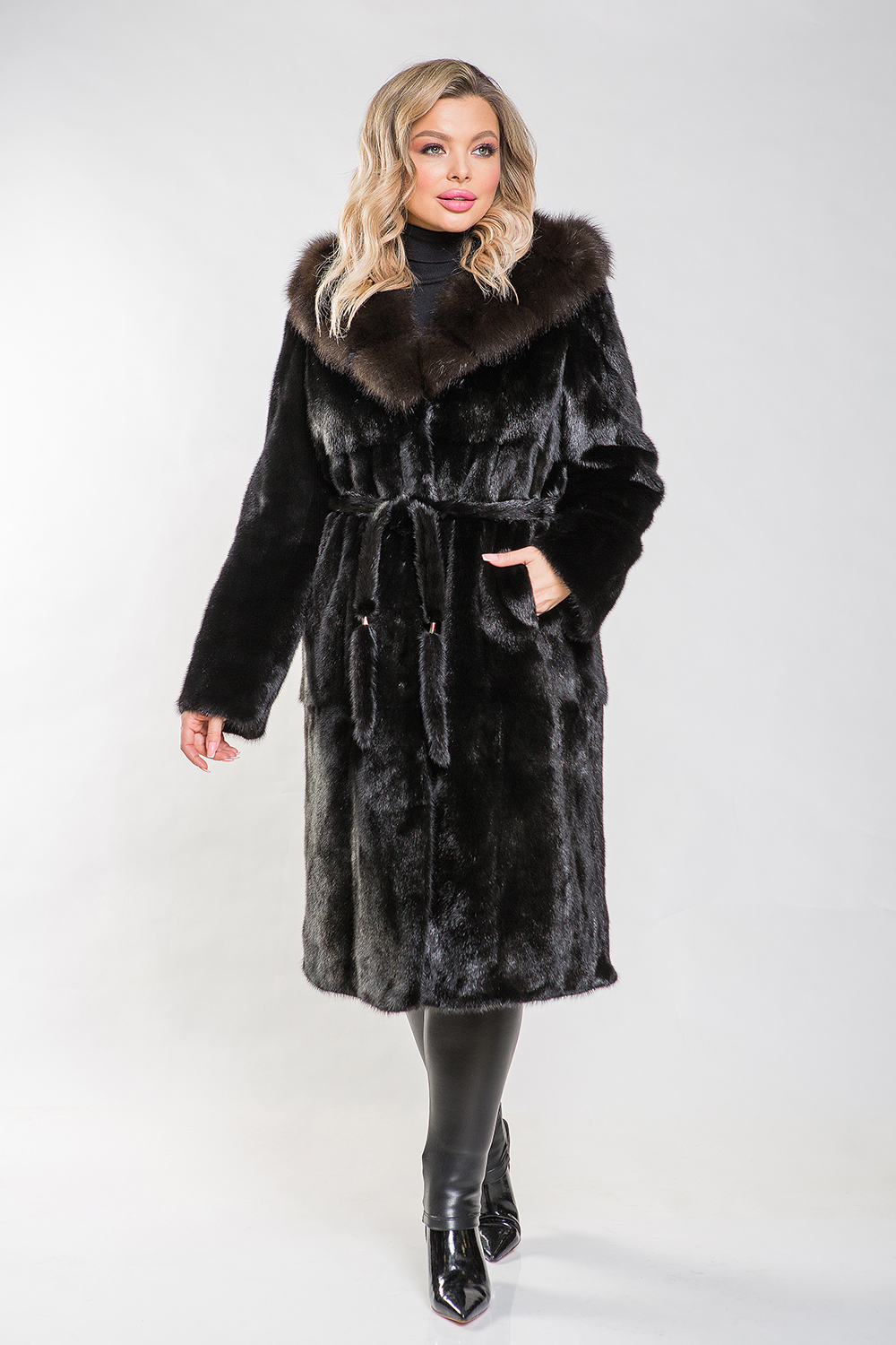 Полупальто, выполненное из меха норки, дополнено капюшоном, украшенным мехом куницы, который искусно имитирует благородный цвет соболя. Модель кроится из пластин с роспуском, что обеспечивает её гибкость и удобство. Рукава оснащены регулирующими утяжками. Длина модели составляет 110 см. Меховой пояс позволяет подчеркнуть стройность и элегантность силуэта. Шубка прекрасно впишется в строгий классический стиль, а её изюминкой являются разрезы по бокам, придающие образу особый шарм. Если вы хотите выглядеть роскошно и по-королевски, то натуральная норковая шубка с великолепным декором из куницы станет вашим идеальным выбором!