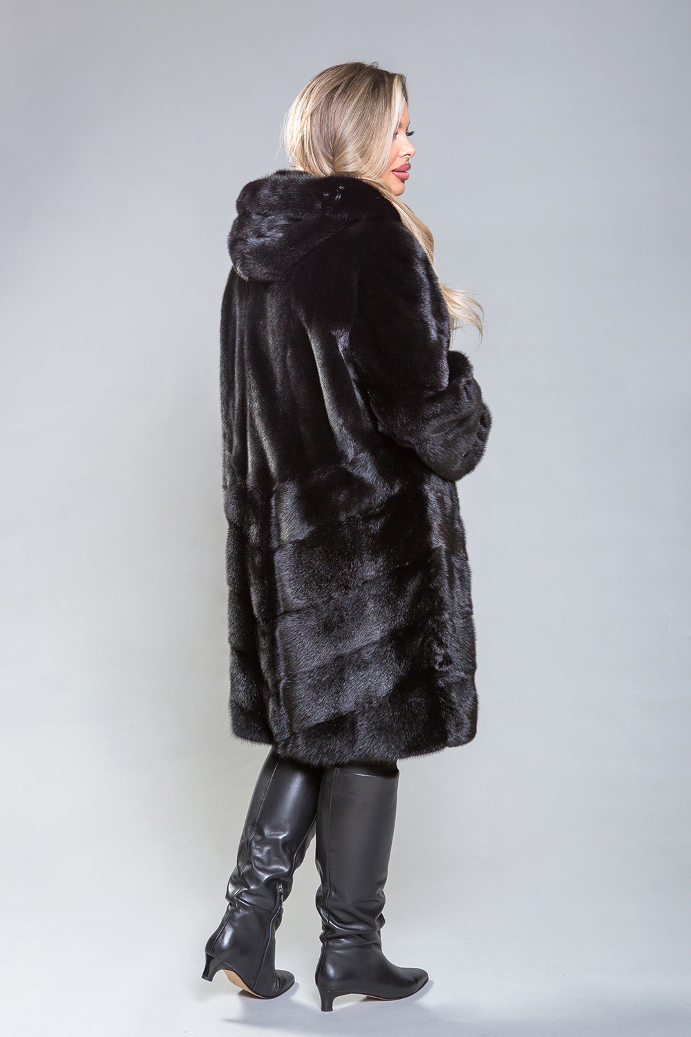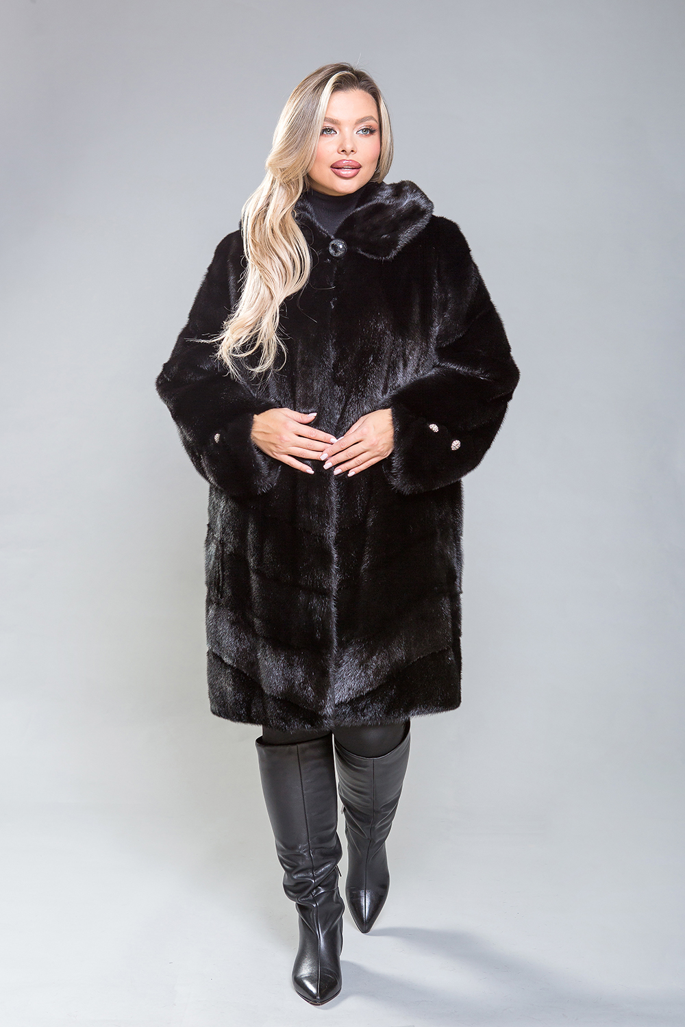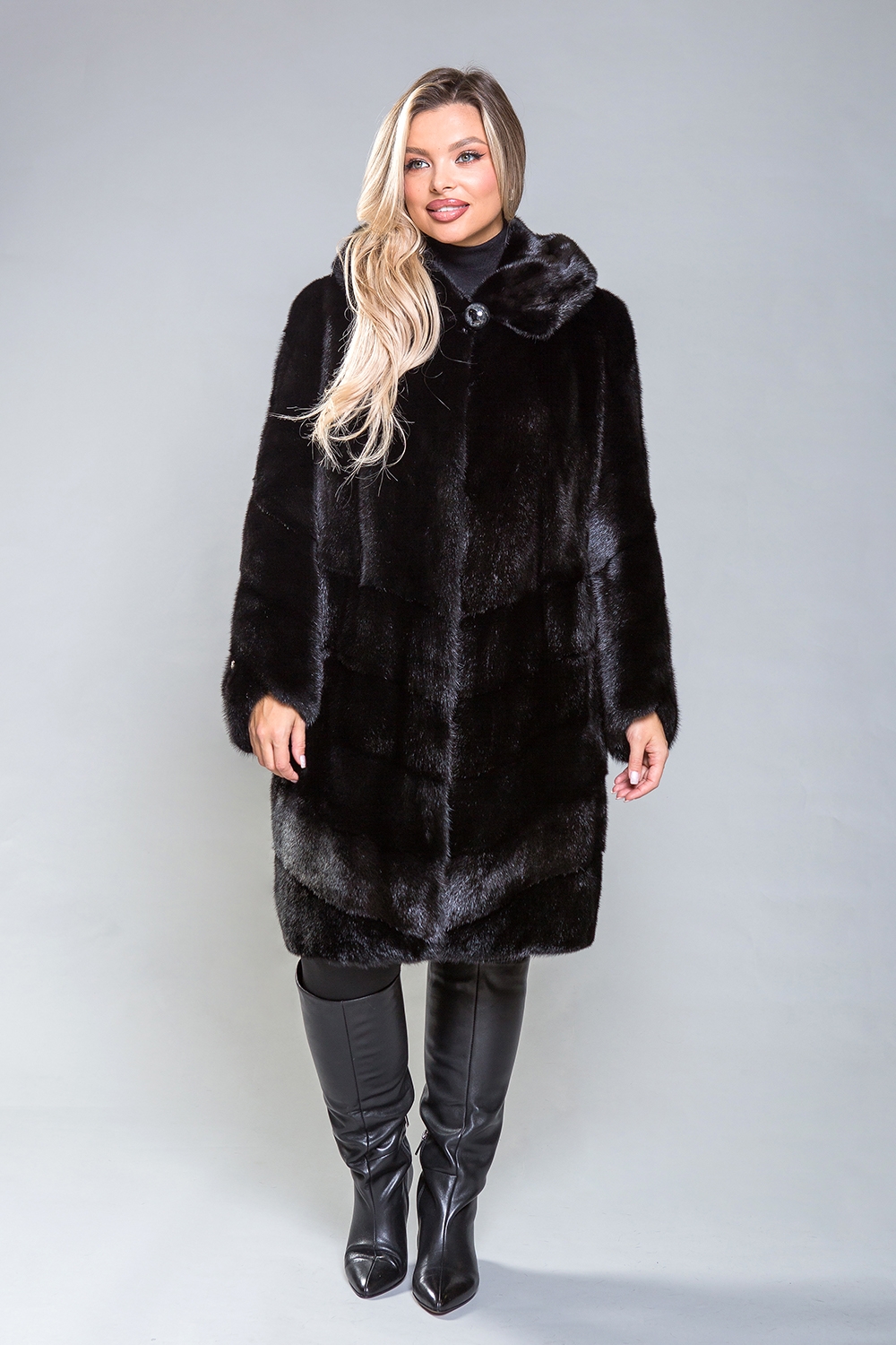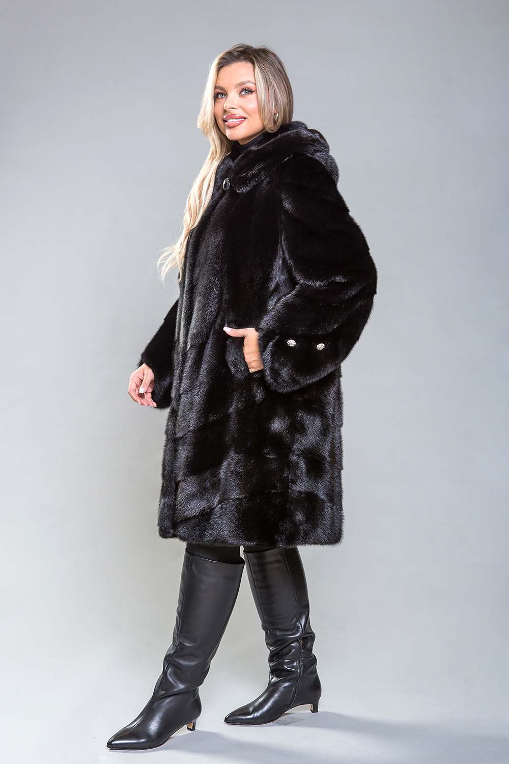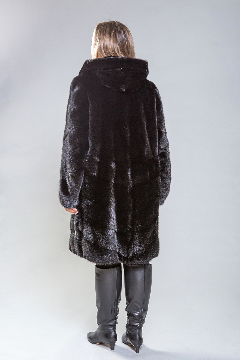 Полупальто из меха норки с капюшоном, выполненное в оригинальном стиле. Верхняя часть модели изготовлена по технике роспуска, в то время как низ и рукава состоят из диагонально расположенных пластин. Полупальто снабжено регулируемыми утяжками, которые позволяют подстроить его по талии, рукавам и низу. Декоративные пуговицы на рукавах можно снять, если это необходимо. Длина изделия составляет 100 см. Благодаря небольшому весу, полупальто обеспечивает тепло и комфорт в любую погоду, сохраняя свою красоту на протяжении многих сезонов.