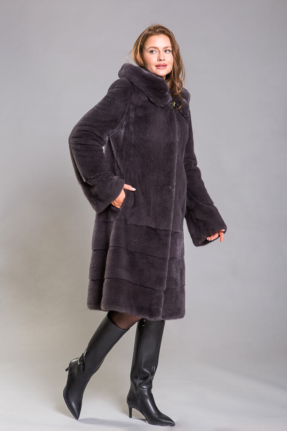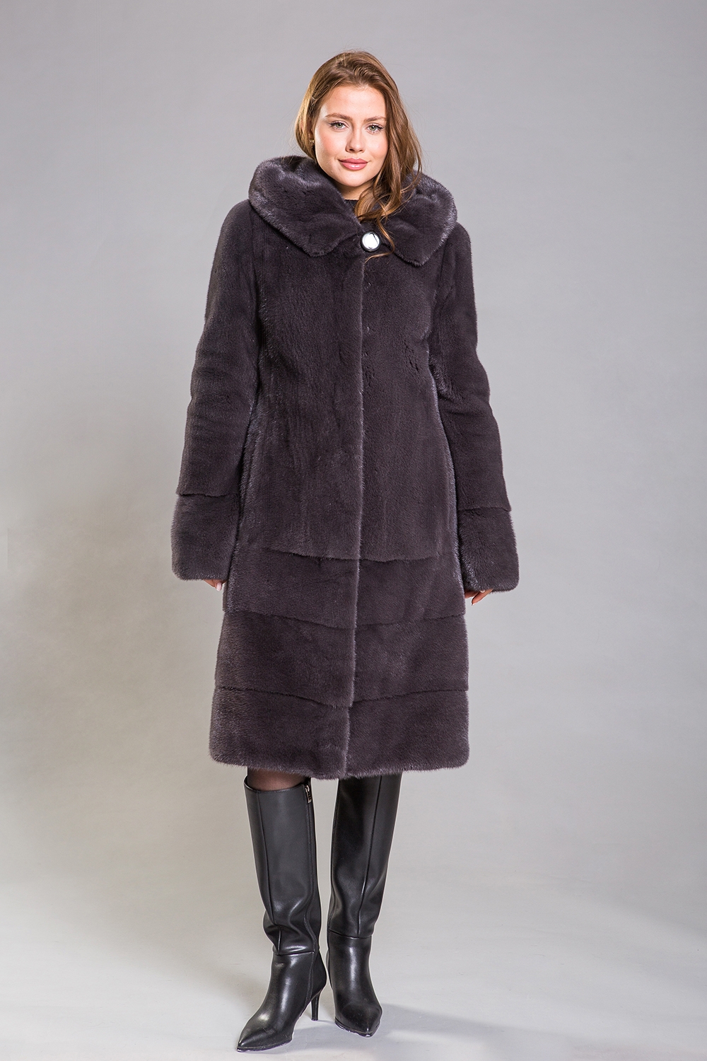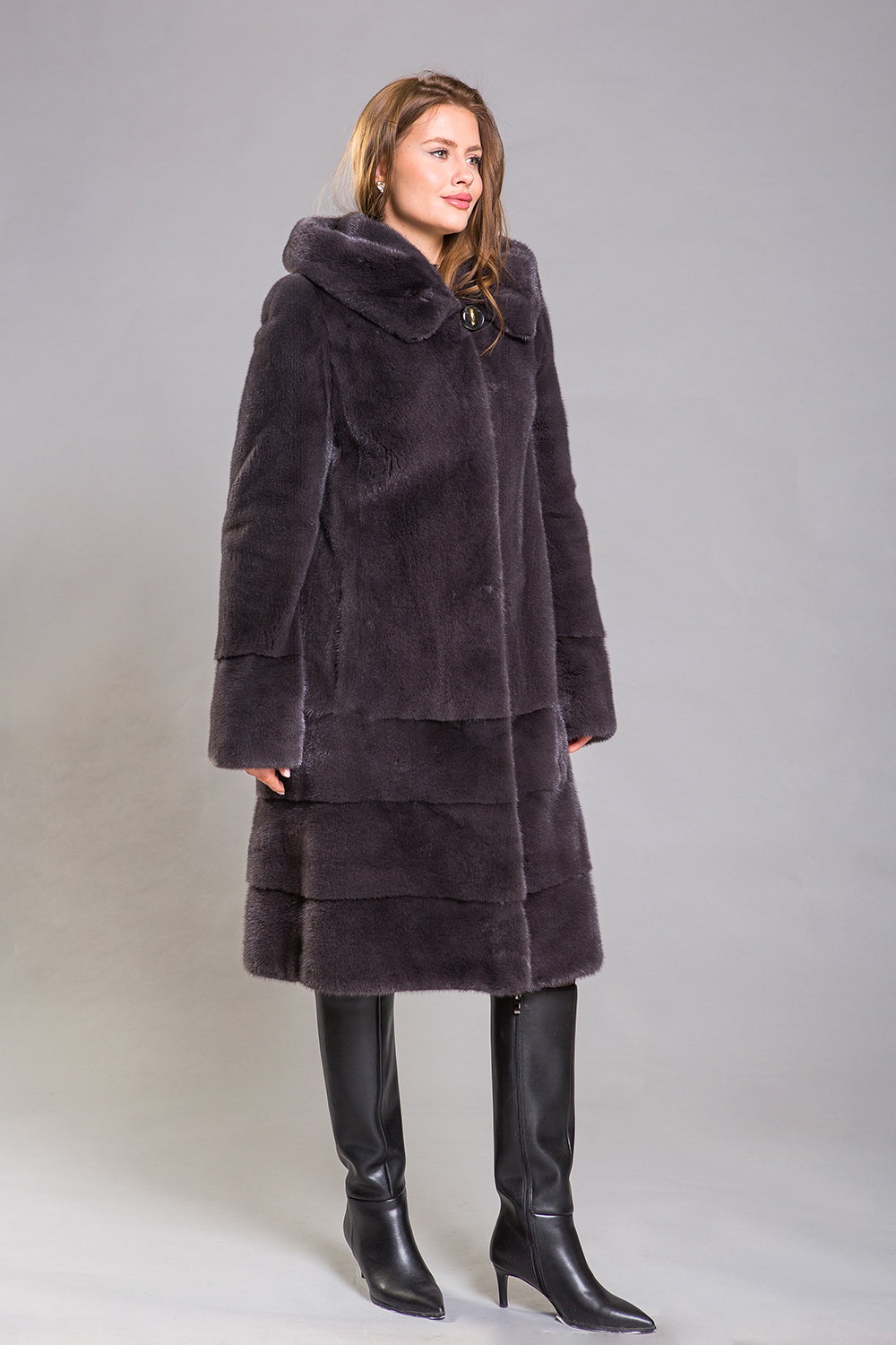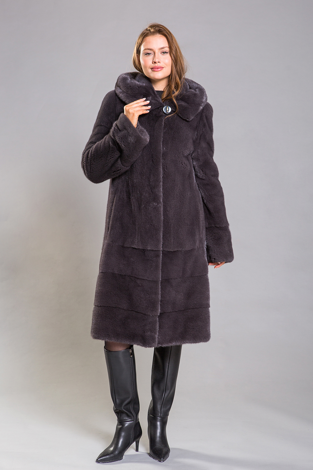 Длина полупальто составляет 110 сантиметров, а рукава можно сделать более укороченными. Благодаря удобному крою шубка обеспечивает максимальный комфорт, а благородный оттенок муссона придаёт образу безупречную гармонию.