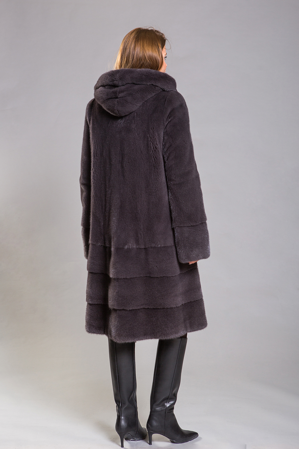 Полупальто из норки с капюшоном — это модель комбинированного кроя, в которой верхняя часть выполнена в технике «роспуск», а низ — с помощью поперечной выкладки пластин. Для создания индивидуального образа предусмотрены регулируемые утяжки на талии.